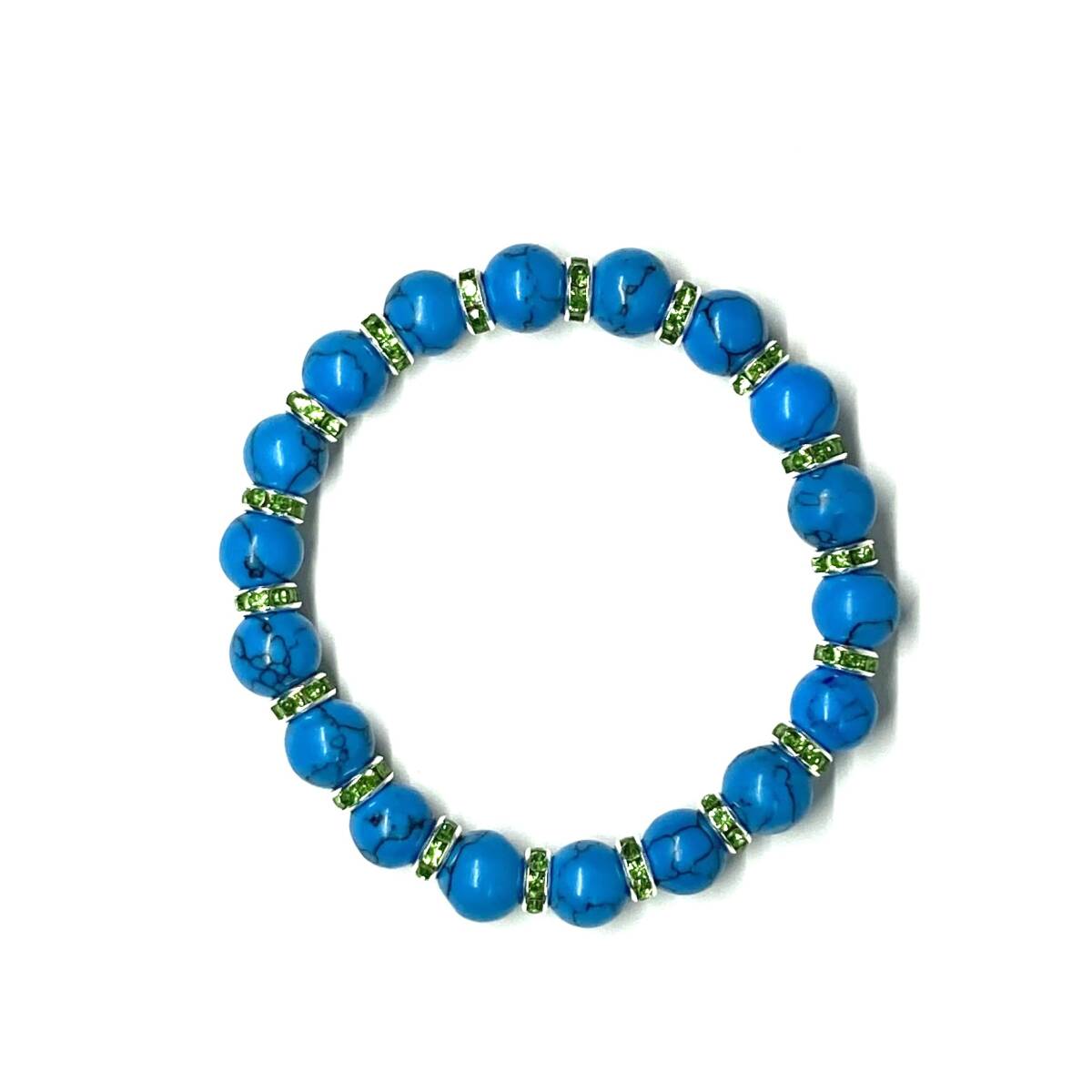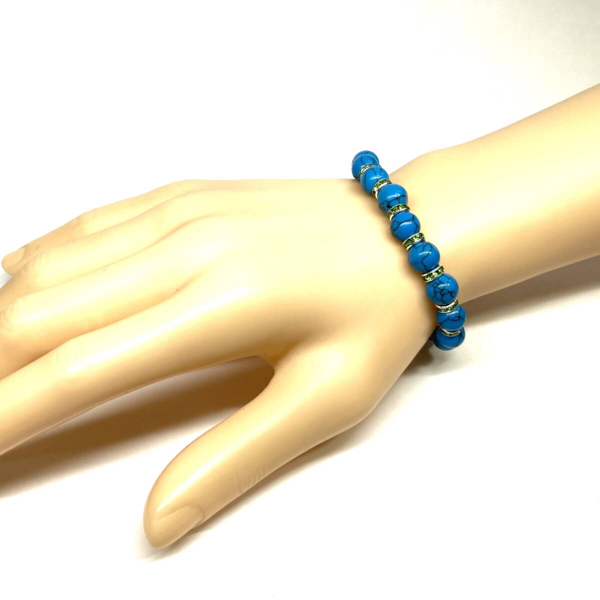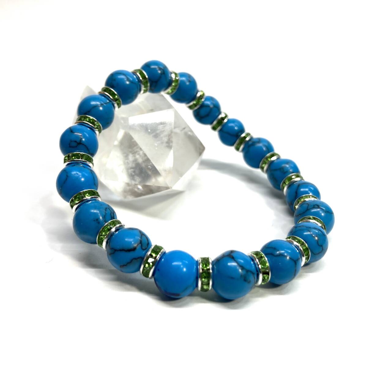 こちらは、ターコイズの8mm玉を使用したパワーストーンブレスレットです。石との間にはロンデルを挟み高級感を演出しております。シンプルなデザインは、シーン問わずどんなコーディネートとも合わせ易いブレスレットです。サイズは内径約15cmです。当社の中でも一番人気の実績があるデザインとなっております。気になる方はお早めにどうぞ。