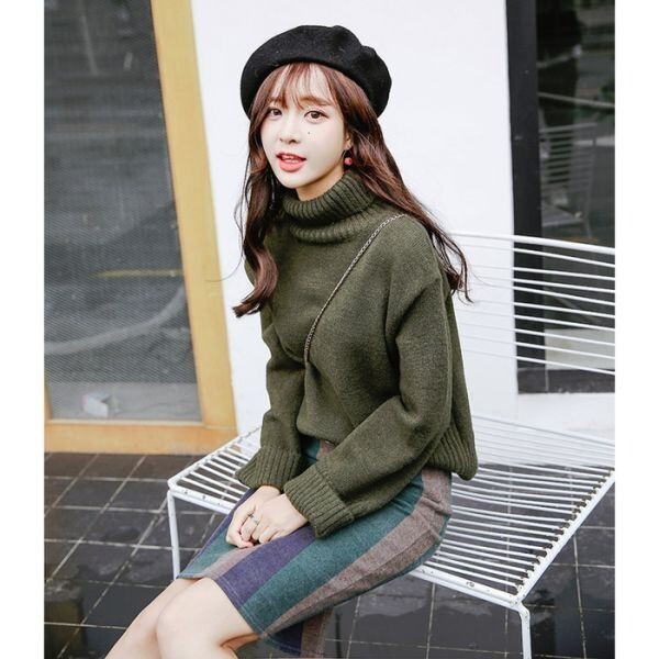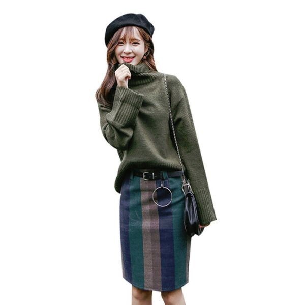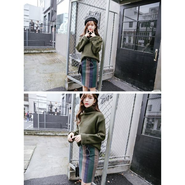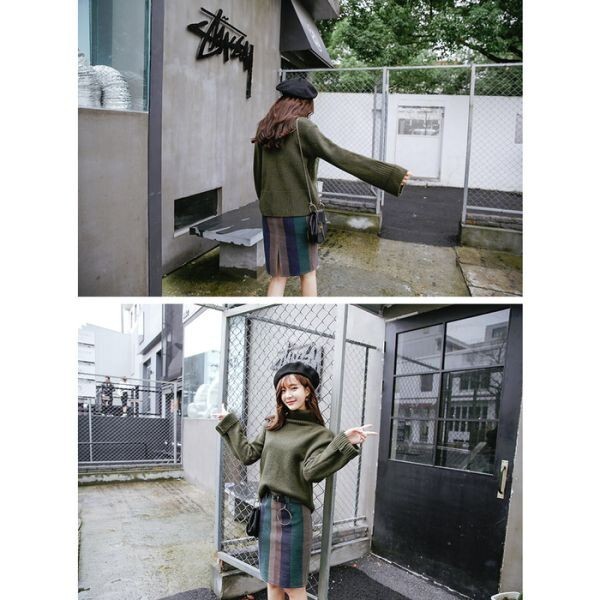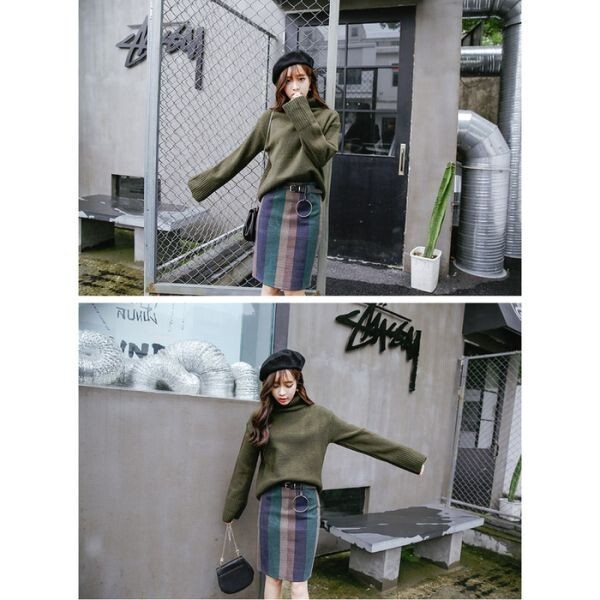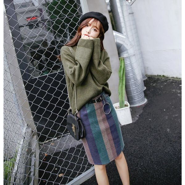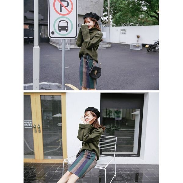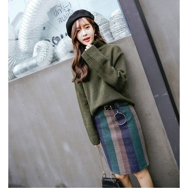 3色カラーのタイトスカート ベルト付き 膝丈 ストレッチ性生地 ストライプ柄 レディース ダークグリーン 膝上 M