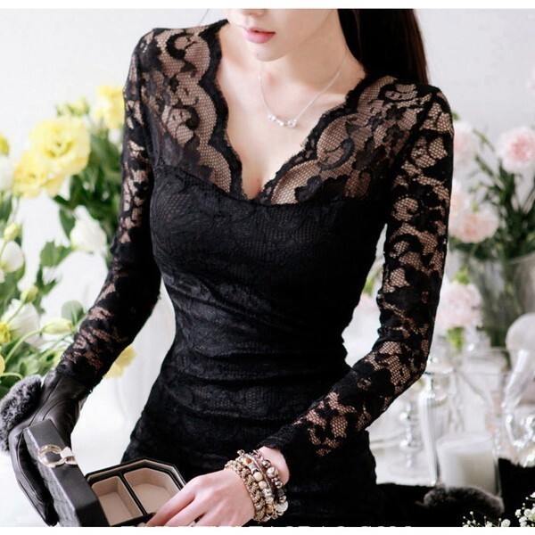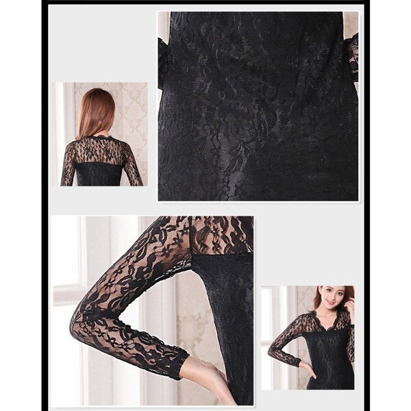 ミニドレス ショート丈 レース 長袖 ボディコン Vネック 薄い裏生地 レディース ブラック M