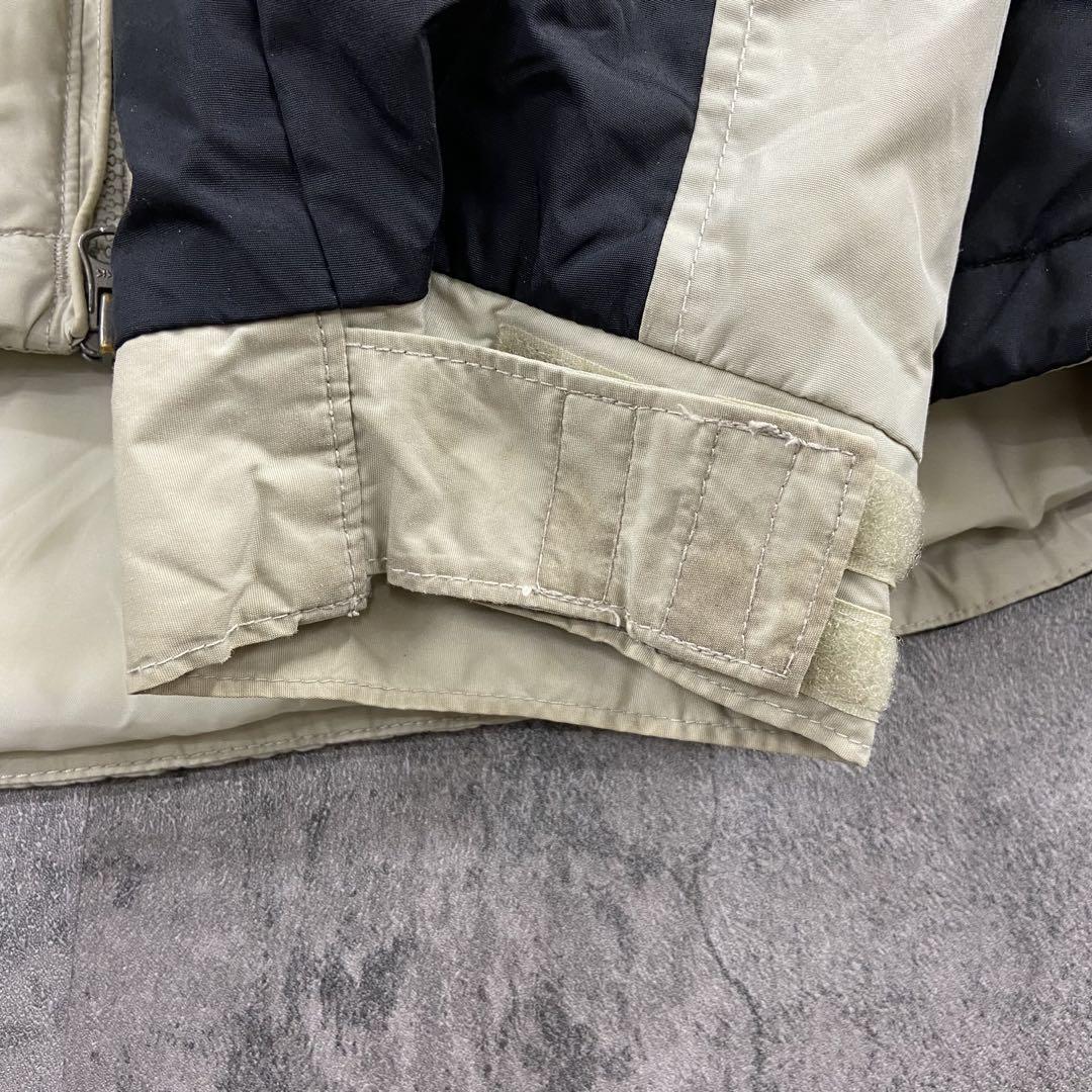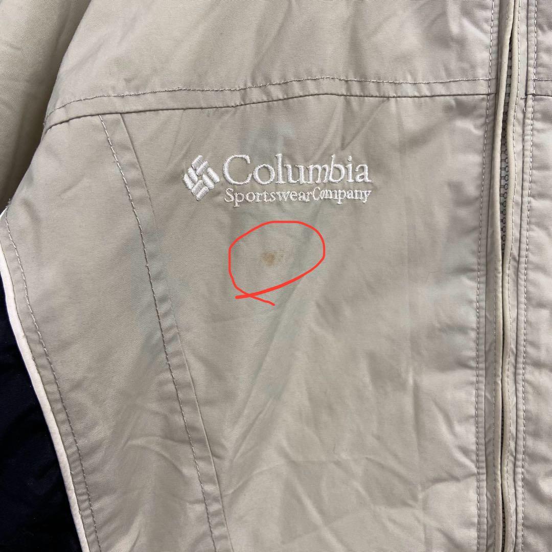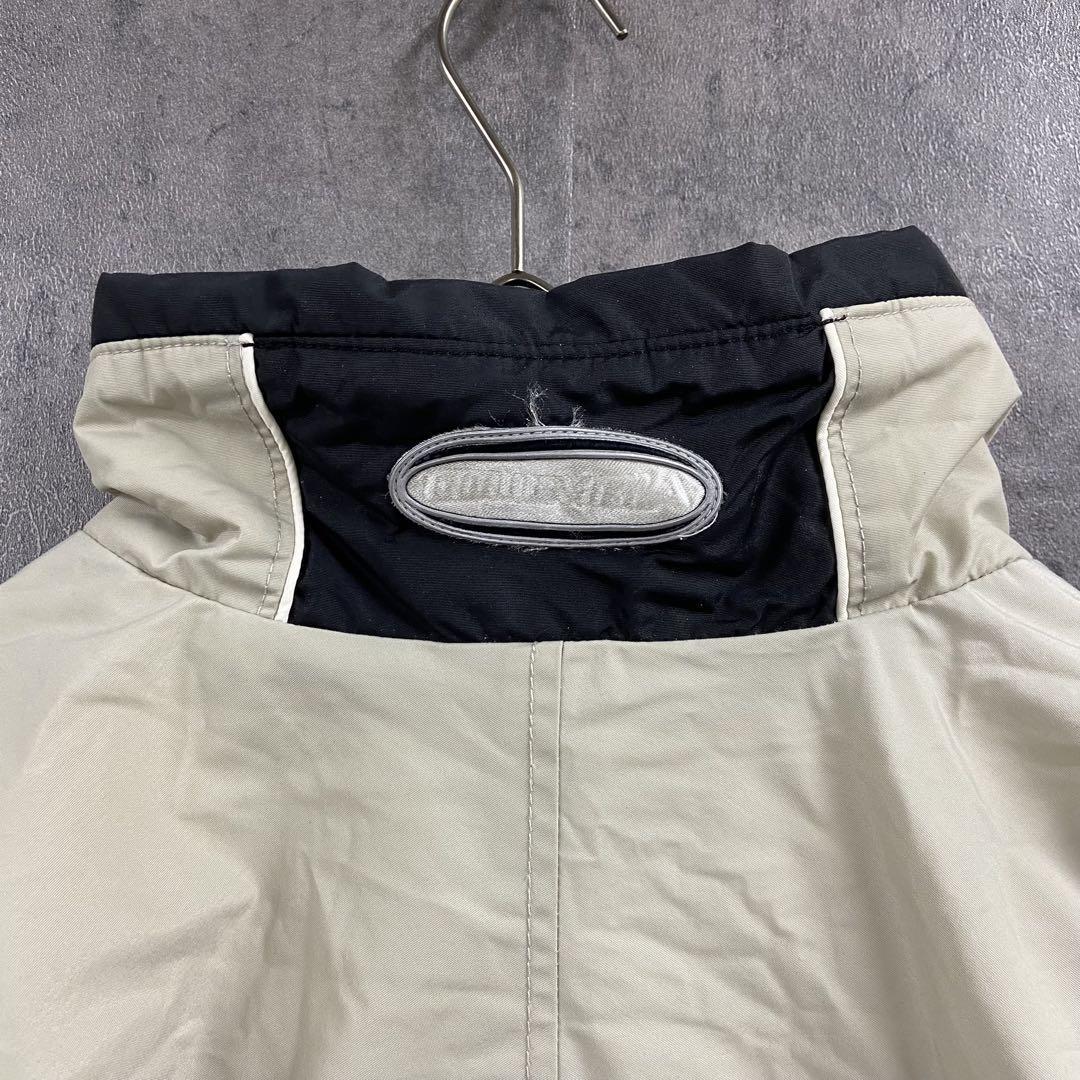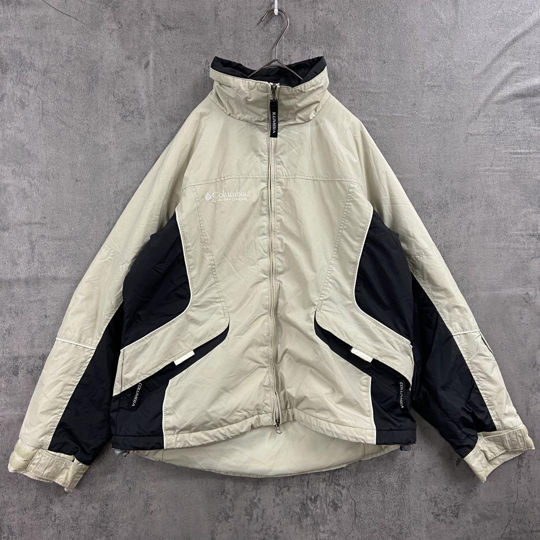 Columbiaの中綿入りナイロンジャケットです。ベージュ×ブラックの切り替えデザインに刺繍ロゴが映える一着。裏地は中綿キルティング仕様で防寒性が高く、アウトドアやタウンユースにも活躍します。袖口やフロント部分に汚れがありますが、着用に大きな問題はありません。