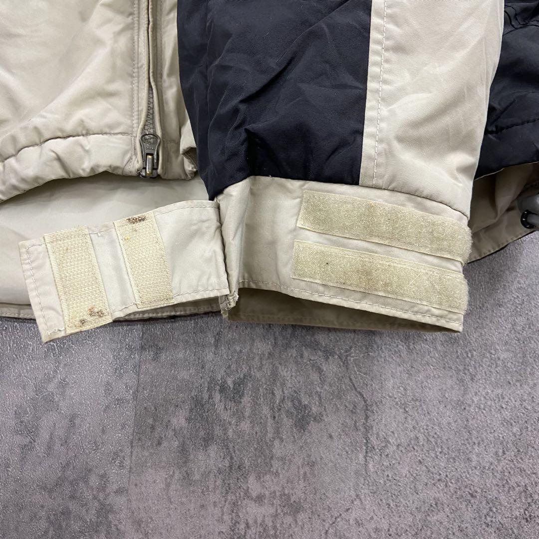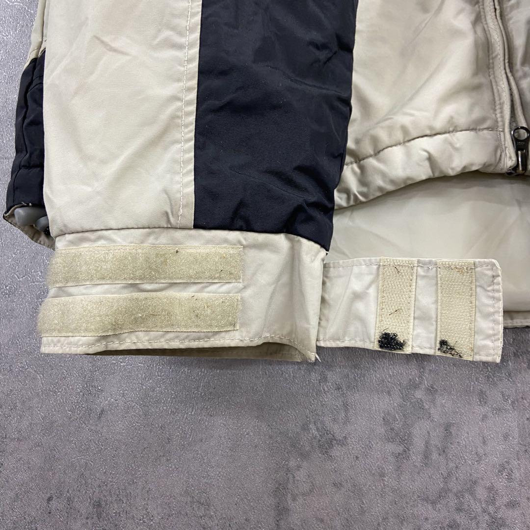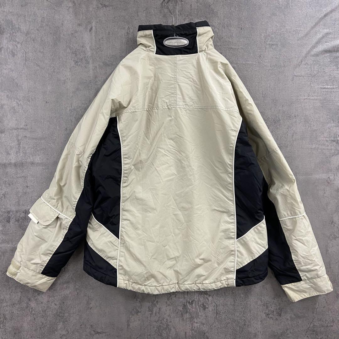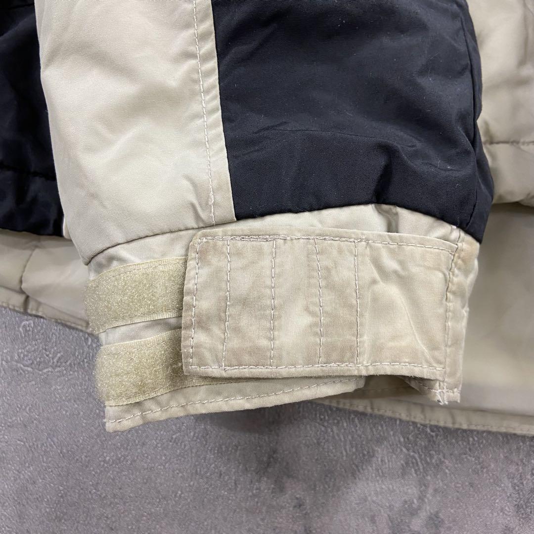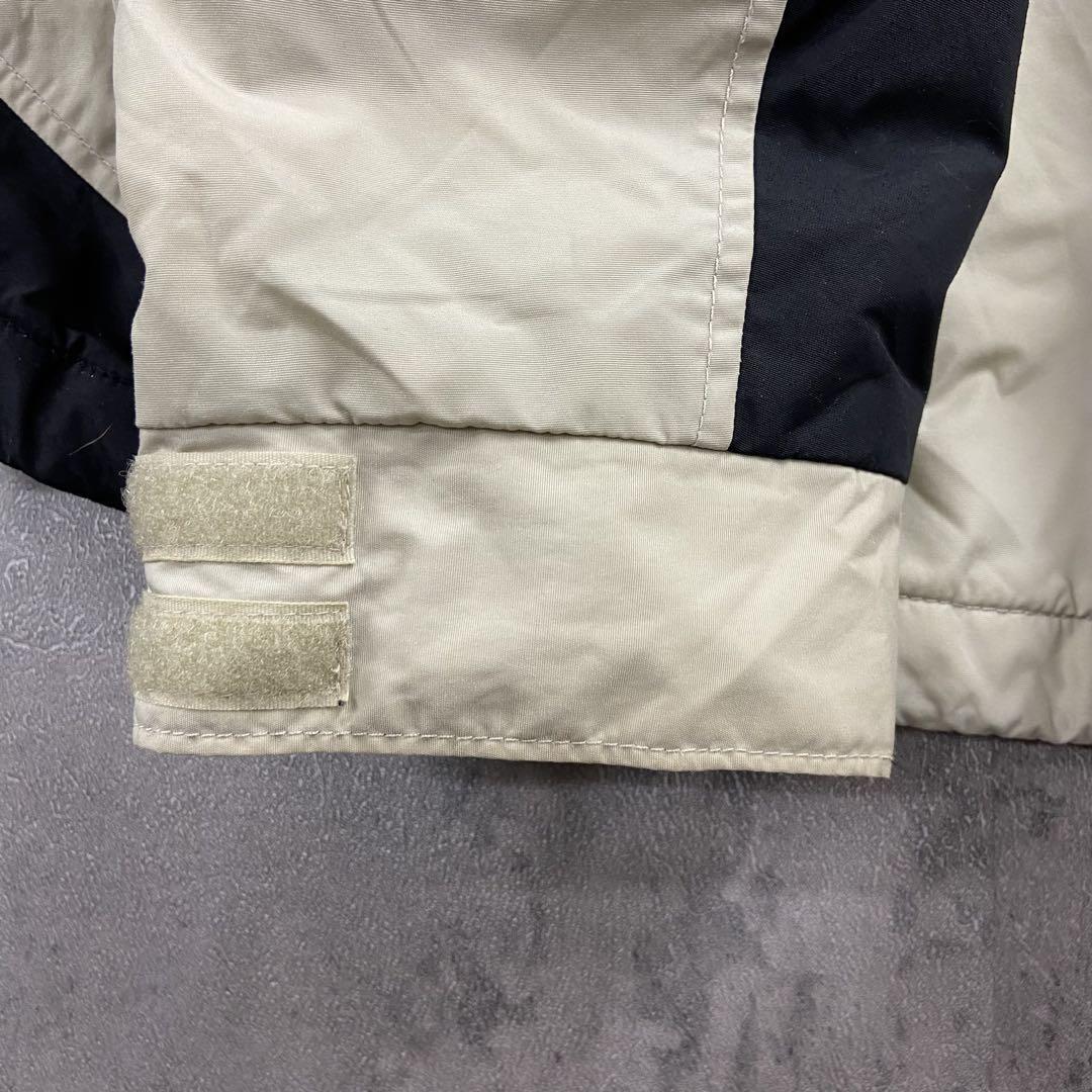 Columbiaの中綿入りナイロンジャケットです。ベージュ×ブラックの切り替えデザインに刺繍ロゴが映える一着。裏地は中綿キルティング仕様で防寒性が高く、アウトドアやタウンユースにも活躍します。袖口やフロント部分に汚れがありますが、着用に大きな問題はありません。