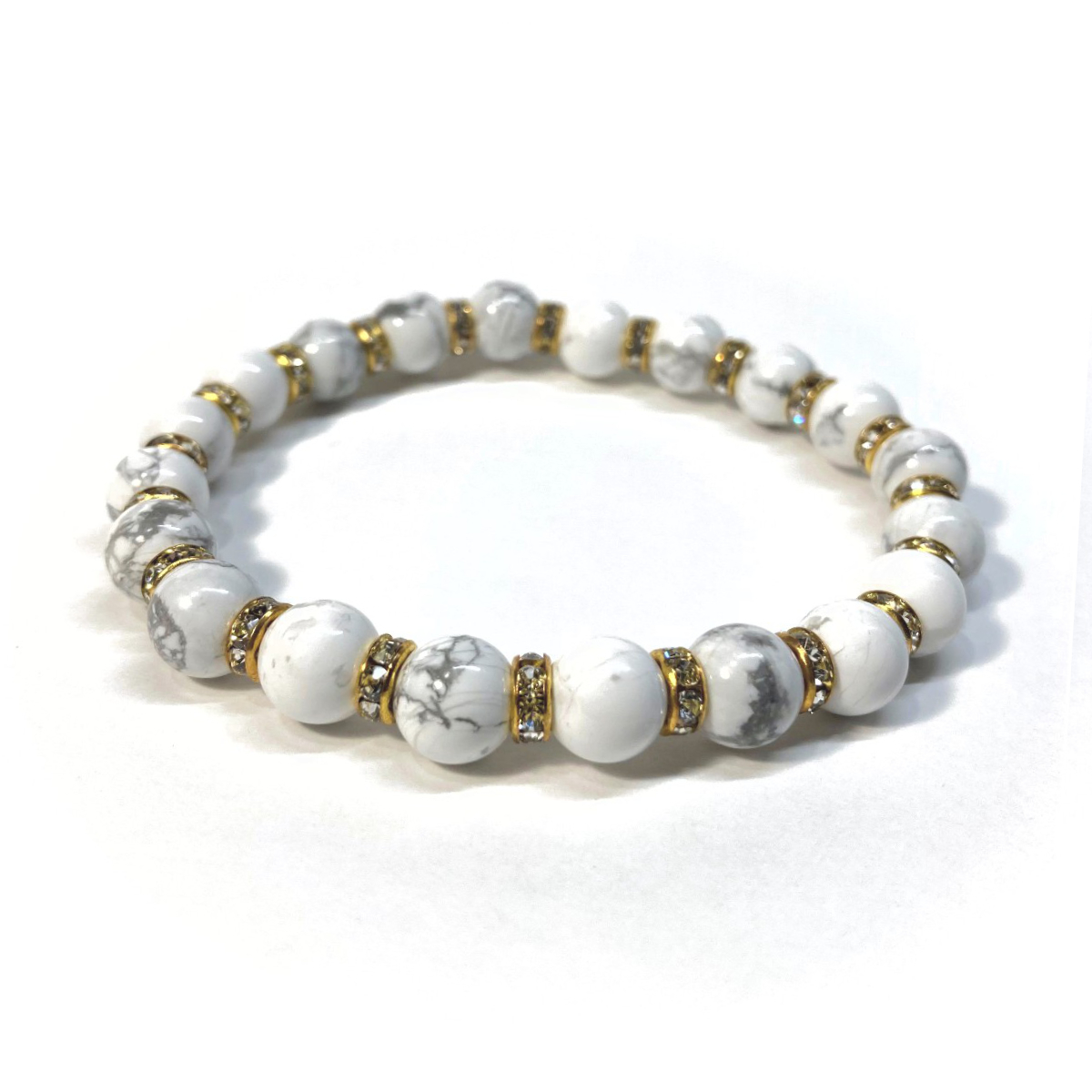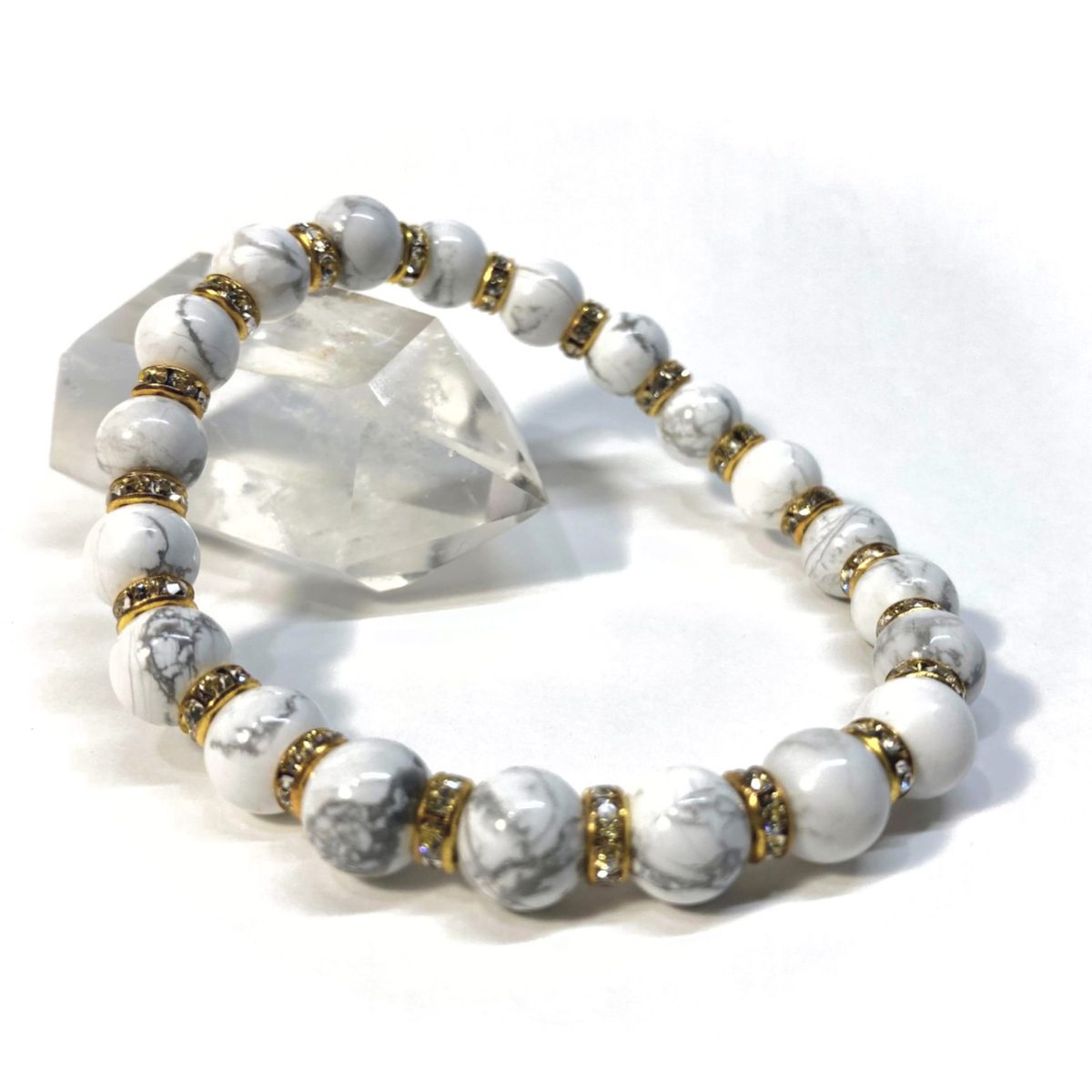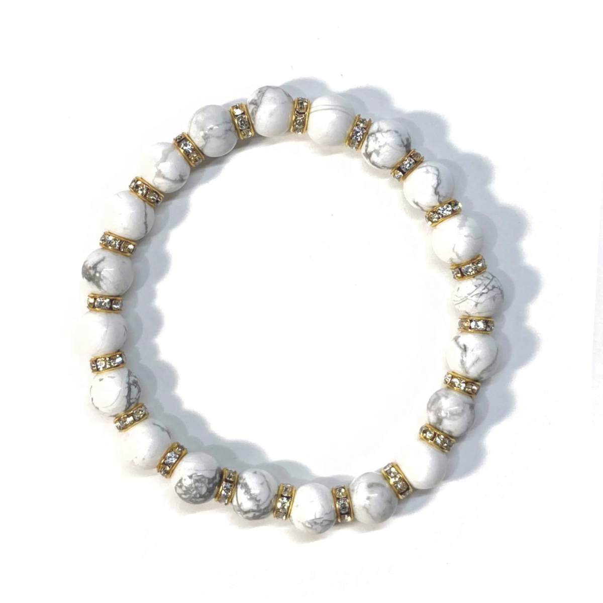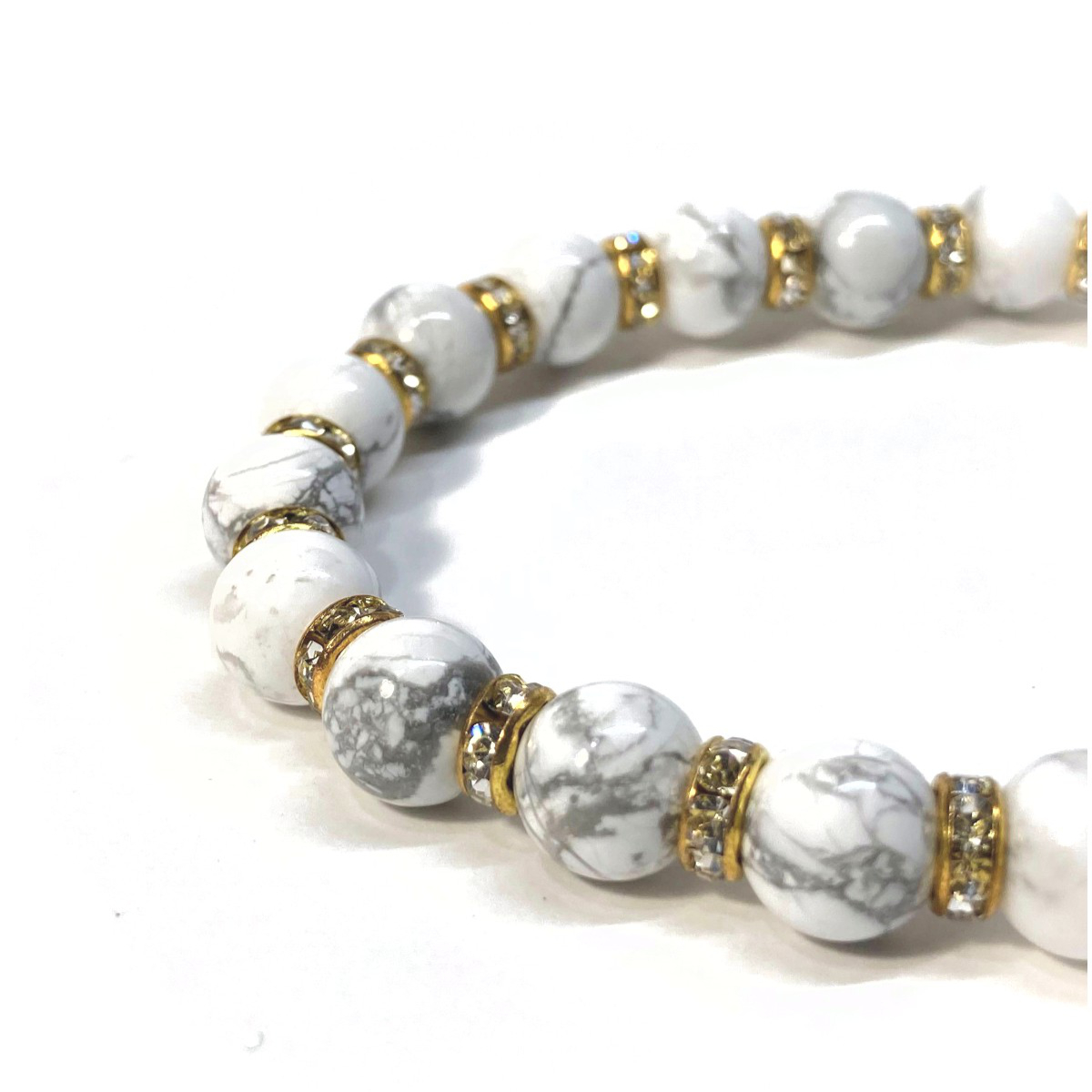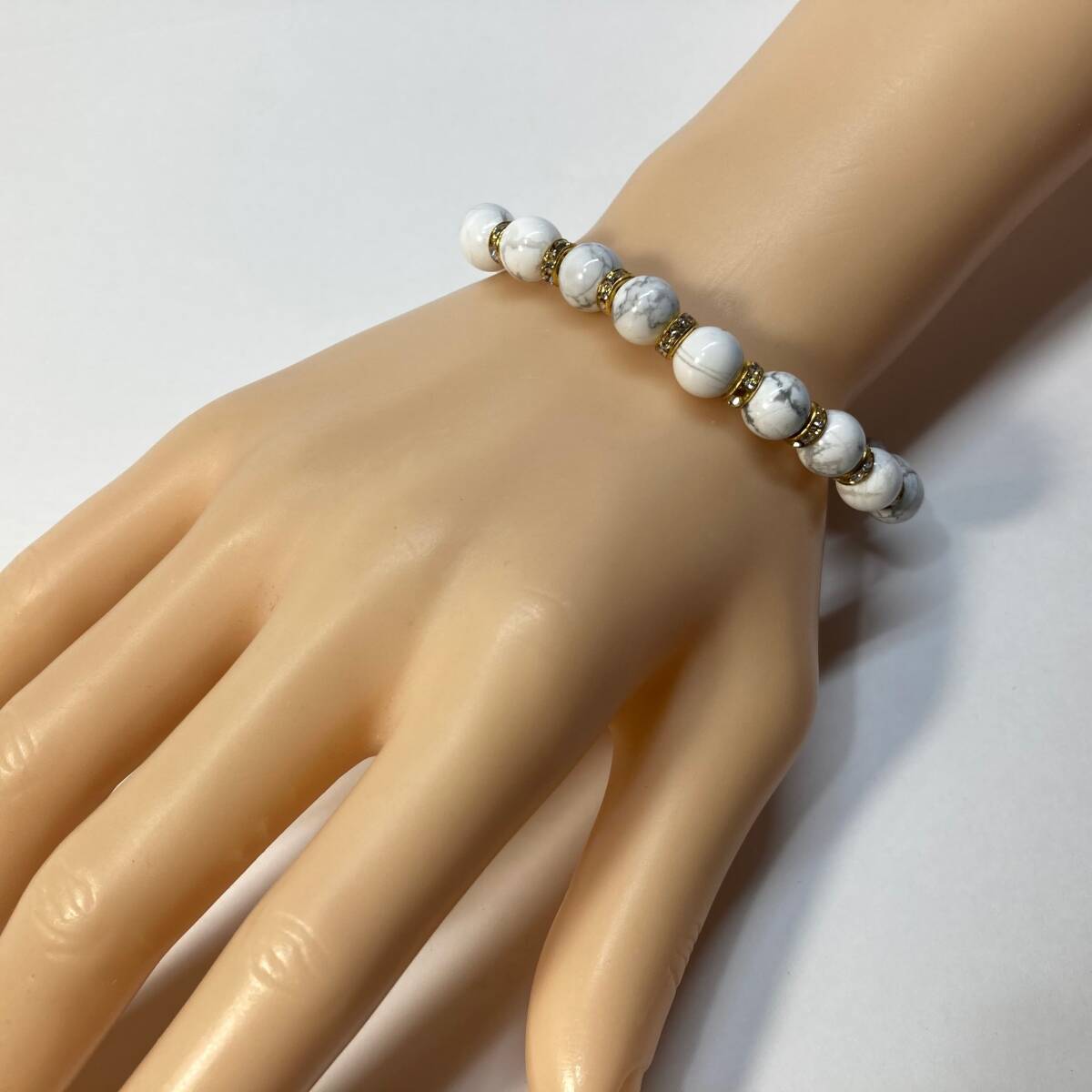 こちらは、ハウライトの8mm玉を使用したパワーストーンブレスレットです。石との間にはロンデルを挟み高級感を演出しております。シンプルなデザインは、シーン問わずどんなコーディネートとも合わせ易いブレスレットです。サイズは内径約15cmです。当社の中でも一番人気の実績があるデザインとなっております。気になる方はお早めにどうぞ。