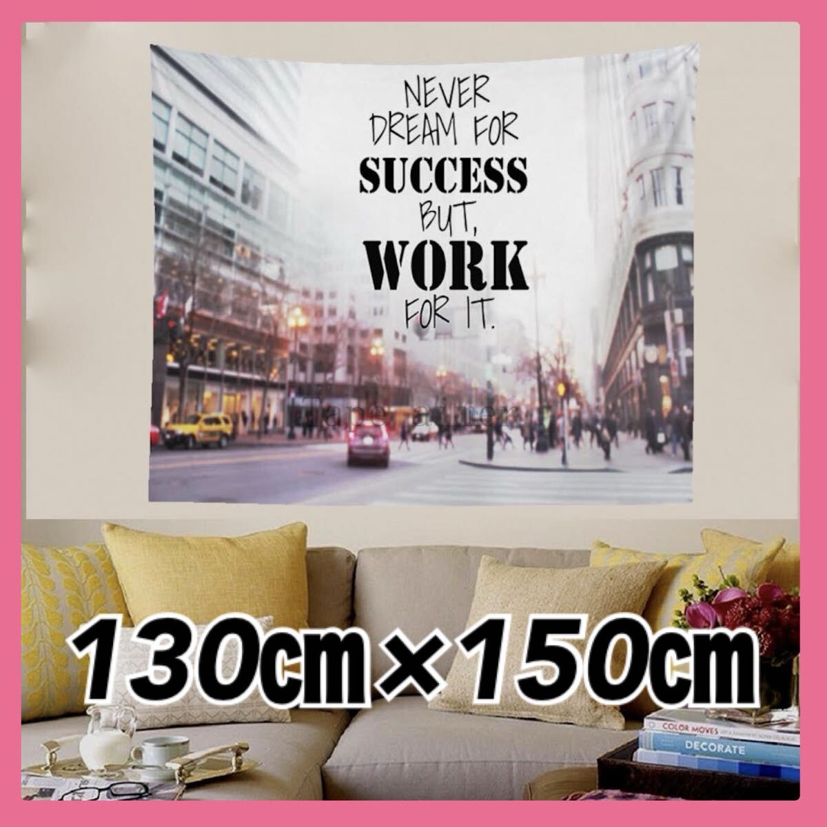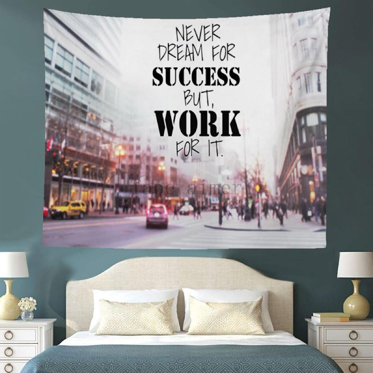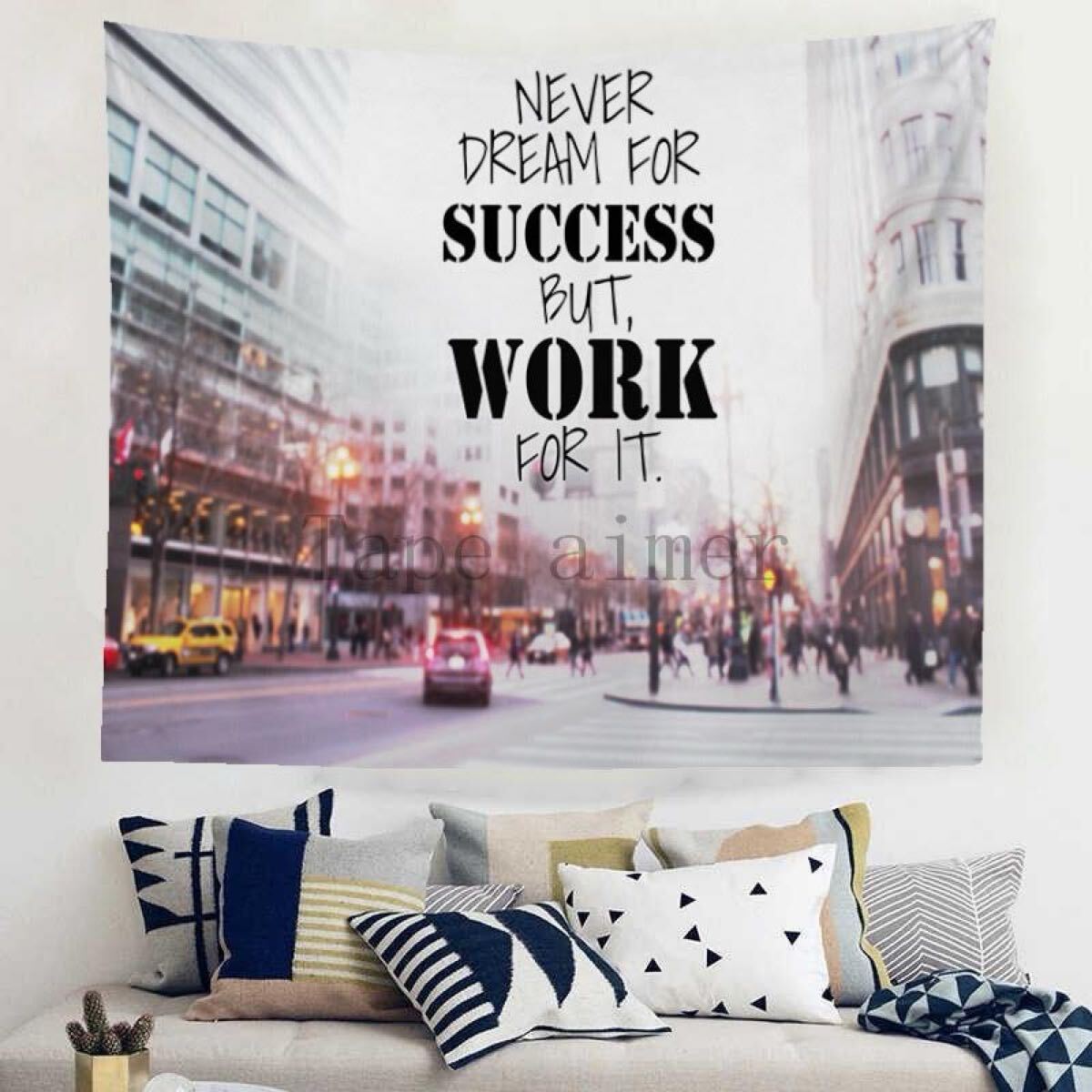ぼやけた街並みを背景に、英字メッセージが書かれたシンプルでクールなタペストリーです