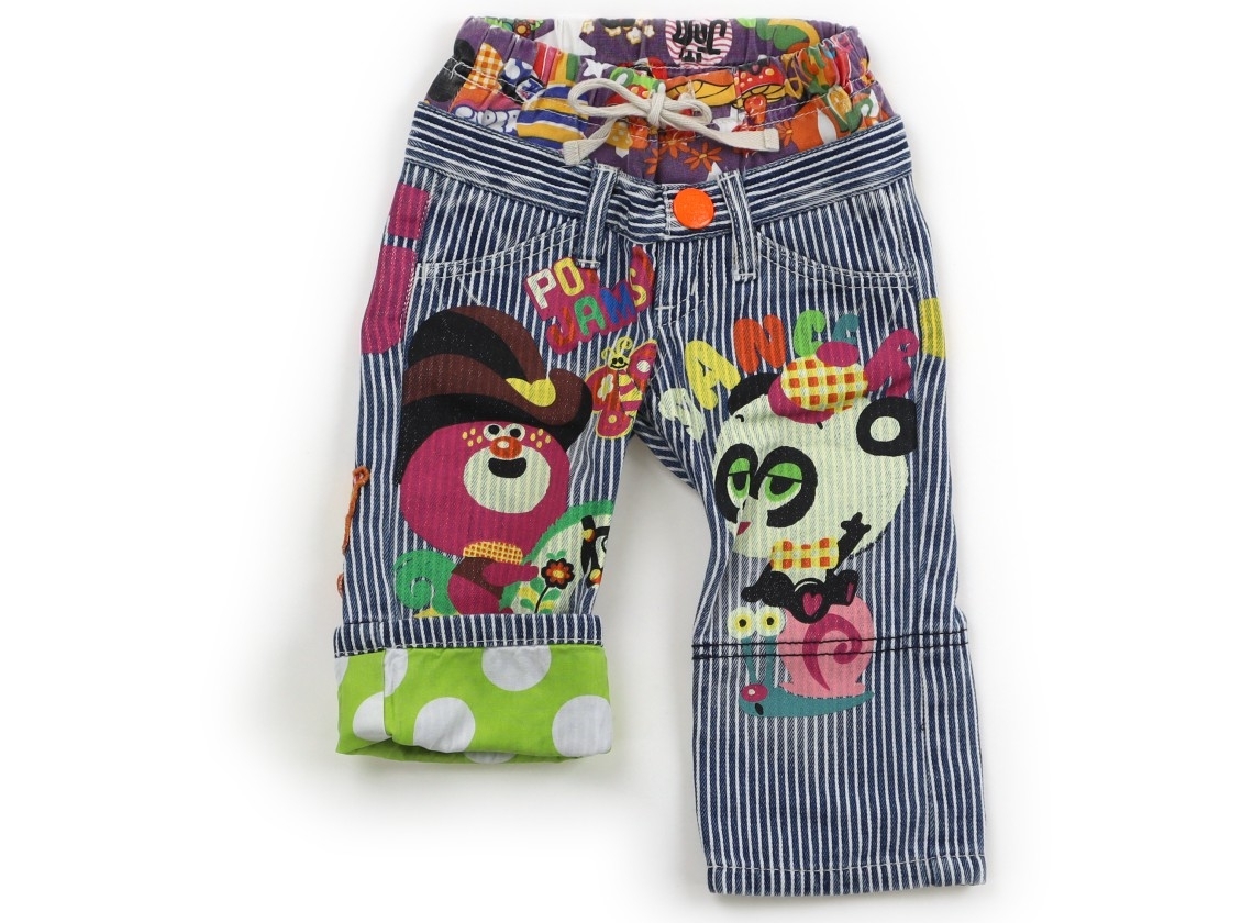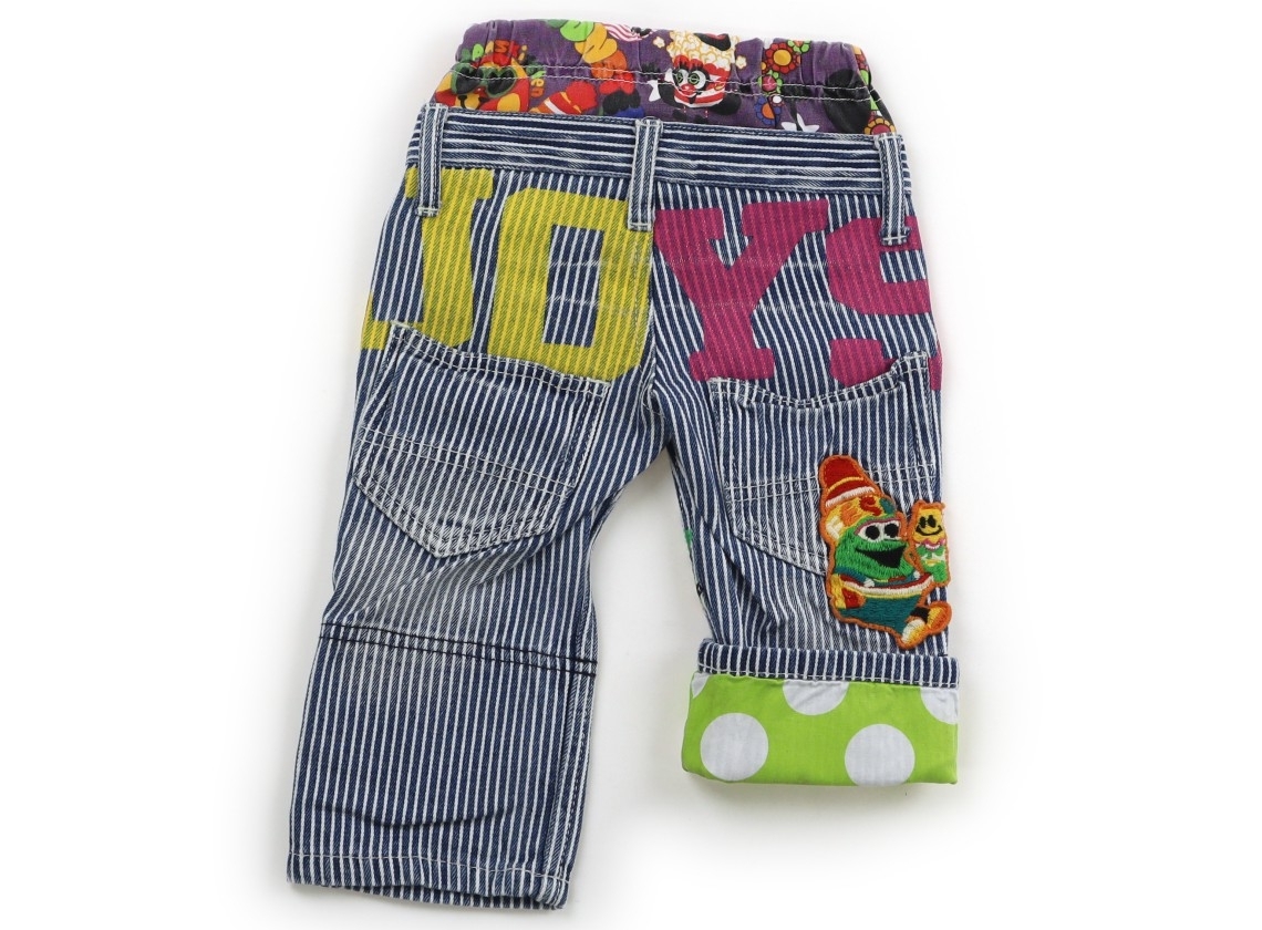 デニム生地、レイヤード風デザイン。ウエストは紐です。折り返し部分に薄汚れ、ウエストに色褪せなど使用感はありますが、目立つ汚れはありません。