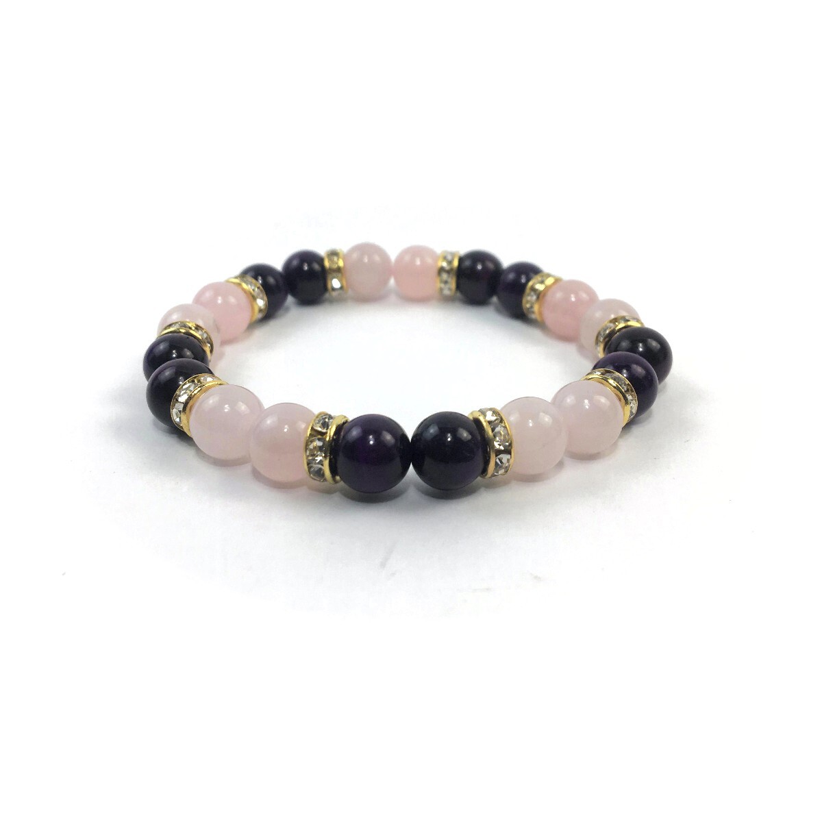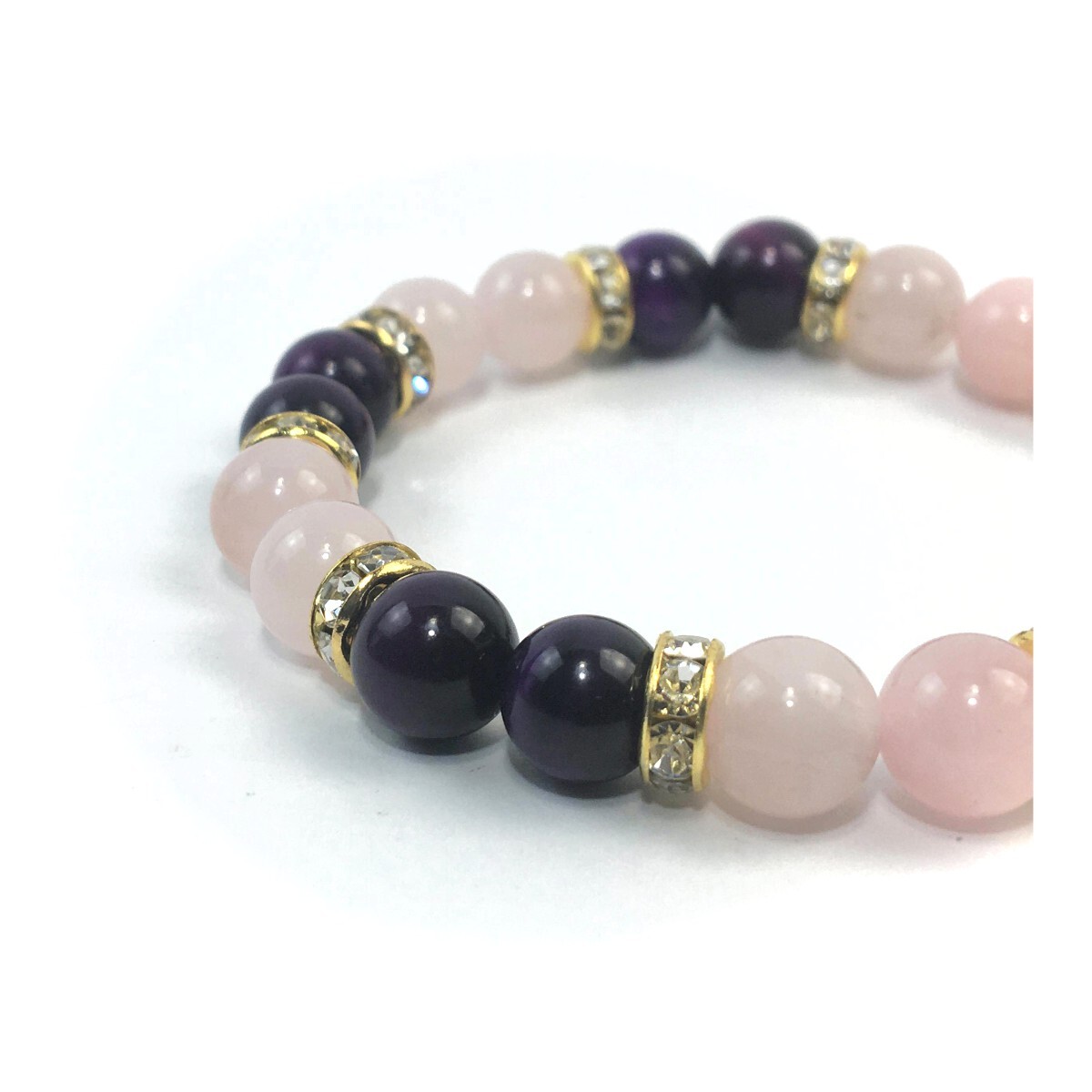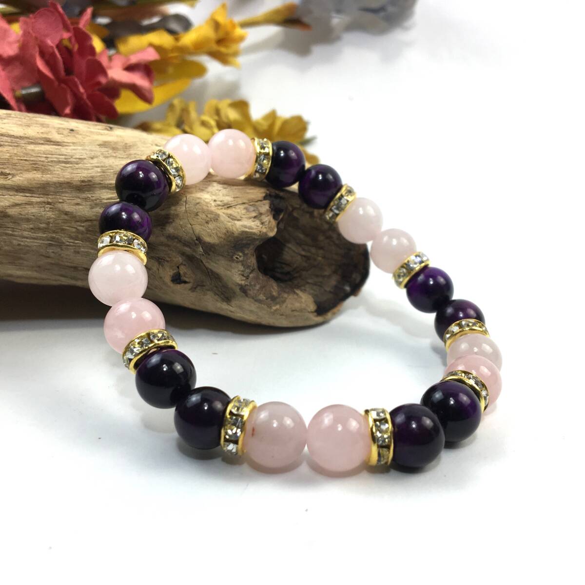 こちらは、8mm玉のローズクォーツとパープルタイガーアイを使ったパワーストーンブレスレットです。シンプルなデザインでどんなコーディネートにも合わせやすいデザインに仕上げています。サイズは内周約15cmです。気になる方は是非この機会にどうぞ。