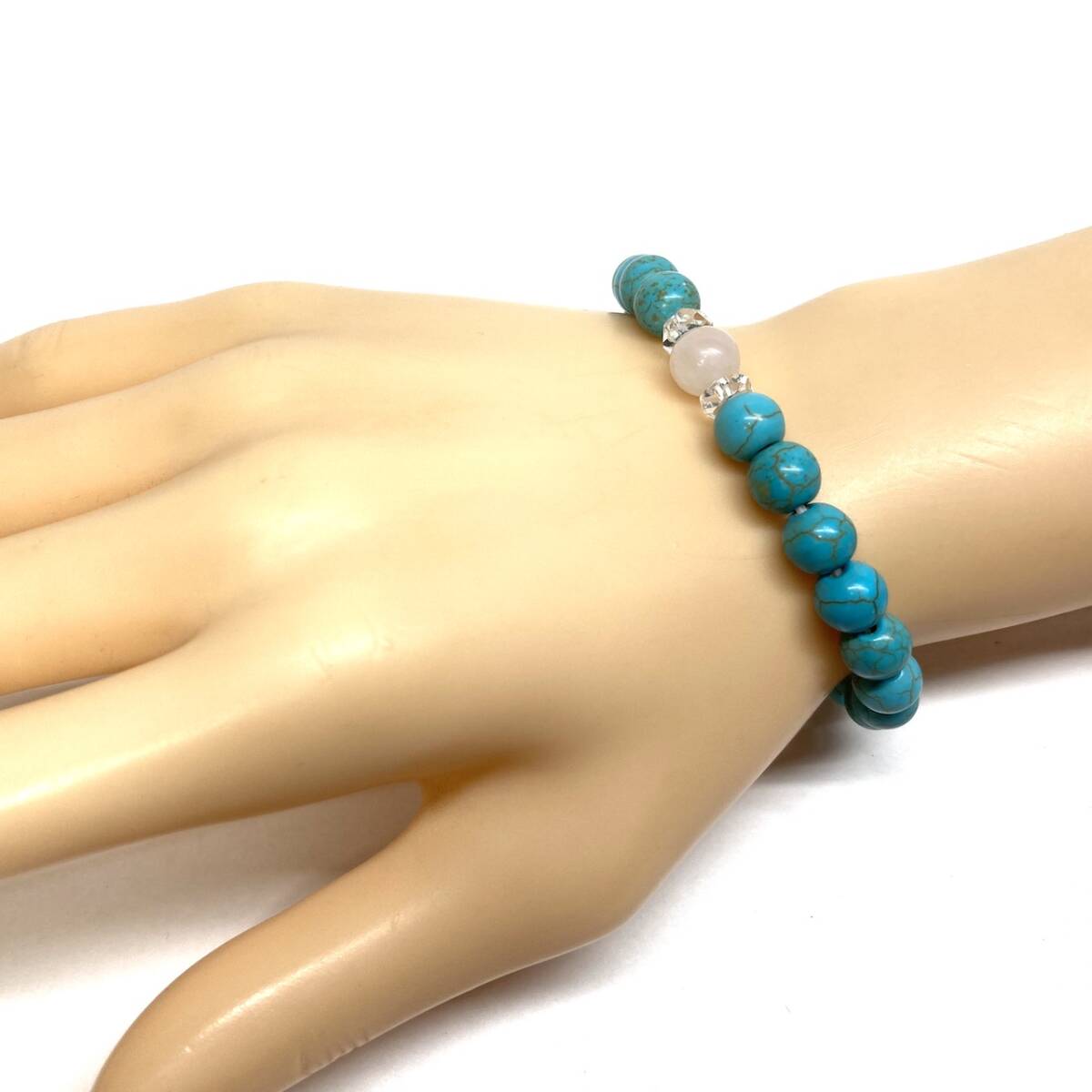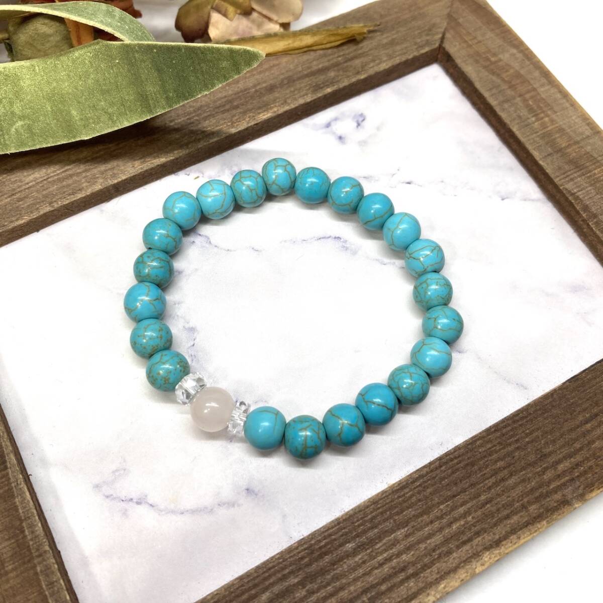 こちらは、ローズクォーツとターコイズを組み合わせた一粒ブレスレットです。石大きさ8mm玉で基本サイズは内周15cmです。プレゼントしてもいいと思います。