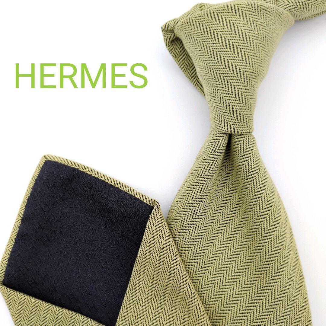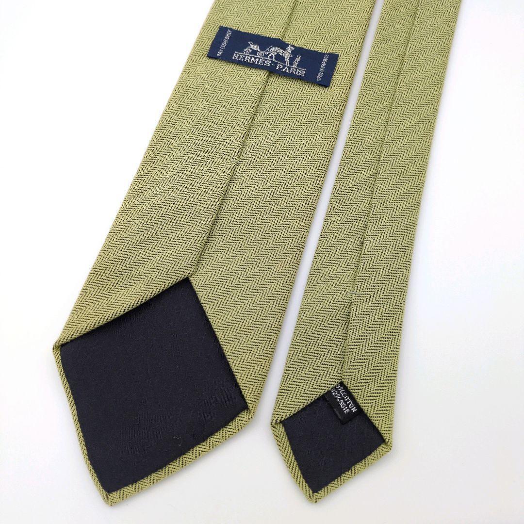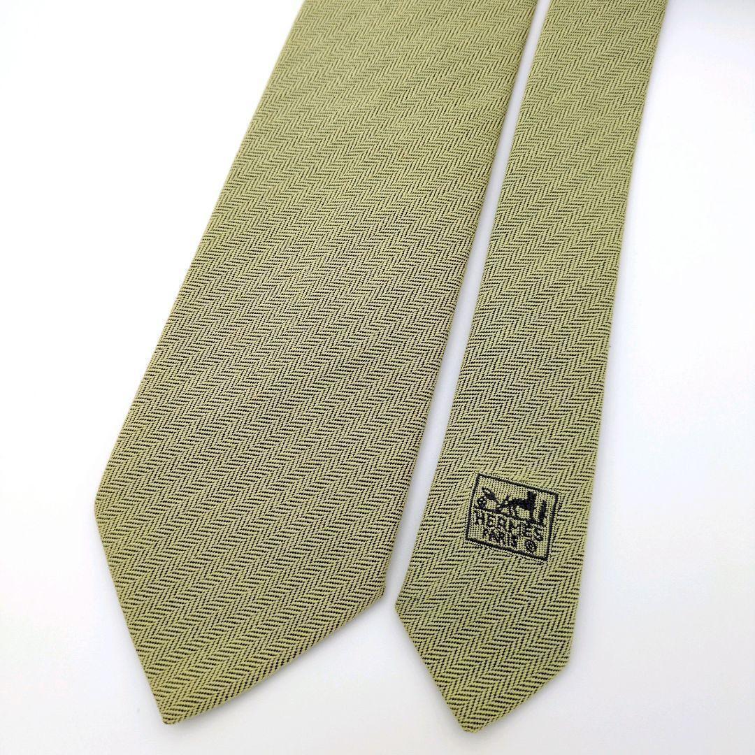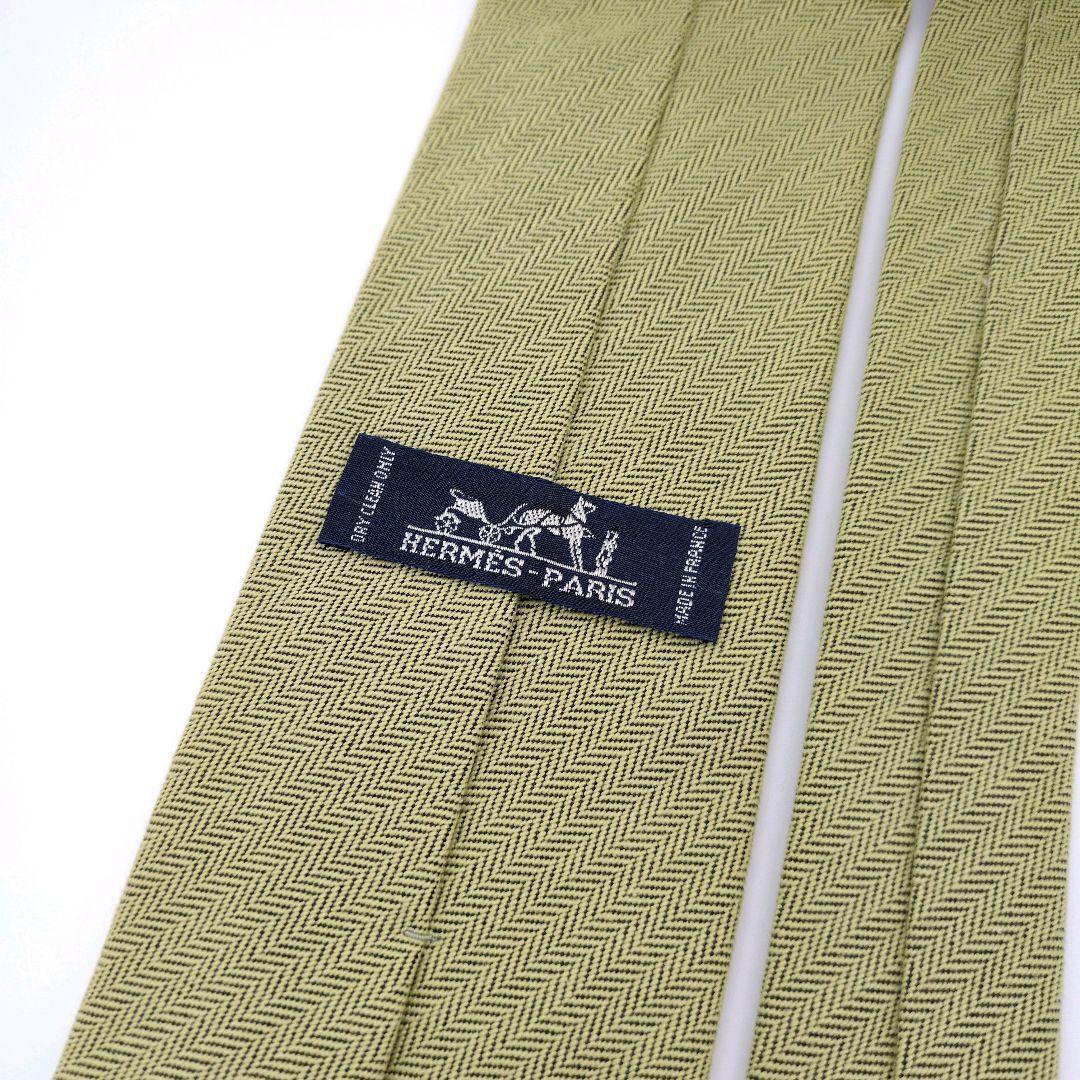 【フランス製】エルメス ネクタイ オリーブグリーン 無地 ソリッド ヘリンボーン