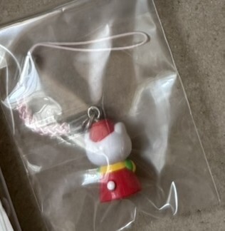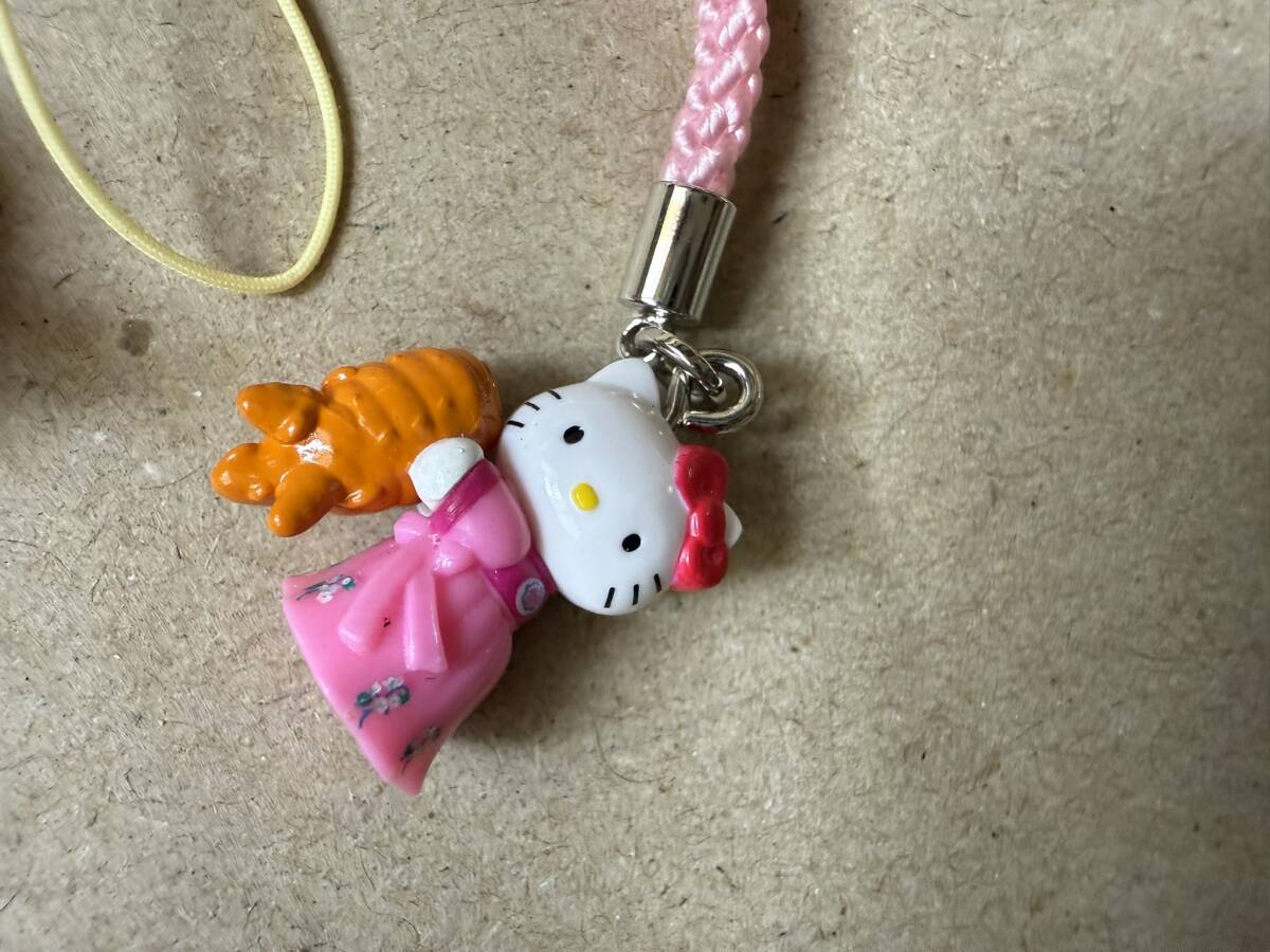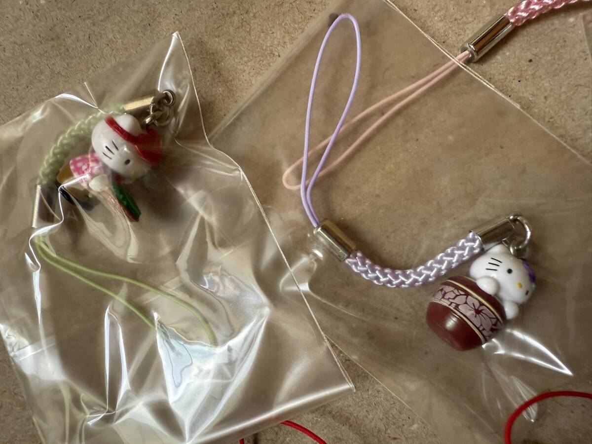 (キティちゃんの根付は撮影を間違えて合成したので紐が変な風に出ていますが一つです、青のダニエル君とペアでタグのない根付になります)