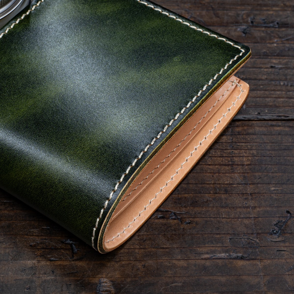 丘染めによる鮮やかな色味が特徴のメンズ二つ折り財布です。丘染めは革を台に乗せ一枚一枚染め上げる伝統技法で、回転ドラムで一括染色する方法と違い、自然なムラ感のある仕上がりになります。