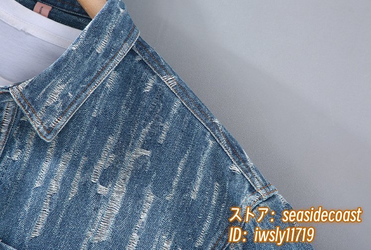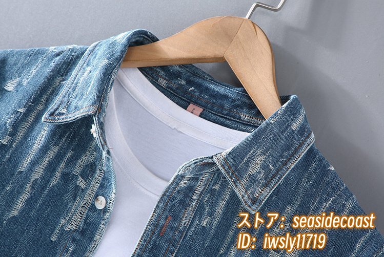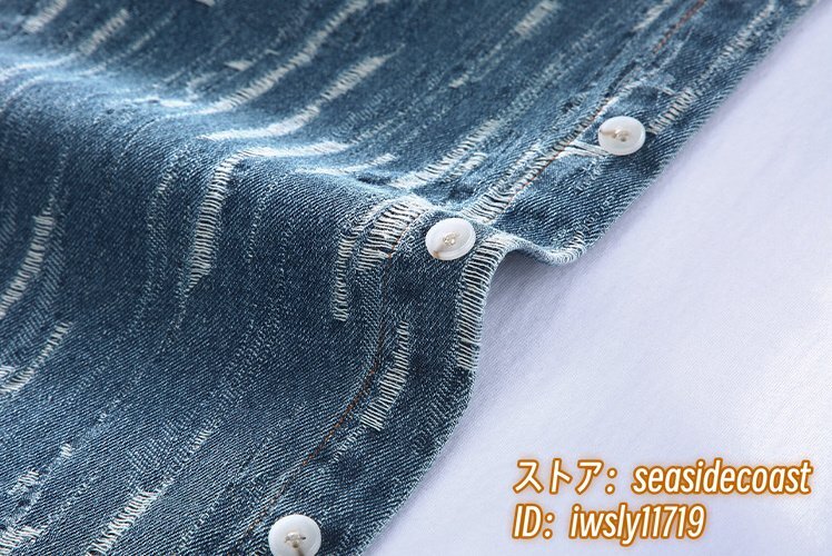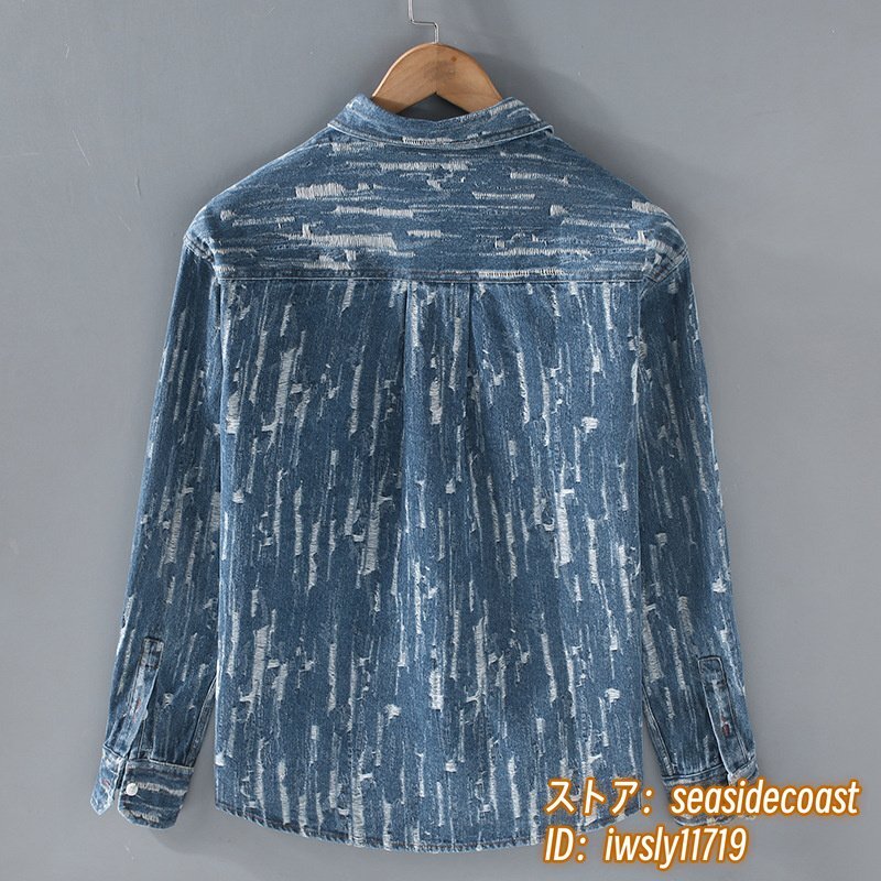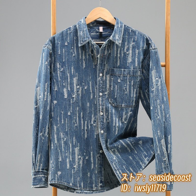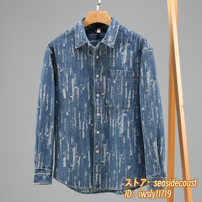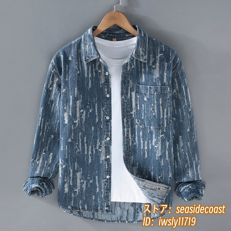 入手困難■デニムシャツ メンズ 長袖シャツ ダメージ加工 デニムジャケット 極美品 ヴィンテージ お洒落 個性 トレンド カジュアル M