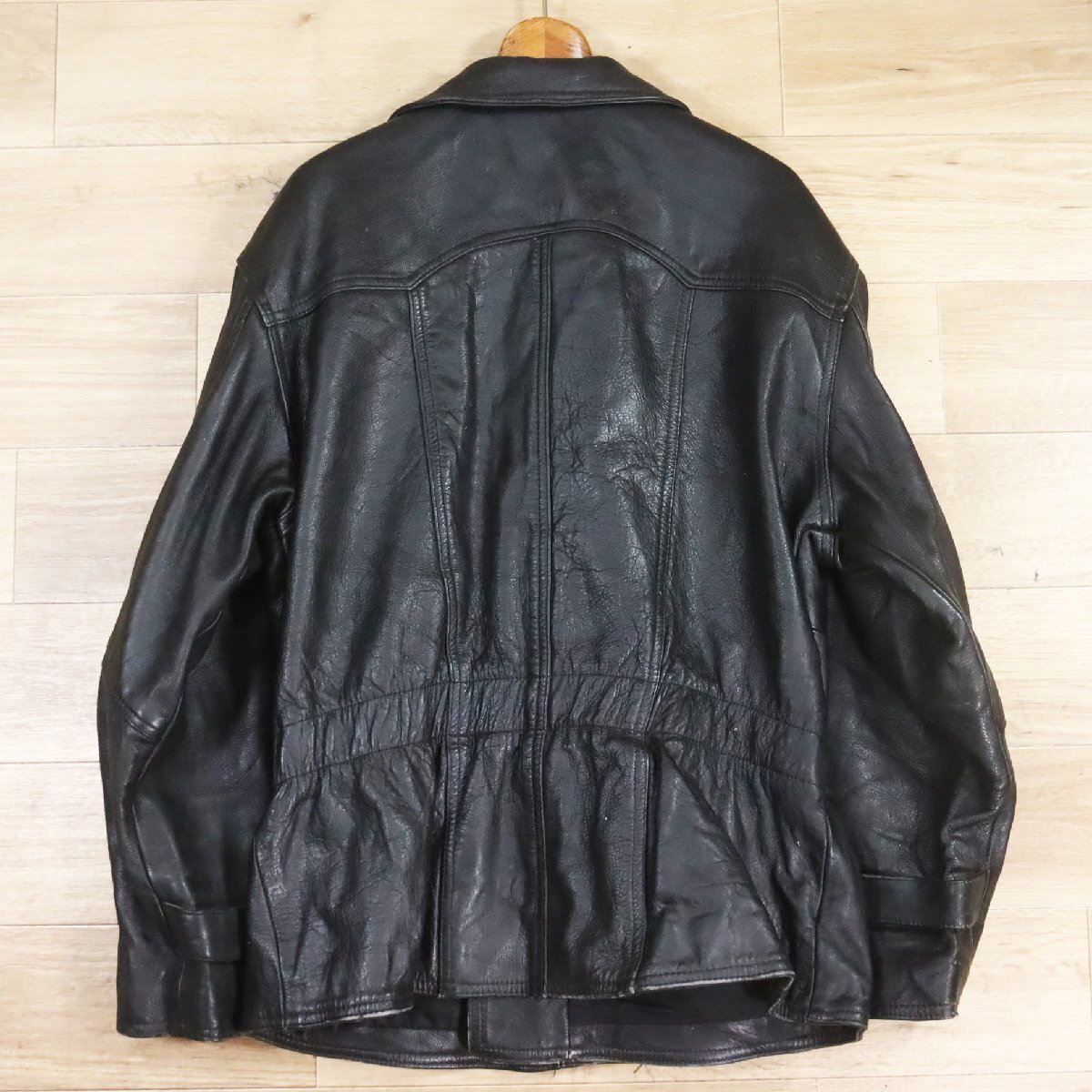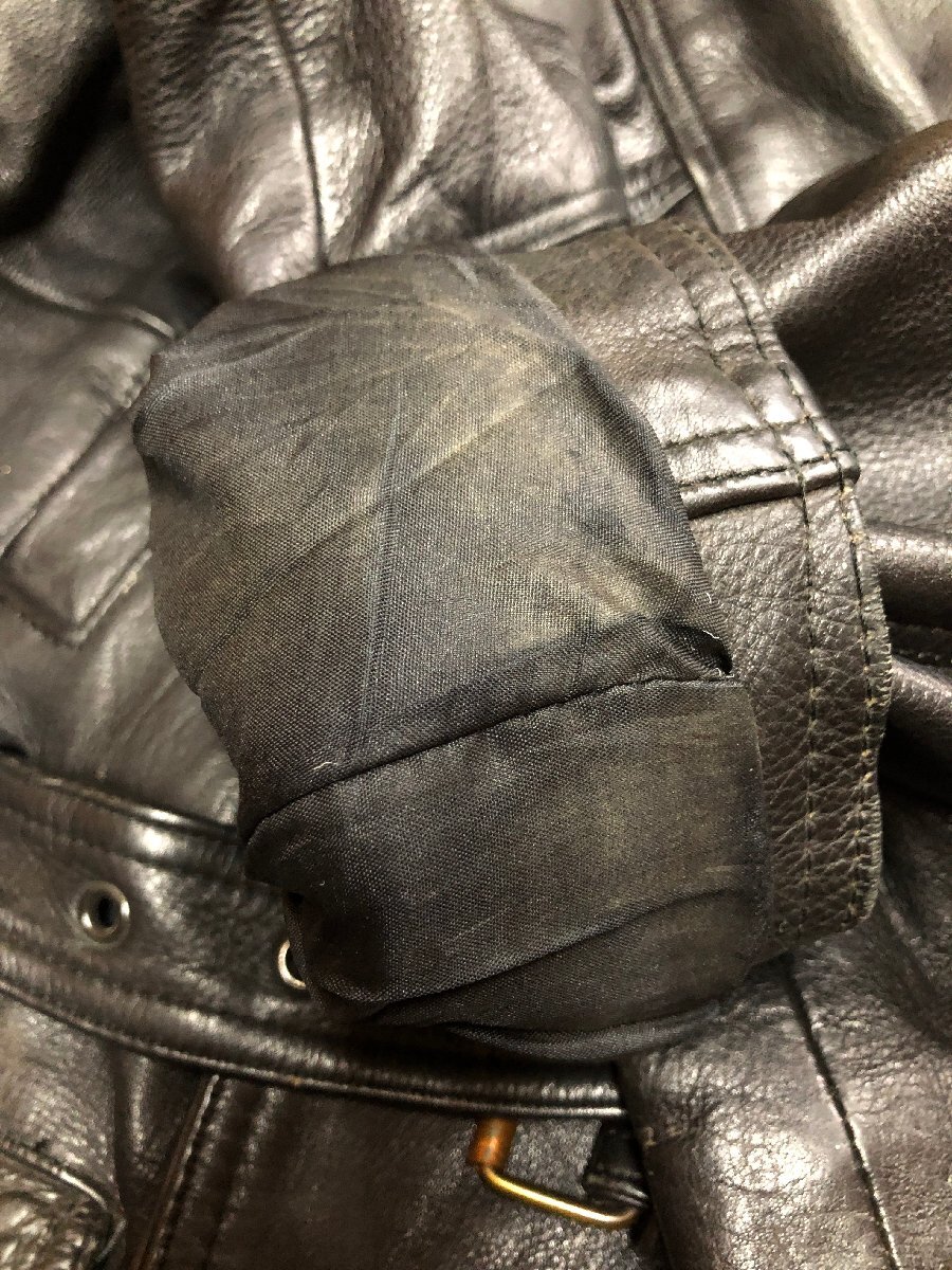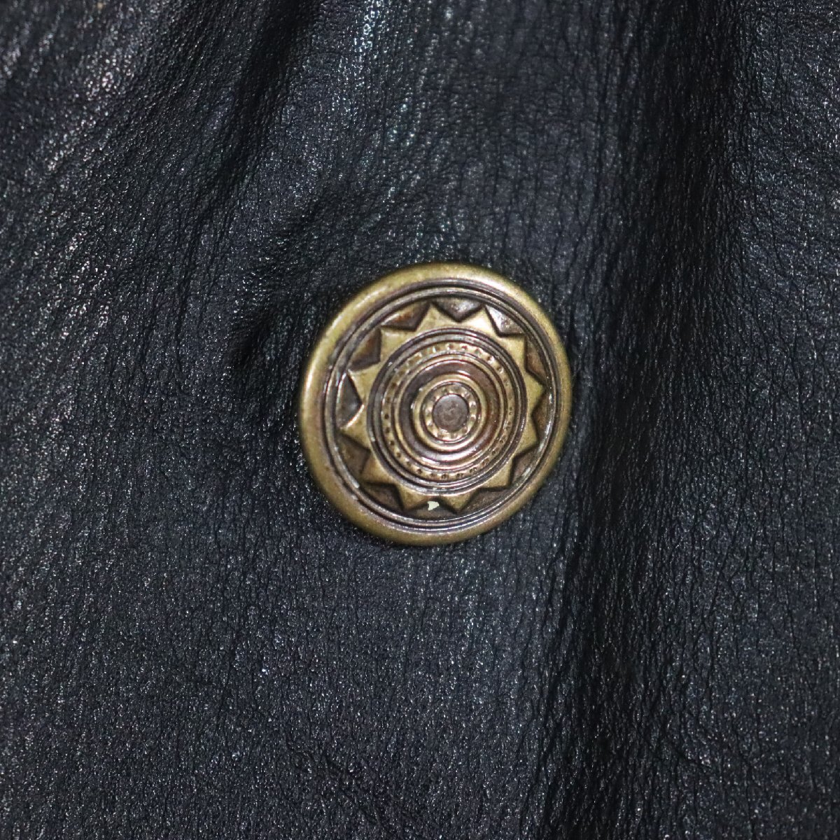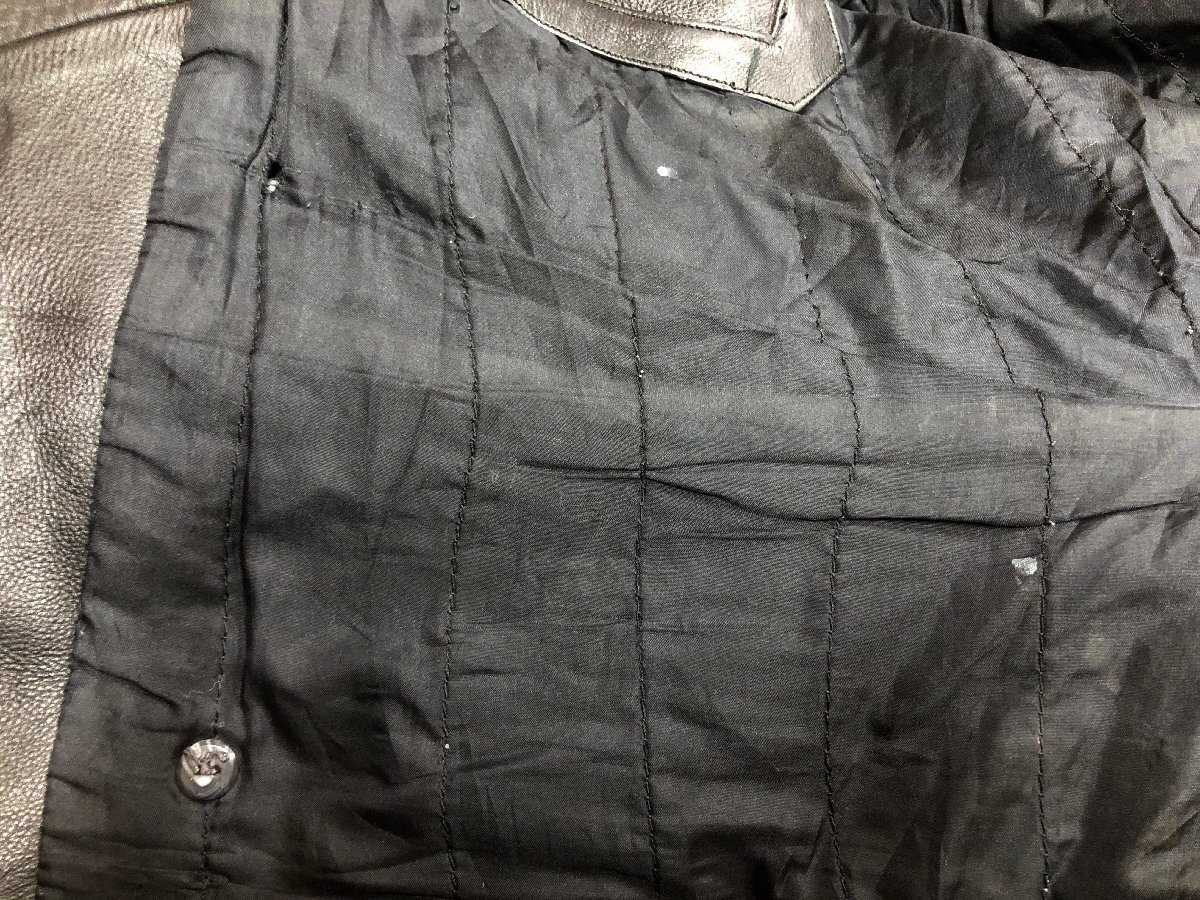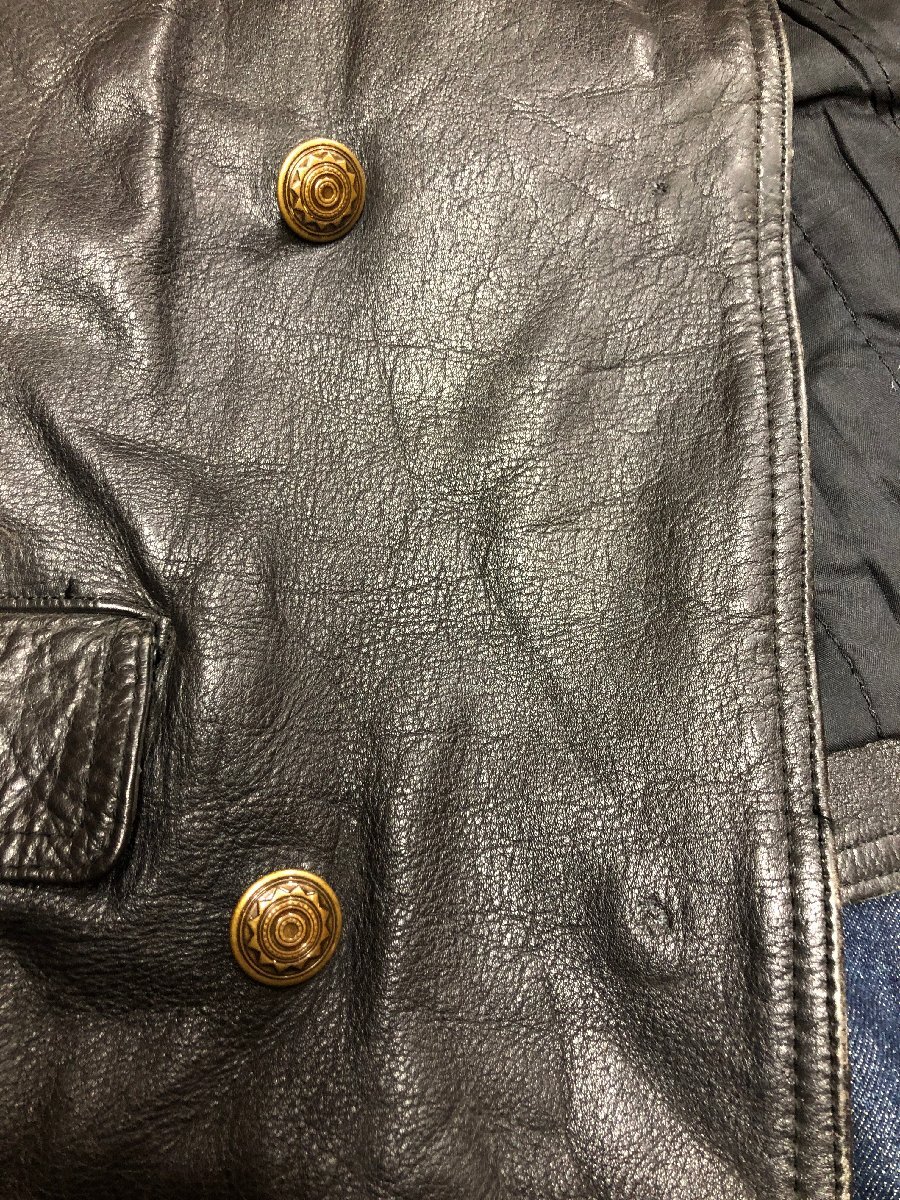 中古品です。使用感があります。経年によるレザー特有の擦れ、裏地と袖裏に薄汚れと小さい破れ、左裏ポケットにリペア跡、フロントボタン付近にボタン跡がありますが、他に大きなダメージはありません。