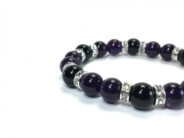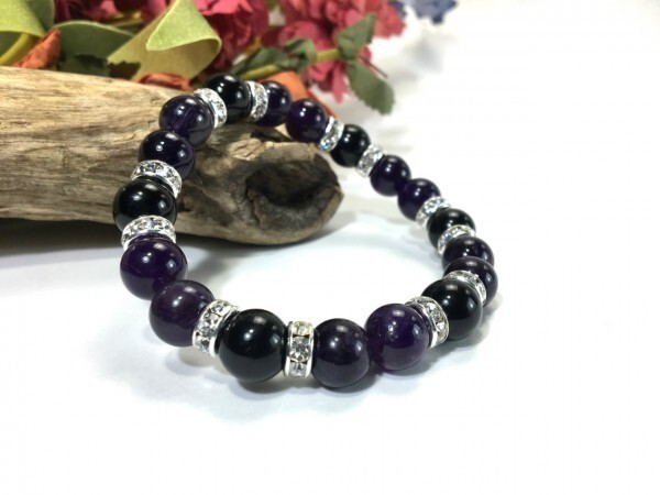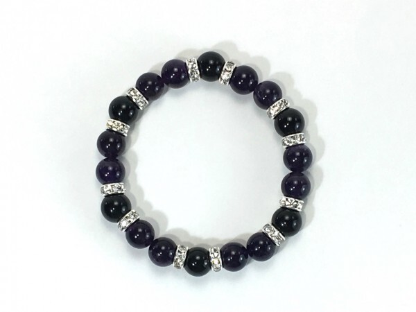 こちらは、アメジストとオニキスを組み合わせたブレスレットです。間にはロンデルを挟み高級感あるデザインに仕上がっています。石大きさは腕にも馴染みやすいように10mm玉で内径約18cm(伸可能)です。数に限りがございますので気になる方はお早めにどうぞ。サイズ調節も可能ですのでサイズ調節の場合は取引ナビにてご一報くださいませ。(サイズ調節無料です)