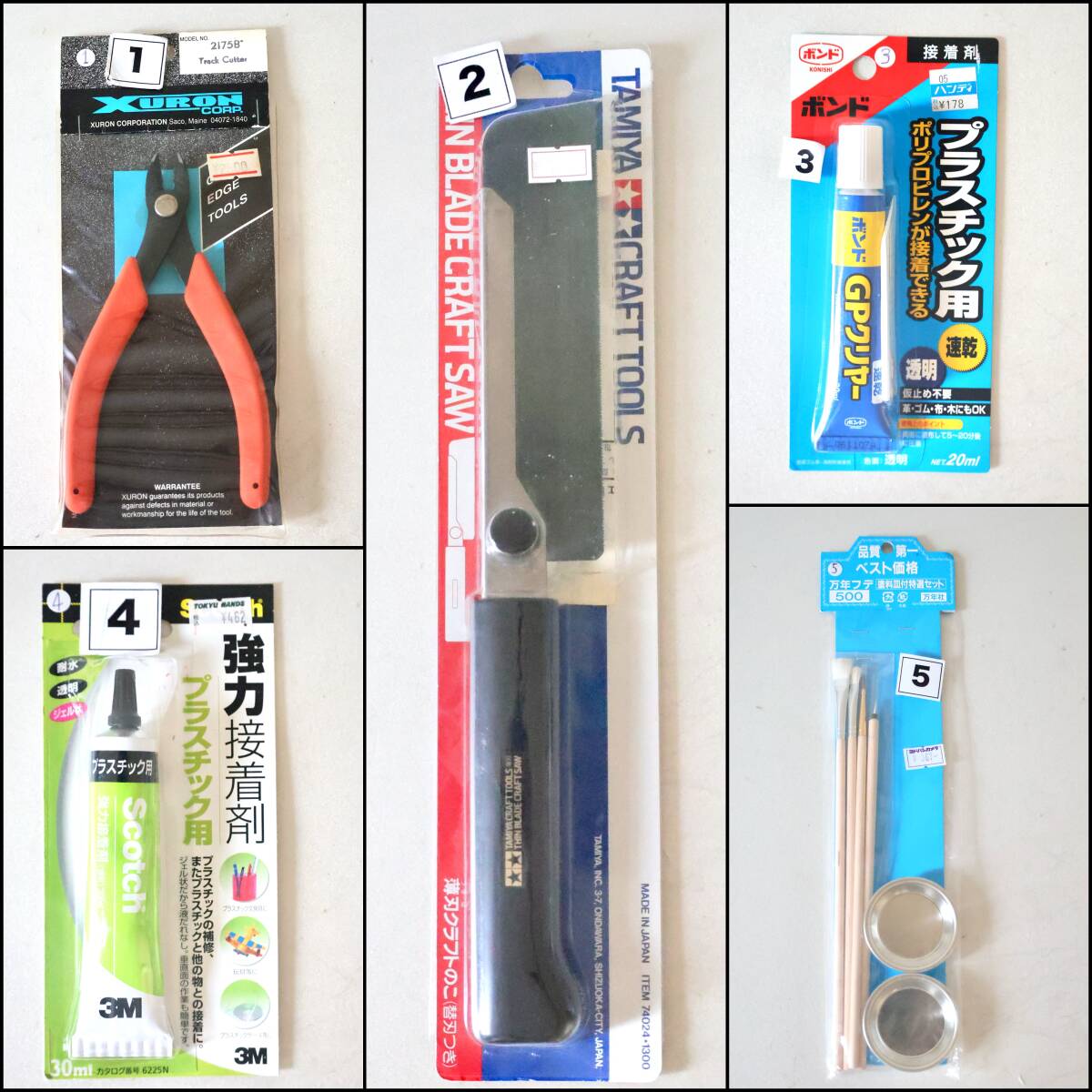 1トラックカッター 2薄刃クラフトノコ 3プラスチック接着剤 4強力接着剤 5絵皿付筆セット 5点まとめて