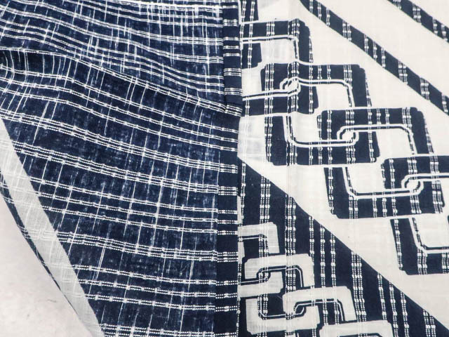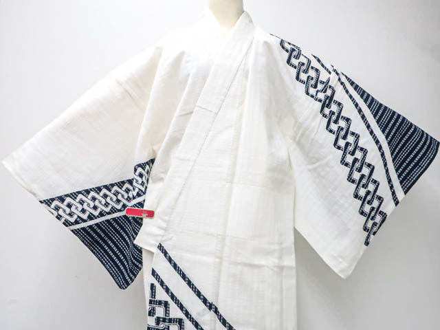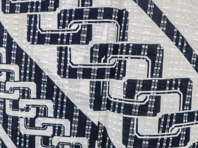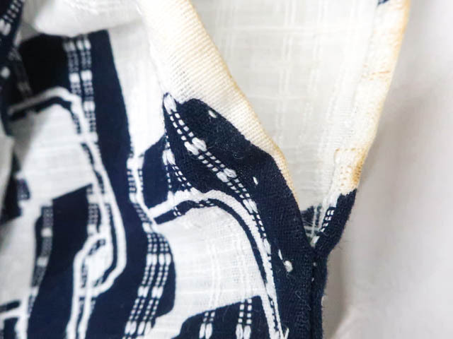 肩当て付きです。リサイクル商品のため、全体所々にしみ汚れがございますが着用可能なお品です。 地色は 生成り 紺です。 1枚目の画像が近いお色かと思われます。 素材は綿です。 |
