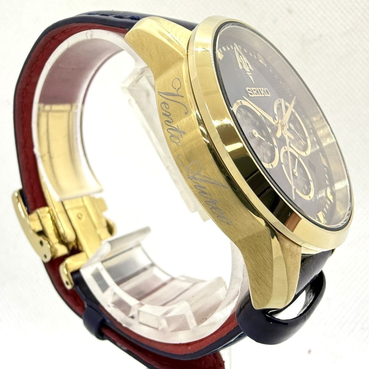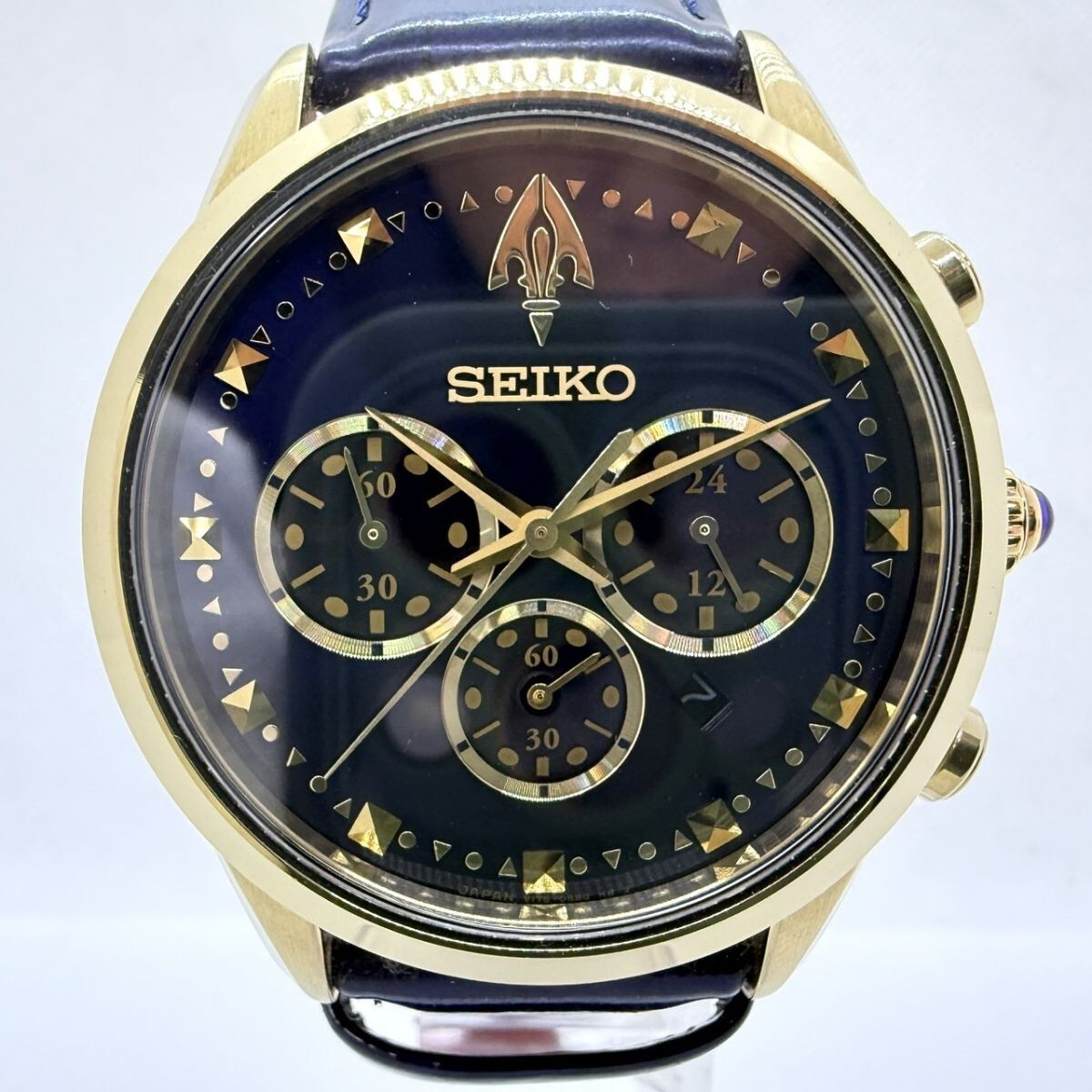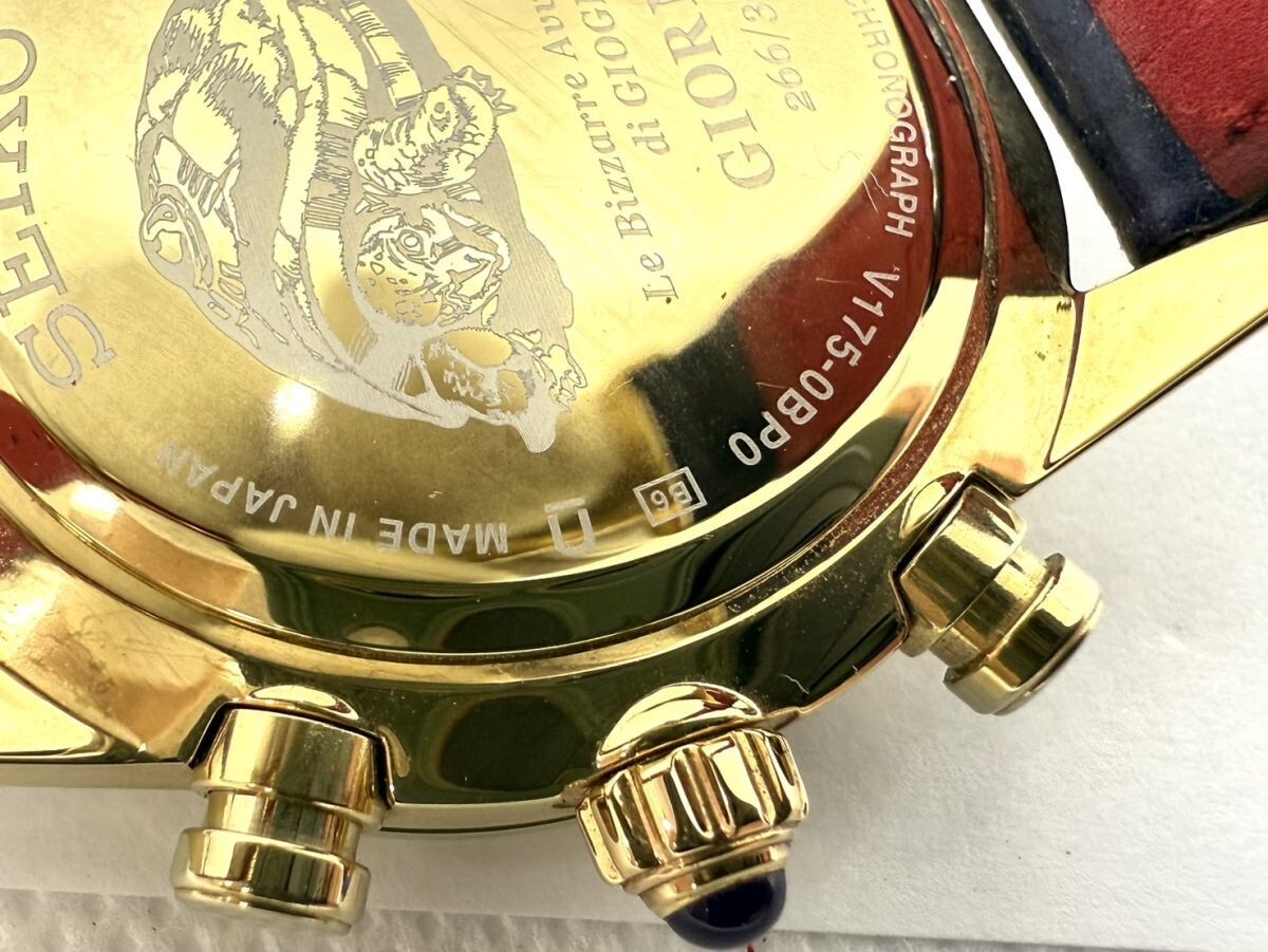 取り扱っている商品は未使用・未開封も含め、全て一度は人の手に渡った一点ものの中古・ジャンク扱いでの商品です。 当方素人ですので肉眼で確認できる簡易的な検品、採寸、および簡易梱包となります。 ※稼働の記載につきましては秒針等の確認のみとなり、全体の動作を保証するものではございません。 また、出品時の中古品の動作状況となりますので、予めご了承の上でご入札ください。 不動の表記につきましてはクォーツ式のムーブメントの場合、動作未確認の状態となります。 電池交換後、不具合があった場合でも返金、返品の対象とはなりませんので、予めご了承くださいますようお願い致します。 細かな日差、オーバーホール状況、社外パーツの使用に関しては保証しかねますので、ご理解いただけた上でのご入札をお願い致します。 上記を踏まえた上で中古品、ジャンク商品として出品させていただいておりますので、全てご理解いただけた上でのご入札をお願いいたします ------------------------------------------------------------------------- 【メーカー】 SEIKO セイコー 【モデル名】 スピリット ジョジョ ジョルノ ジョバーナ 限定モデル 【型番】 V175-0BP0 【シリアル】 266/300 【サイズ】 直径約39mm 腕回り約-cm 【付属品】 画像参照 【稼働状態】 稼働(電池残量不明) 電池切れの挙動あり 【その他状態】 リューズ動作 時間:OK 日付:OK 曜日: クロノグラフ:針は動きますが、挙動に難あり(電池切れのためかどうかは不明となります。) ------------------------------------------------------------------------- 画像にあるものが全てです。 他詳細は画像にてご判断ください。 ※目立つ傷や汚れを中心に写真を撮っておりますが、画像に写りきっていない傷等がある場合もございます。予めご了承ください。 ※商品を多数出品している関係で、稀に商品説明や画像に誤りがある場合がございます。予めご了承ください。 こちらのページをご覧いただく際は、商品説明文と掲載している画像の全てを確認いただいた上でご入札ください。 | |||||||