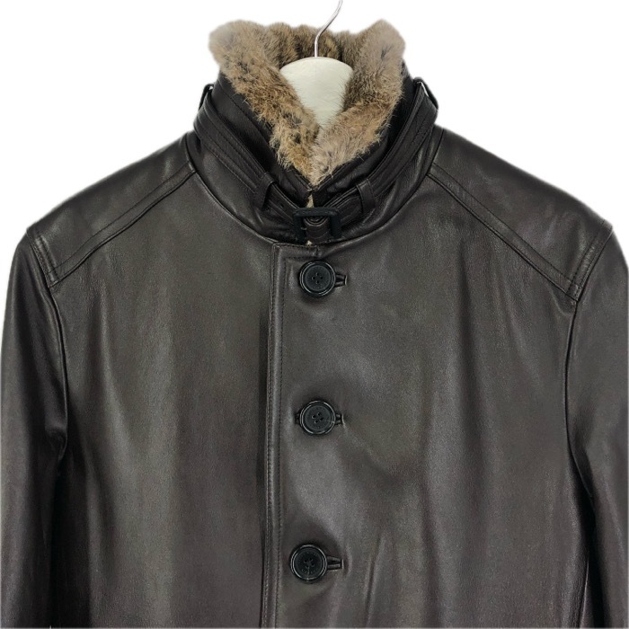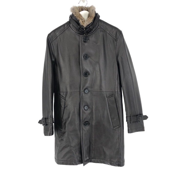 商品説明 | 【素材】羊革 バックル部分:牛革 ファー部分:毛皮(ラビット) 中わた:ポリエステル100% 裏地:胴キュプラ 袖ポリエステル 【季節】秋冬 【商品補足説明】※サイズは平置採寸です。 |