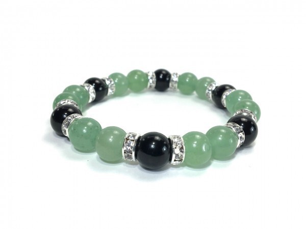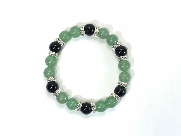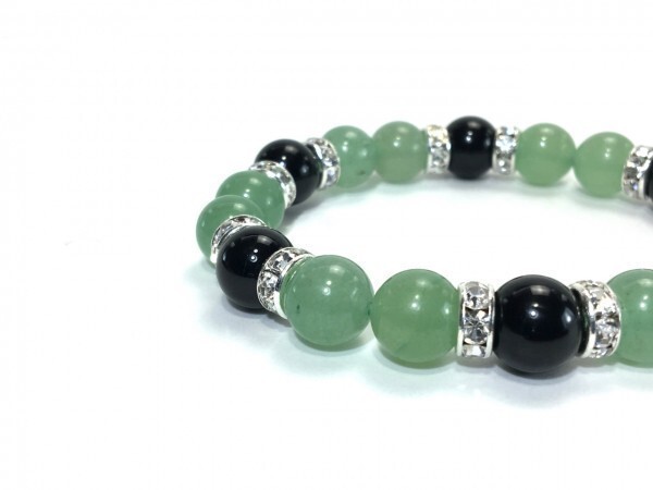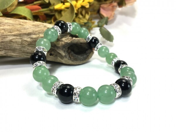 こちらは、アベンチュリンとオニキスを組み合わせたブレスレットです。間にはロンデルを挟み高級感あるデザインに仕上がっています。石大きさは腕にも馴染みやすいように10mm玉で内径約18cm(伸可能)です。数に限りがございますので気になる方はお早めにどうぞ。サイズ調節も可能ですのでサイズ調節の場合は取引ナビにてご一報くださいませ。(サイズ調節無料です)