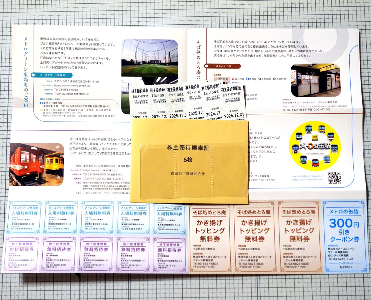 ① 東京地下鉄㈱の株主優待乗車証 6枚(有効期限2025年12月31日迄)