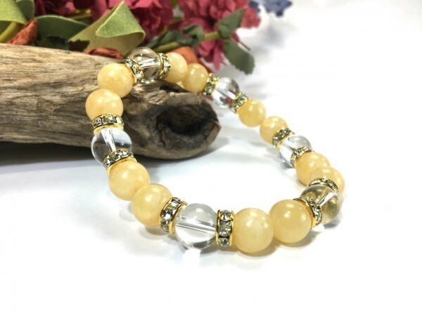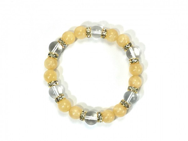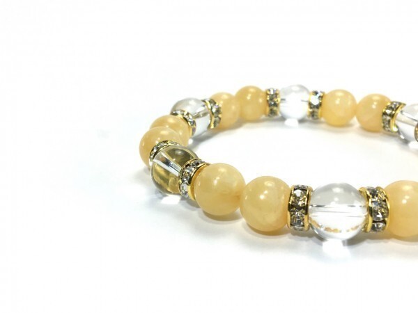 こちらは、アラゴナイトと水晶を組み合わせたブレスレットです。間にはロンデルを挟み高級感あるデザインに仕上がっています。石大きさは腕にも馴染みやすいように10mm玉で内径約18cm(伸可能)です。数に限りがございますので気になる方はお早めにどうぞ。サイズ調節も可能ですのでサイズ調節の場合は取引ナビにてご一報くださいませ。(サイズ調節無料です)