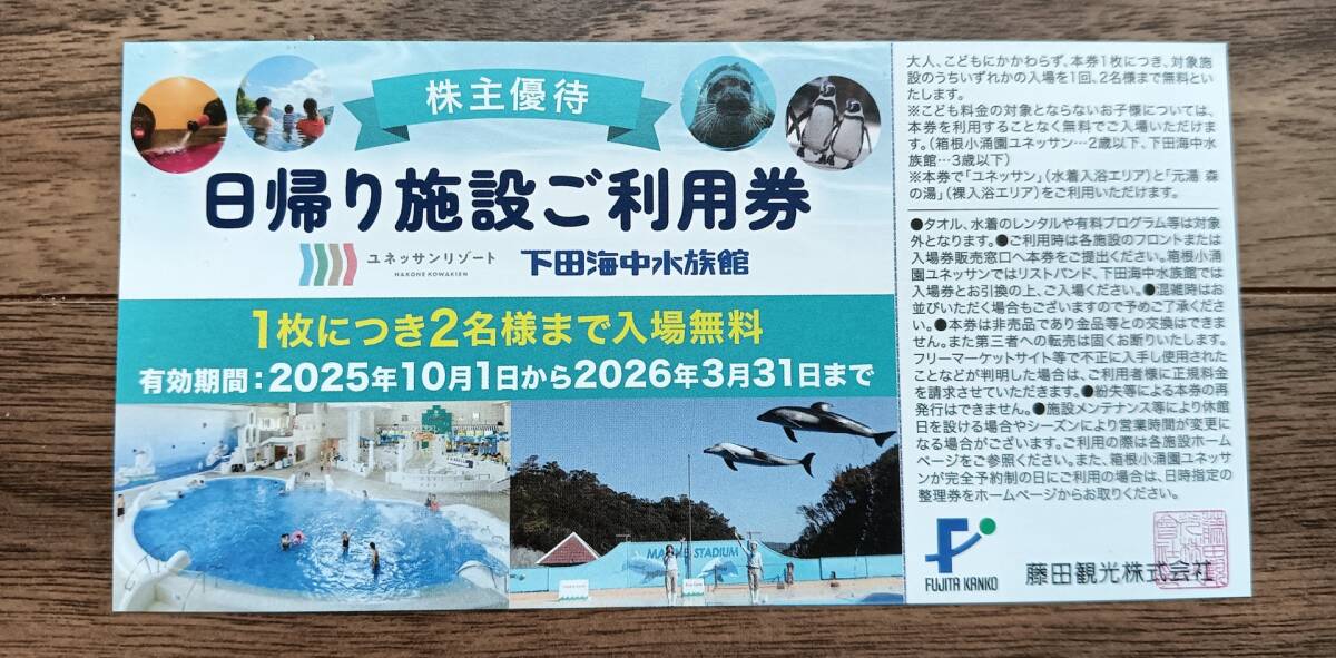 1円スタート 藤田観光 株主優待 1枚(1枚につき2名迄無料) 26年3月末日まで ユネッサン プール 家族旅行 下田海中水族館 レジャー