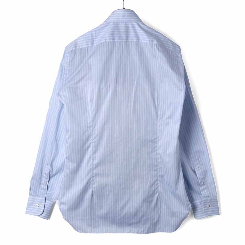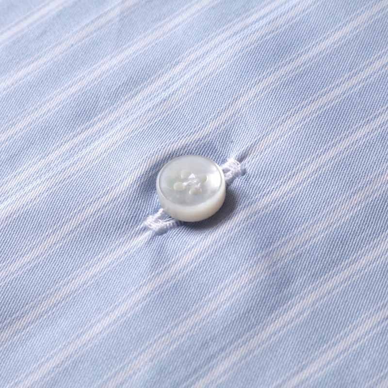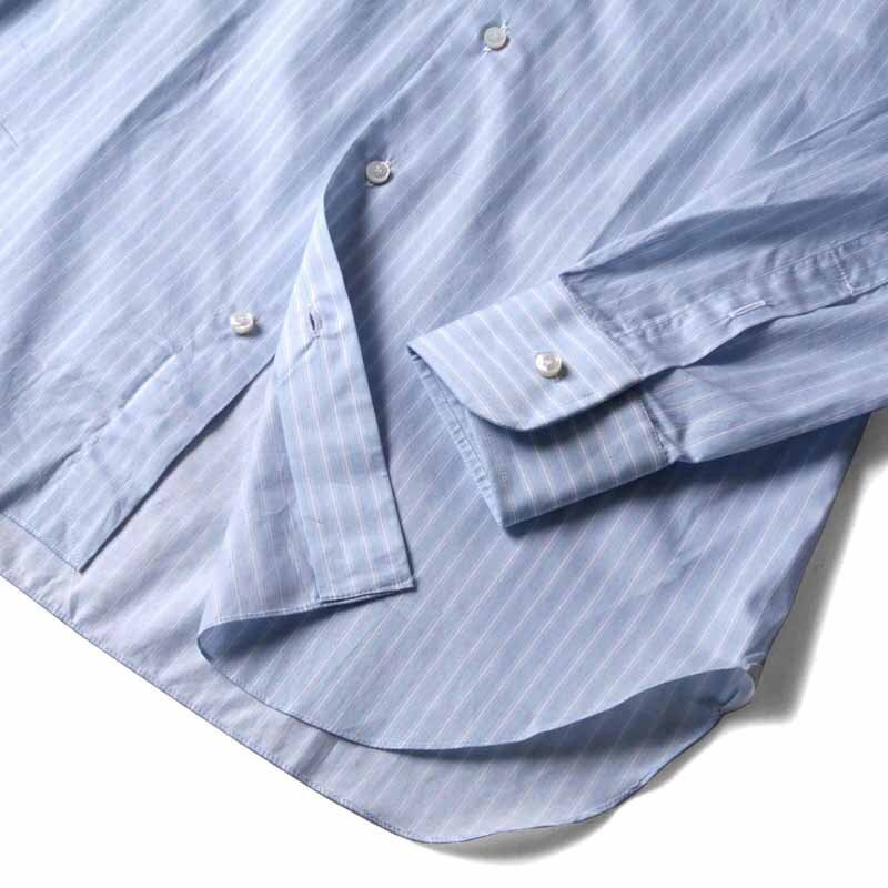 ・¨ワイドカラーとホリゾンタルカラーの中間¨といったニュアンスの、絶妙な開き具合のワイドカラーを採用したストライプシャツ。
