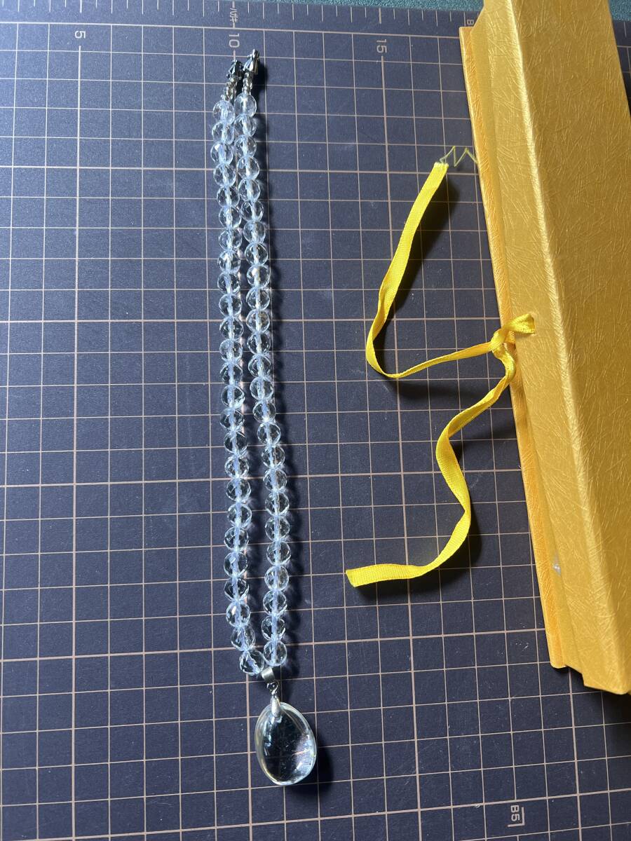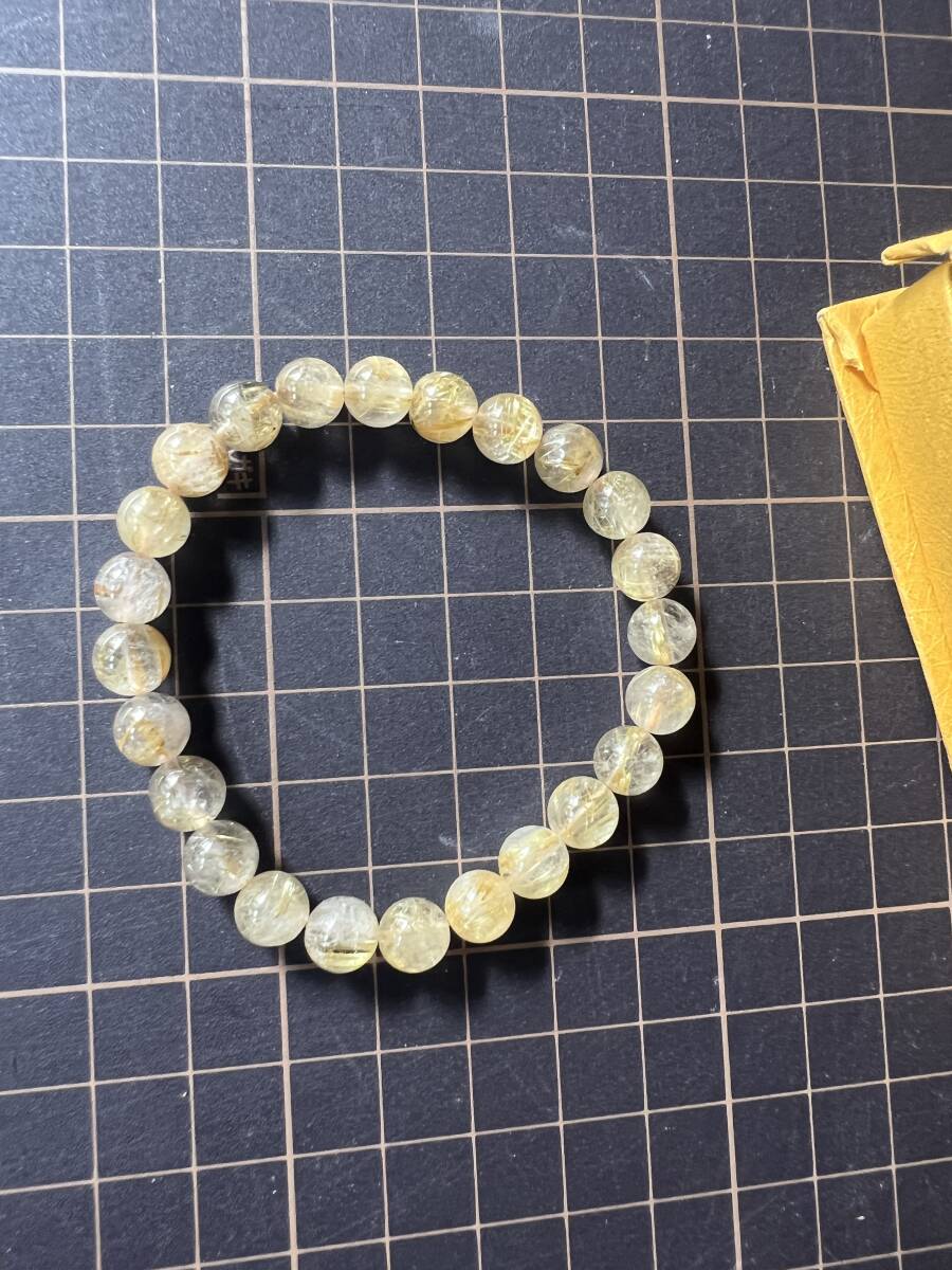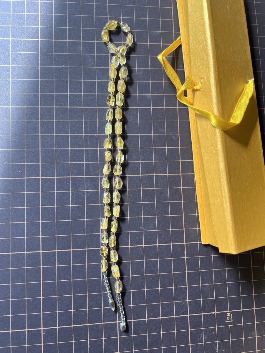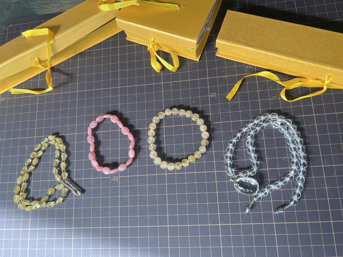 シトリン、水晶のネックレス、ローズクォーツ、金針ルチルのブレスレットの4点セットです。