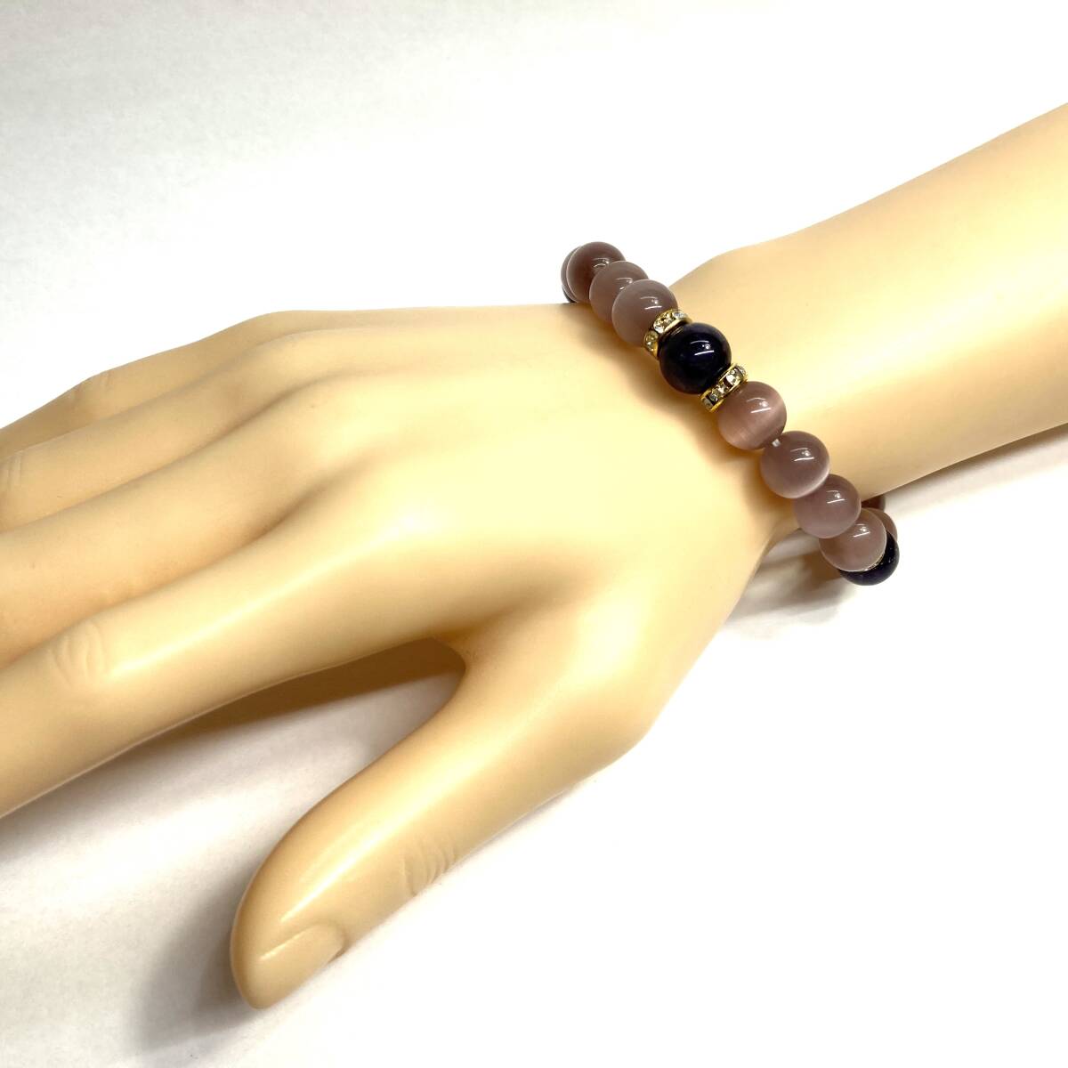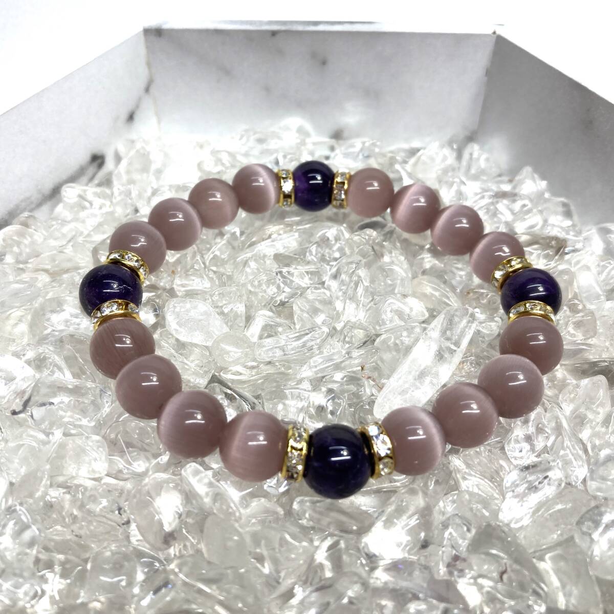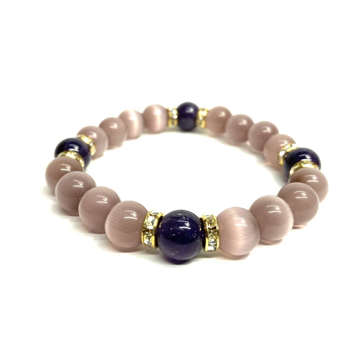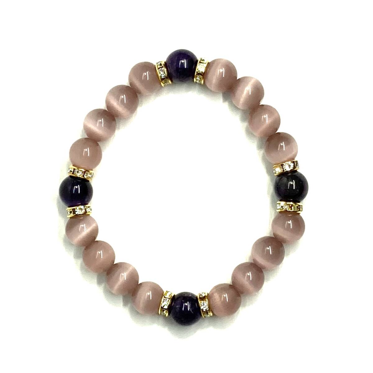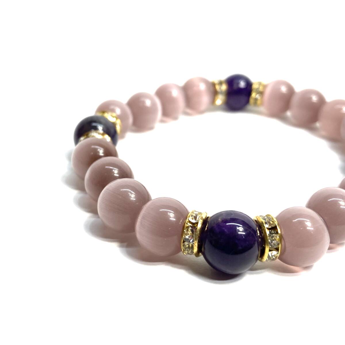 こちらは、キャッツアイとアメジストを組み合わせたブレスレットです。間にはロンデルを挟み高級感あるデザインに仕上がっています。石大きさは腕にも馴染みやすいように10mm玉で内周約17cmです。数に限りがございますので気になる方はお早めにどうぞ。