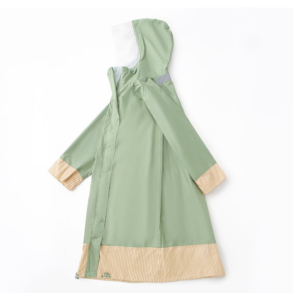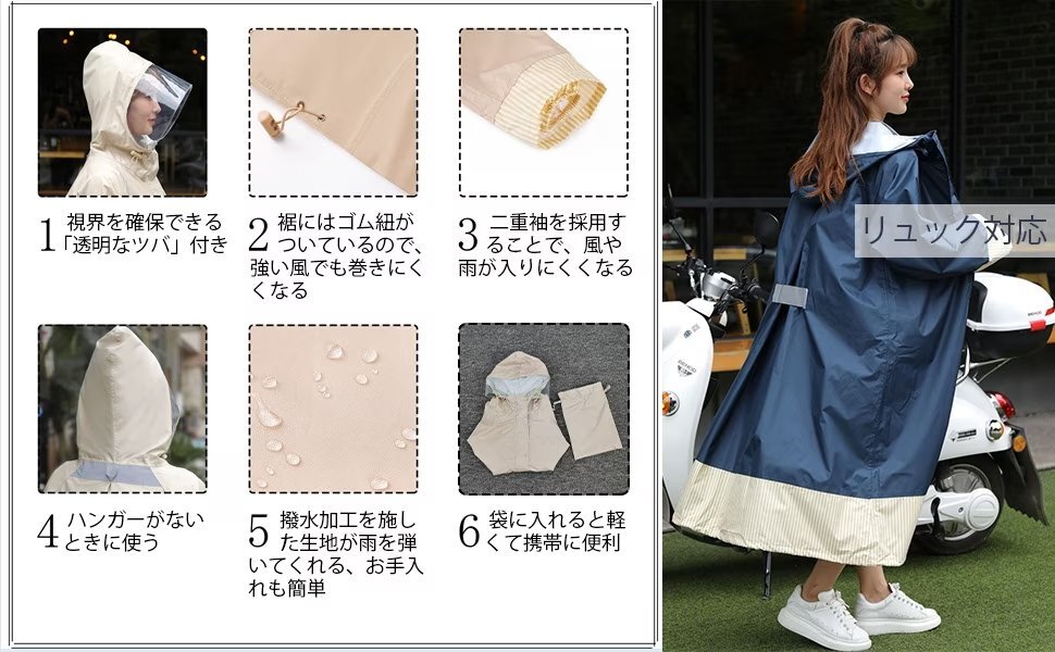 【調節可能と二重袖】裾とフードにはゴム紐がついているので、強い風でも巻きにくくなります。 レインコートの後には幅を調節できるので、体格や衣服の厚さにも対応できます。二重袖を採用することで、風や雨が入りにくくなります。
