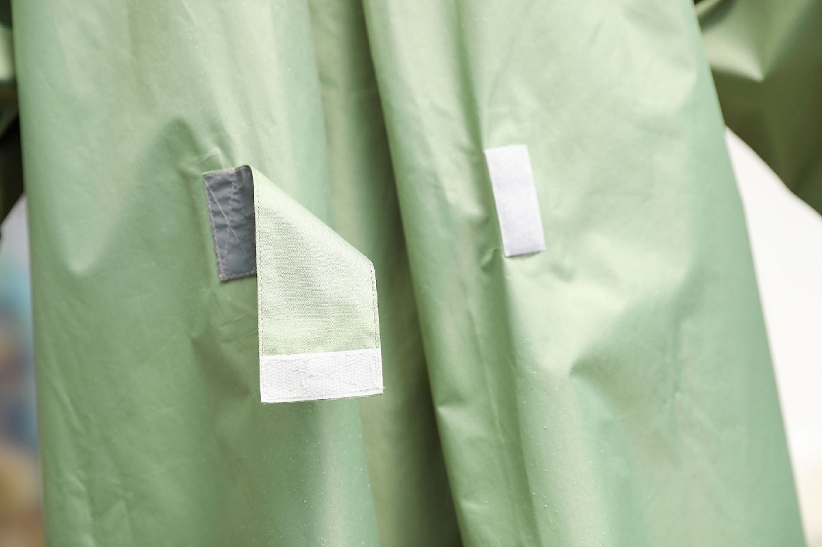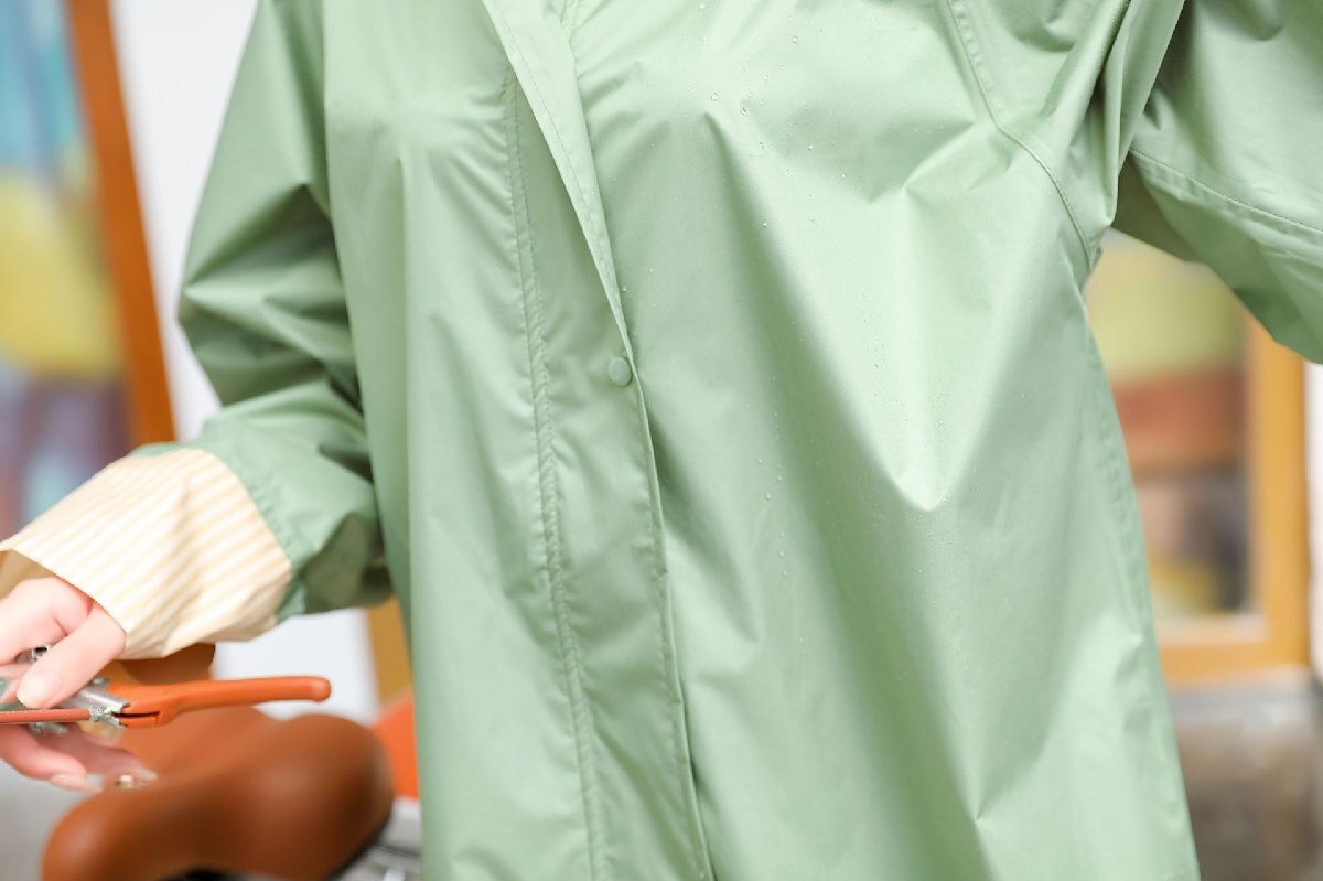 【超撥水性、耐久性】縫目には雨の侵入を防ぐ防水テープを加工します。ファスナー+ボタンの二重デザインで、ファスナーを閉じてボタンをかけることで雨水や風の侵入をしっかり防げるレインコートです。