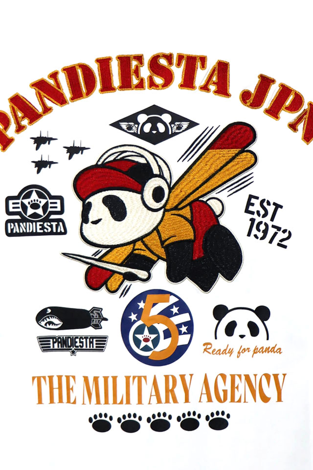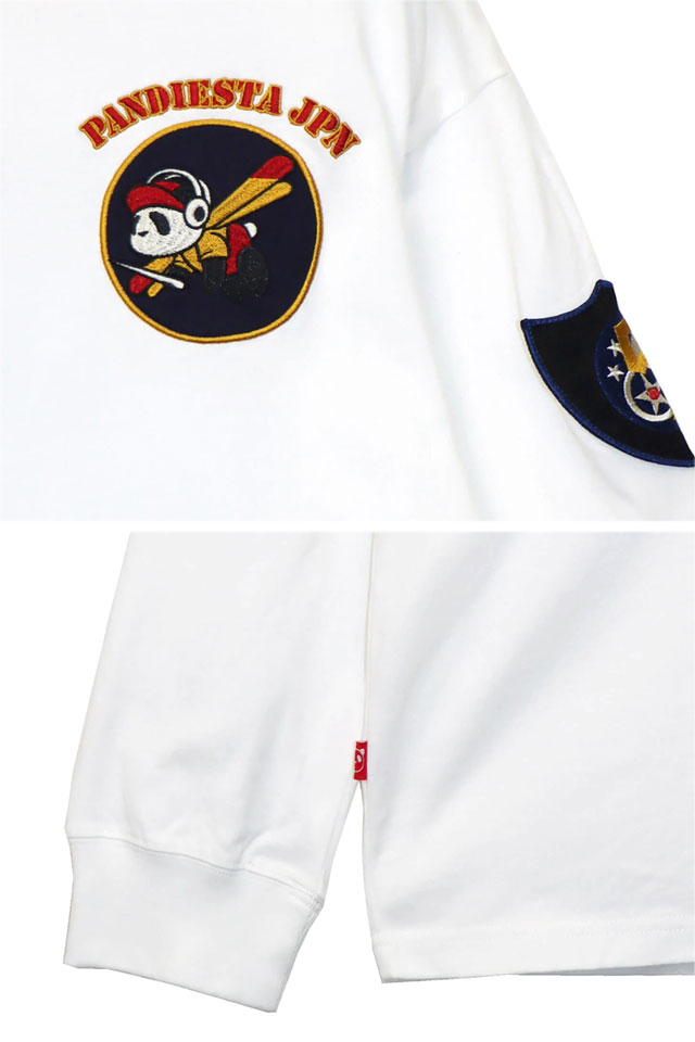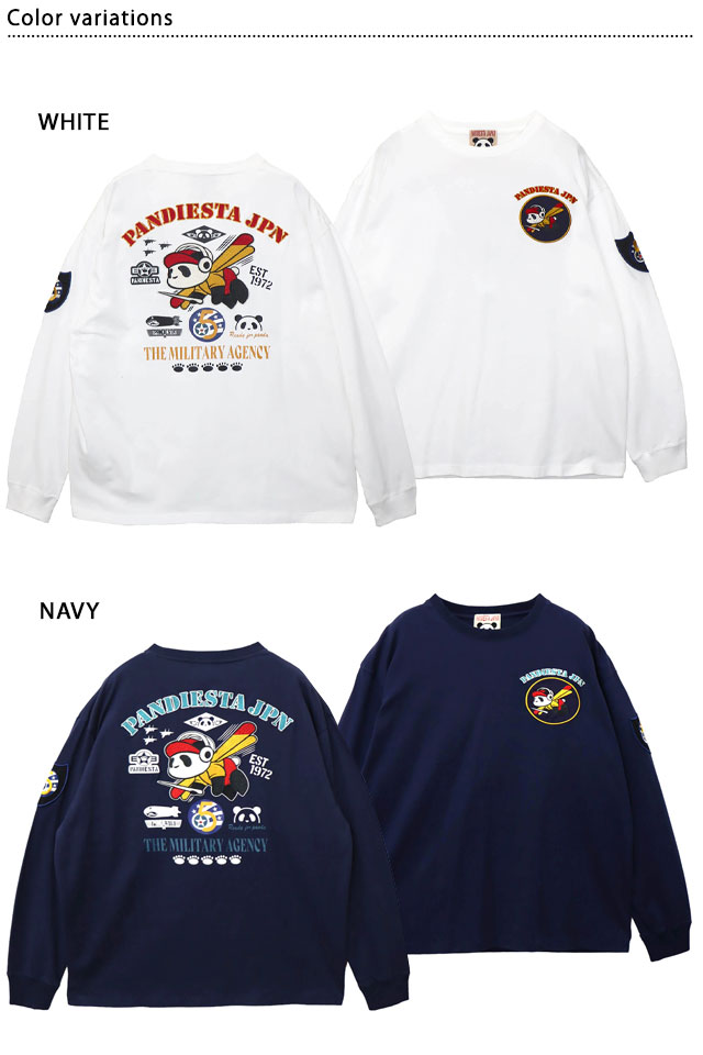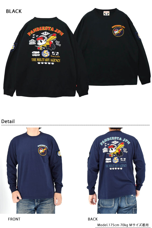 和柄ブランド【錦】の姉妹ブランドとして誕生した、お茶目なパンダをモチーフとした【PANDIESTA JAPAN】より「モスキートパンダロングTシャツ(595853)」のご紹介です。 今や、錦の定番モチーフとなった「錦PANDA」!! 今回は、ベーシックなロングスリーブTシャツが登場しました。 朝鮮戦争で活躍した第6147戦術統制グループは、蚊の如くいつ何処から現れるか予測がつかないため『モスキート』のニックネームを持っていました。 そして、そんな彼らが所属するのは、第5空軍(Fifth Air Force)。 第5空軍は、アメリカ空軍における航空軍の名称で、太平洋空軍の傘下にあり、主に部隊管理を行っています。 現在では、在日米軍における主要空軍部隊となっており、日頃から日本列島を守っているパンディエスタもその部隊に所属するのが…夢? 自らをそのモチーフとしたデザインを用いて、着心地の良いロングスリーブTシャツをデザインしました。 1954年2月、マリリン・モンローが日本へ新婚旅行の途中、米国兵士を慰問に韓国のエアベースを訪れました。 アメリカ空軍は彼女のために駐留部隊のモスキートパッチの付いた専用のフライトジャケットを用意し、大女優の慰問を歓迎したそうです。 日本と関係浅からぬ存在である、『モスキート』。そんな素敵な存在に魅了されたパンディエスタが扮するのは、『MOSQUITO PANDA』。 モスキートパンダは、前後共に刺繍で施されており、それ以外はアップリケとプリントで仕上げています。 中でも、袖部分の肩口に配置された第5空軍ワッペンはミリタリーテイストを演出しています。 ロングスリーブTシャツですので、一枚でのスタイリングはもちろんのこと、ベストやアウターとの相性も良く、幅広いシーズンでお使いいただけます。 | |||||||||||||||||||||||||
