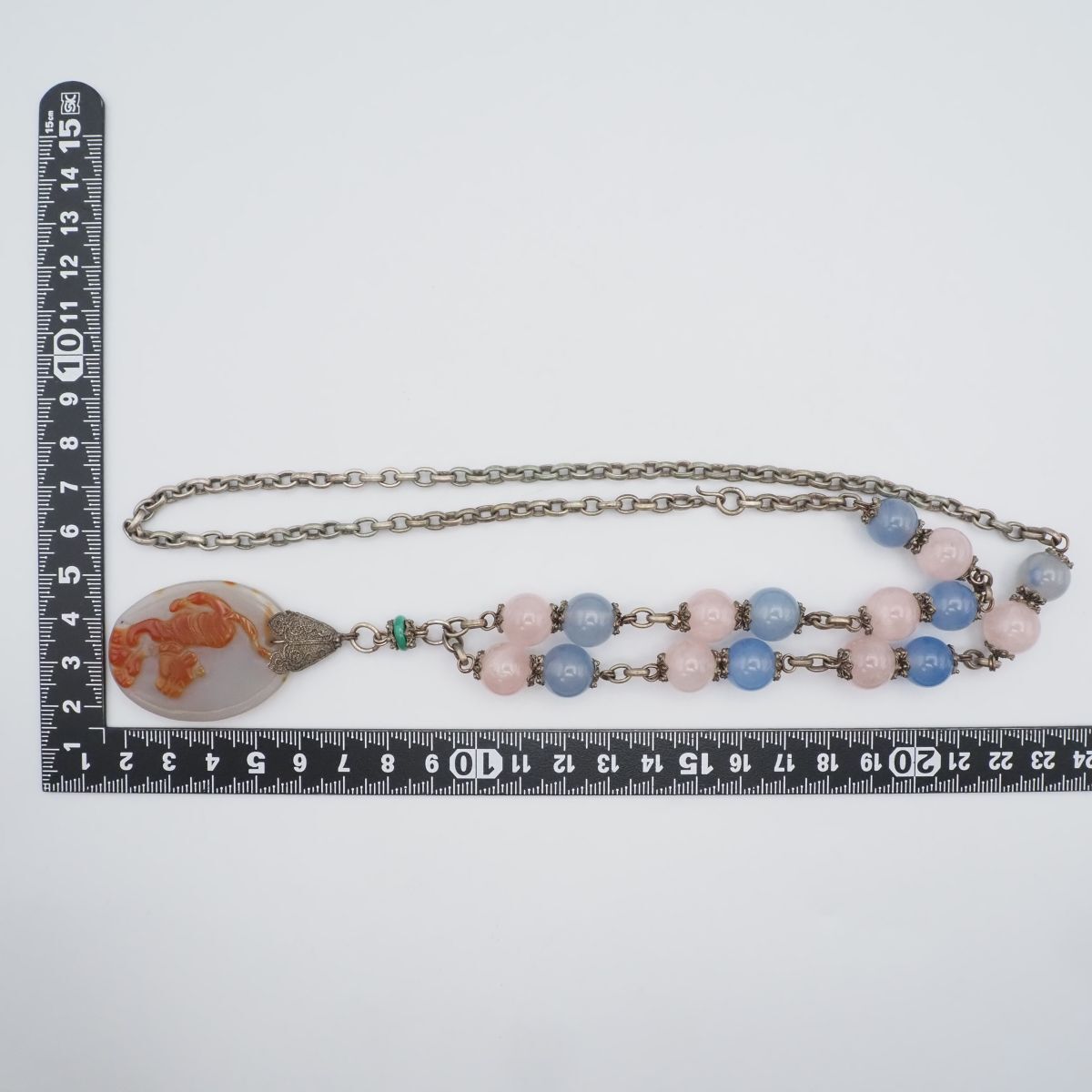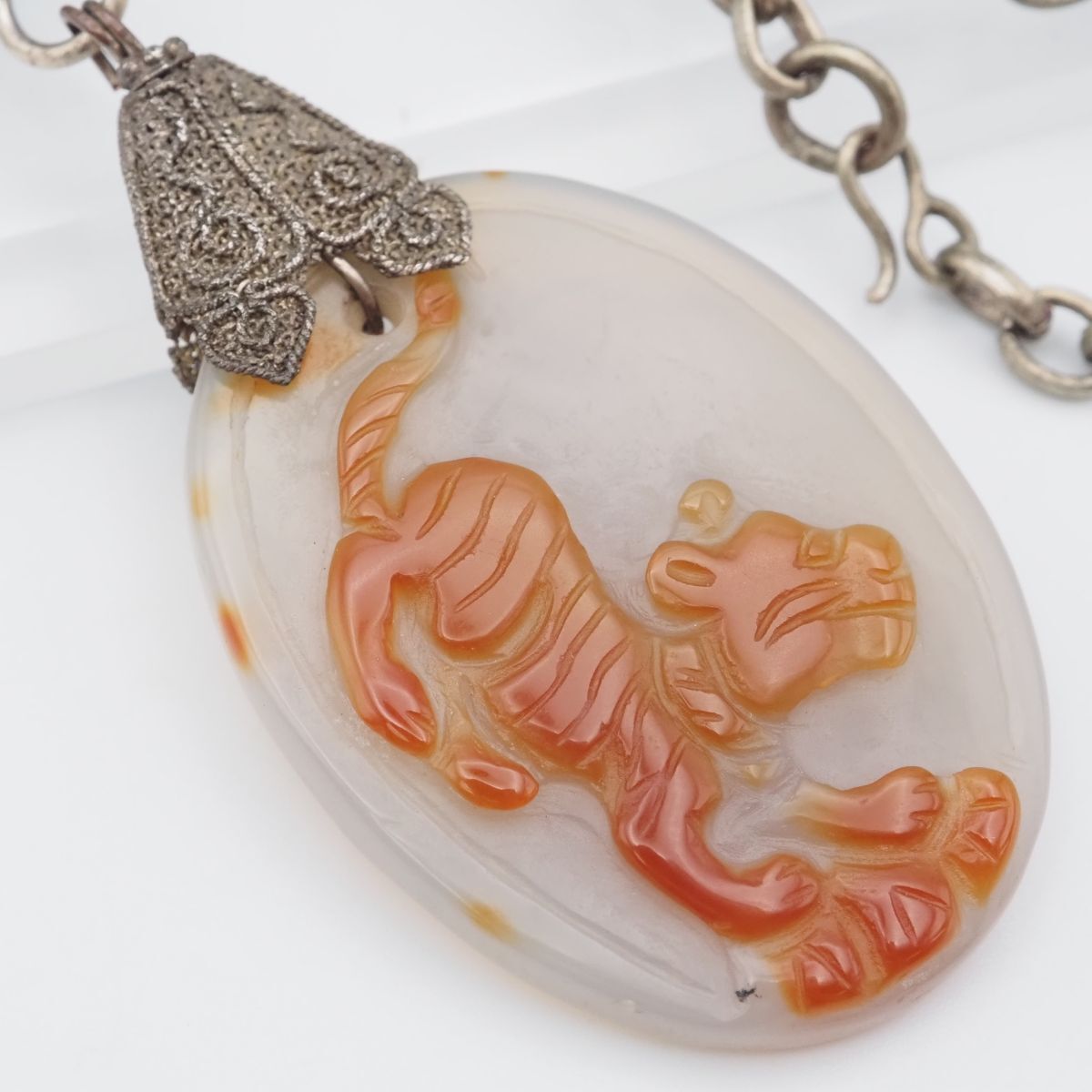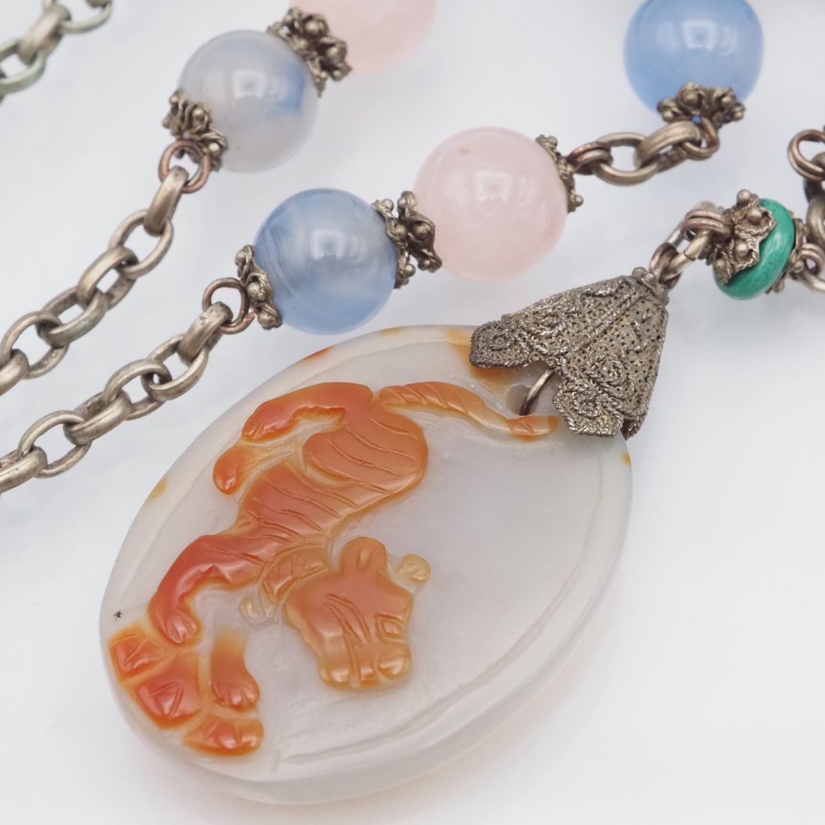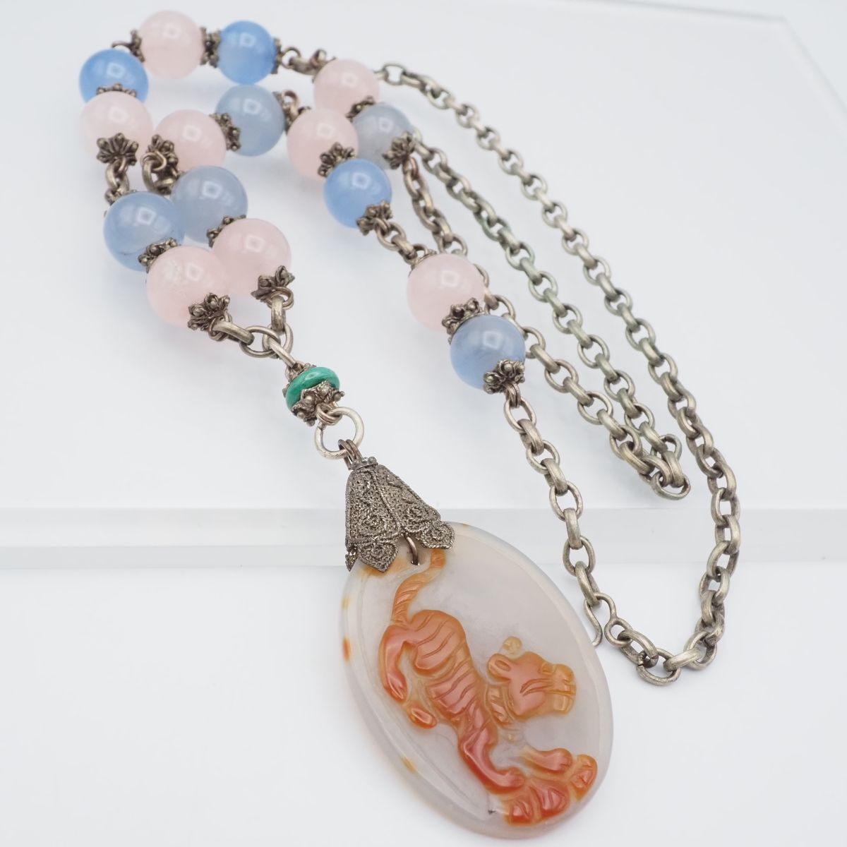 F771 天然石 ローズクォーツ ネックレス 虎彫刻 デザイン アンティーク