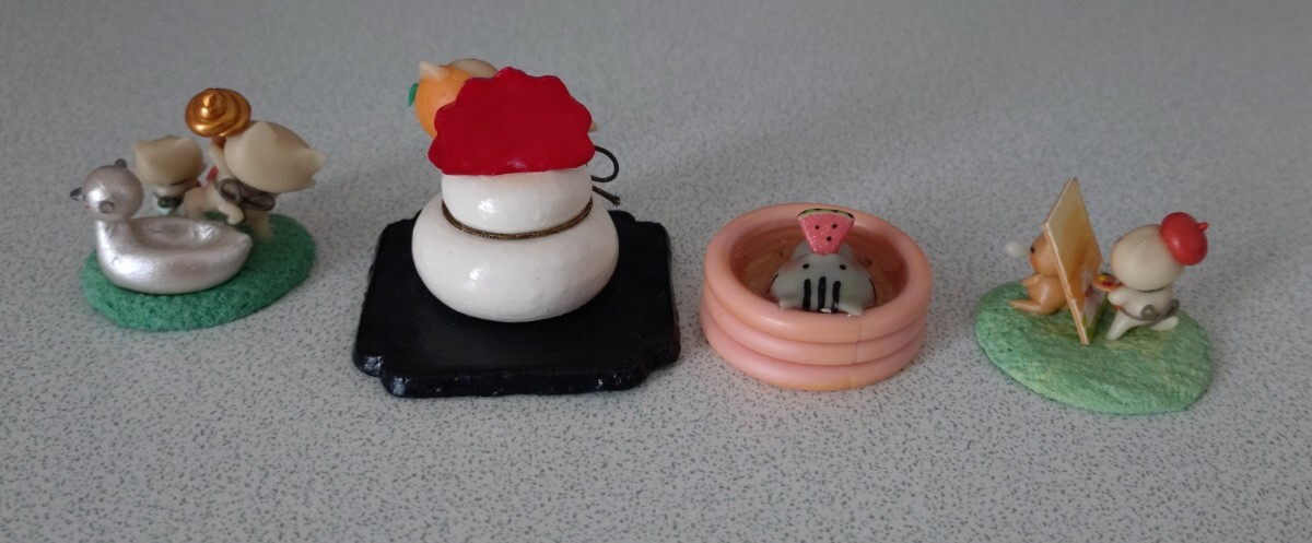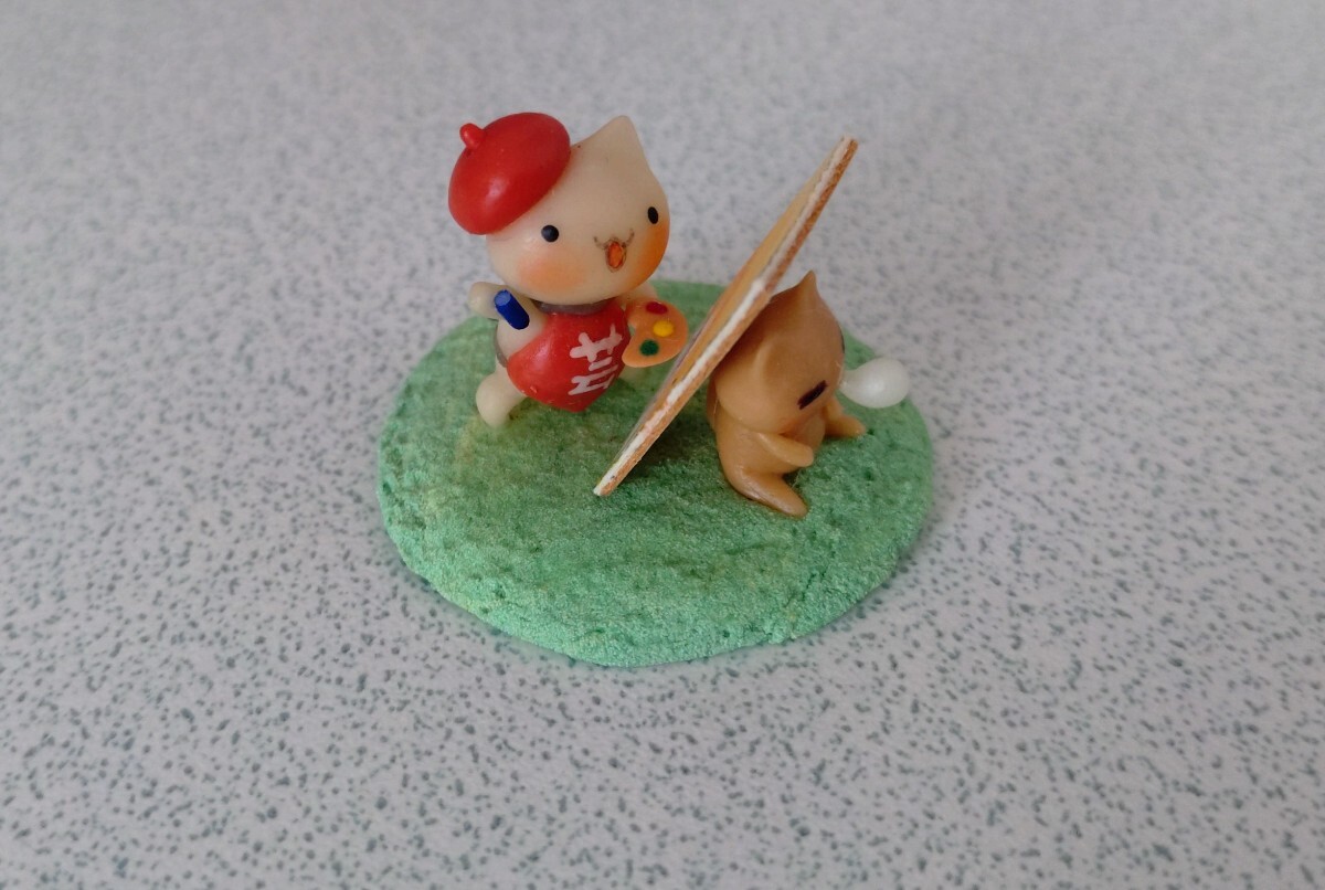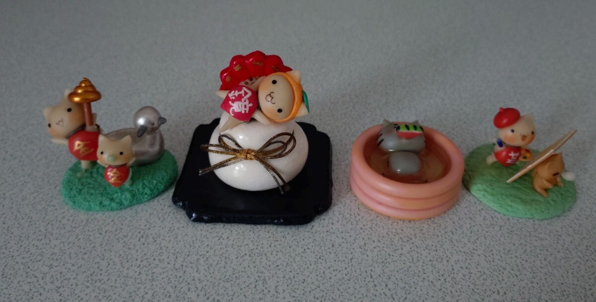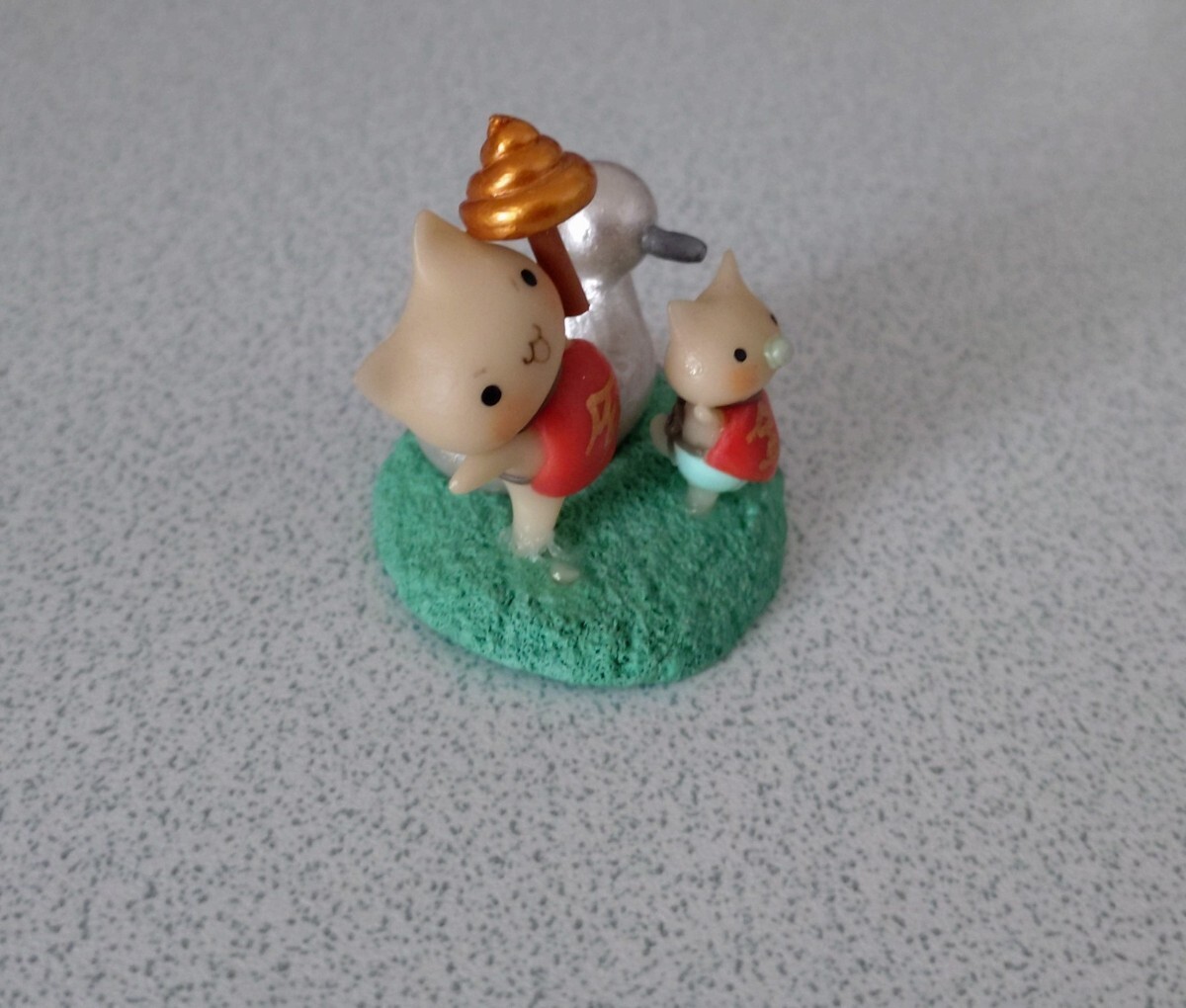 ハンドメイド ミニチュア★樹脂粘土 猫フィギュア (鏡餅、プール、芸術の秋、金のうんち取ったどー) 置物です。