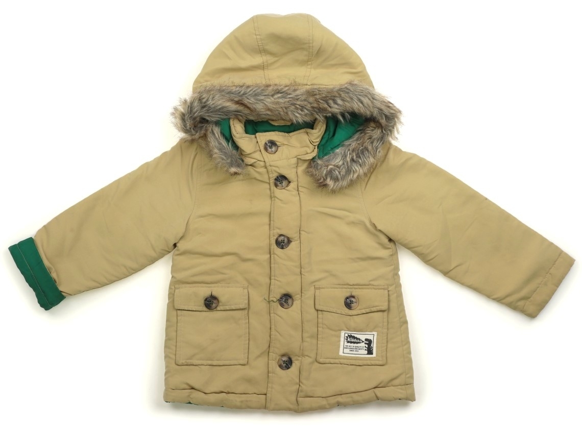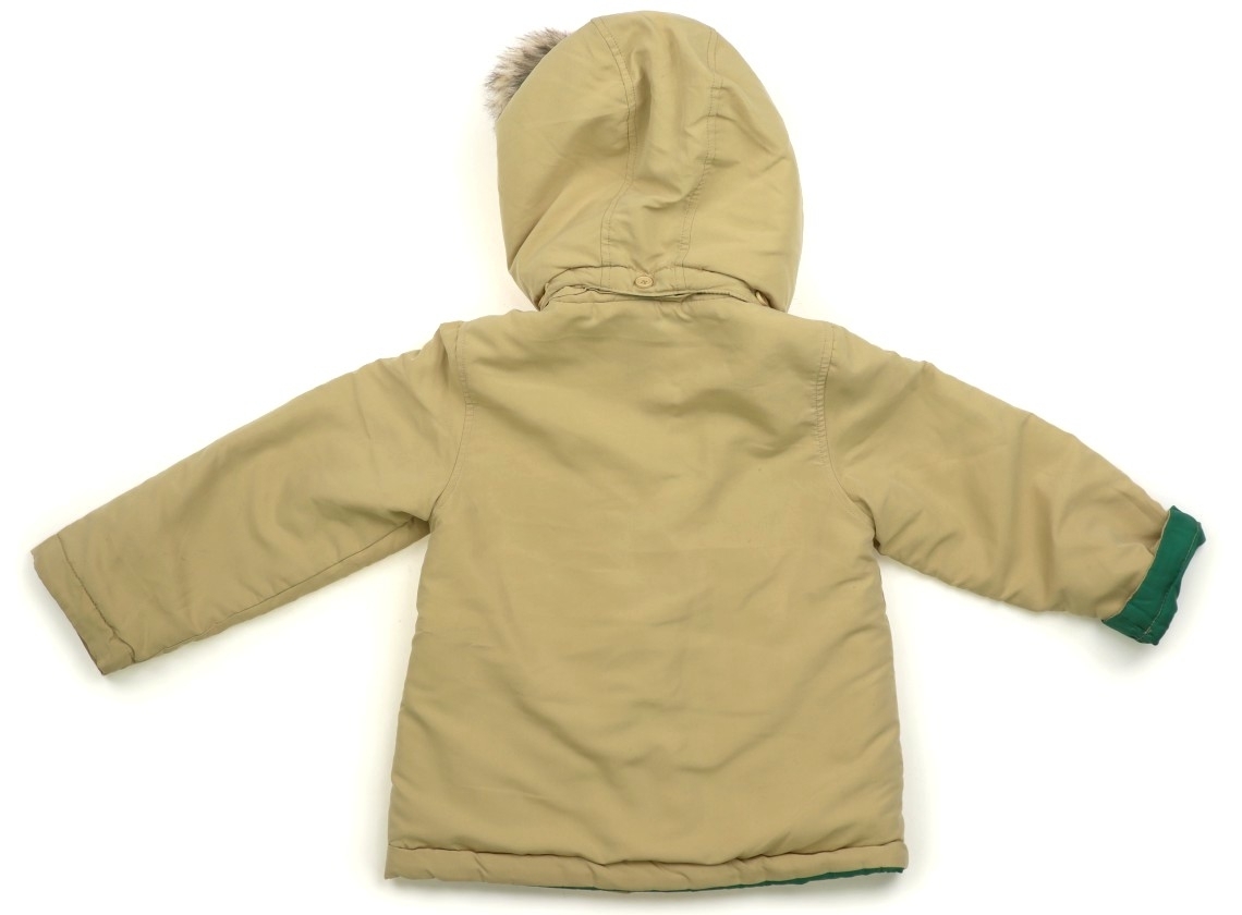 表地・裏地・中綿はポリエステル素材。フェイクファーは縫い付けですが、フードは着脱可能です。前立てにヨレあり。袖口・バスト・前立てに目立つ黒ずみ汚れやシミあり。遊び用等にいかがでしょうか。