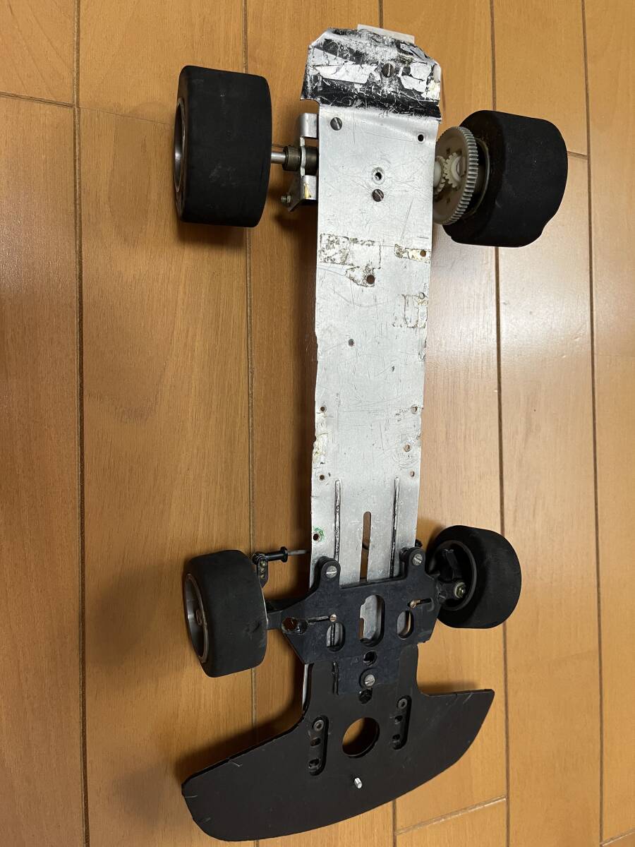 40~50年前に使用していたものです。写真に写っているものが全てです。動作は一切確認していないジャンクで品です。シャーシは一部欠損しています。スポンジタイヤ4本、中空タイヤ(レーシングタイヤ?)4本、540サイズ(?)のモーター、SANWAのプロポ、受信機、サーボ(1つはネジの欠損で底ふたが開いています)、断線したスイッチ(AYK RX1200のもの?)が含まれています。状態をご理解の上、部品取りなどにご検討下さい。
