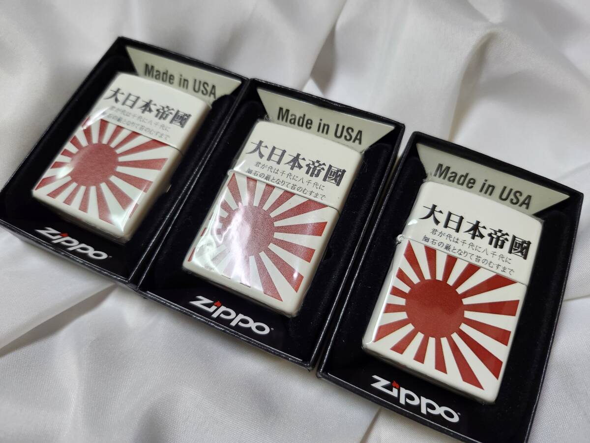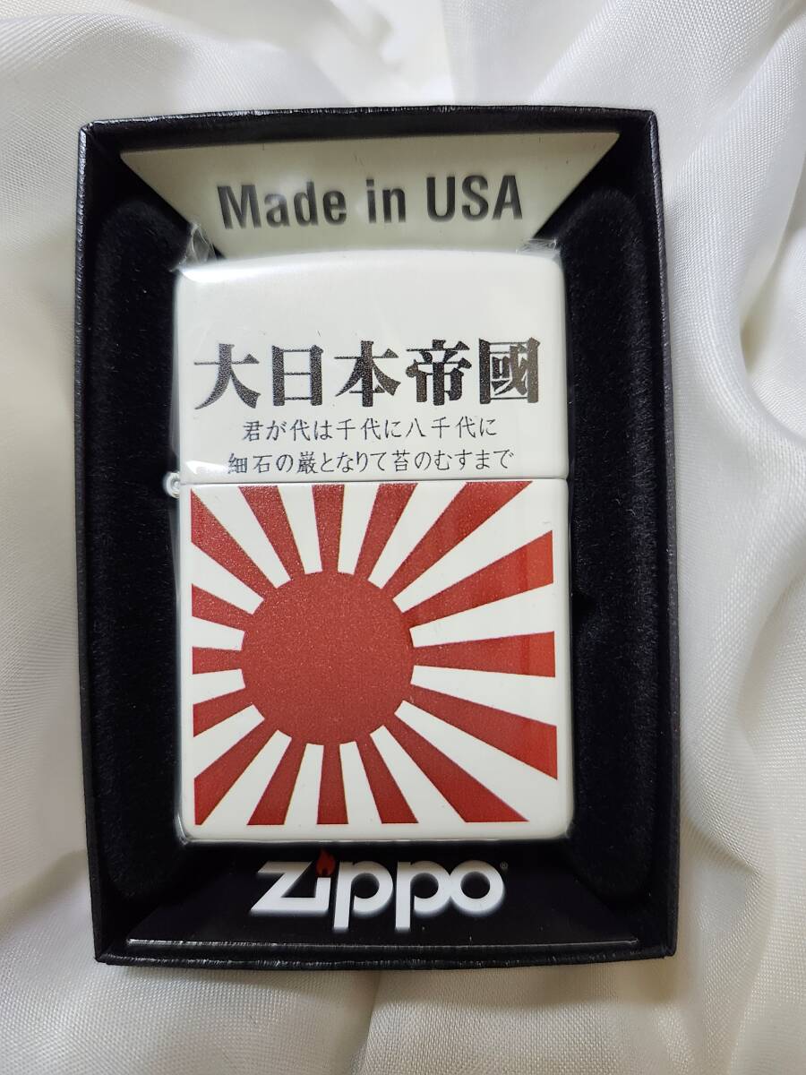 ご覧の通り、かなり尖ったデザインのZippoジッポー正規品です。 同じものは4枚目の写真に写っている3つしか世界中に存在しないレアな逸品です。 もちろん、通販や実店舗でも入手は出来ません。 白地コーティングの本体に、鮮やかな旭日旗とキリっとした「大日本帝國」の文字が良く映えます。 小さな文字は「君が代」の歌詞となっており、愛国心に溢れるデザインとなっています。 紙タバコと日本を愛する方に使っていただきたいです。 世界でたった3個のもので、再販は決してありません。 透明包装袋から取り出してもいないので、指紋すらついていない、まっさらの新品未使用品。 フリント入り。オイルは入っていません。 早い者勝ちです。