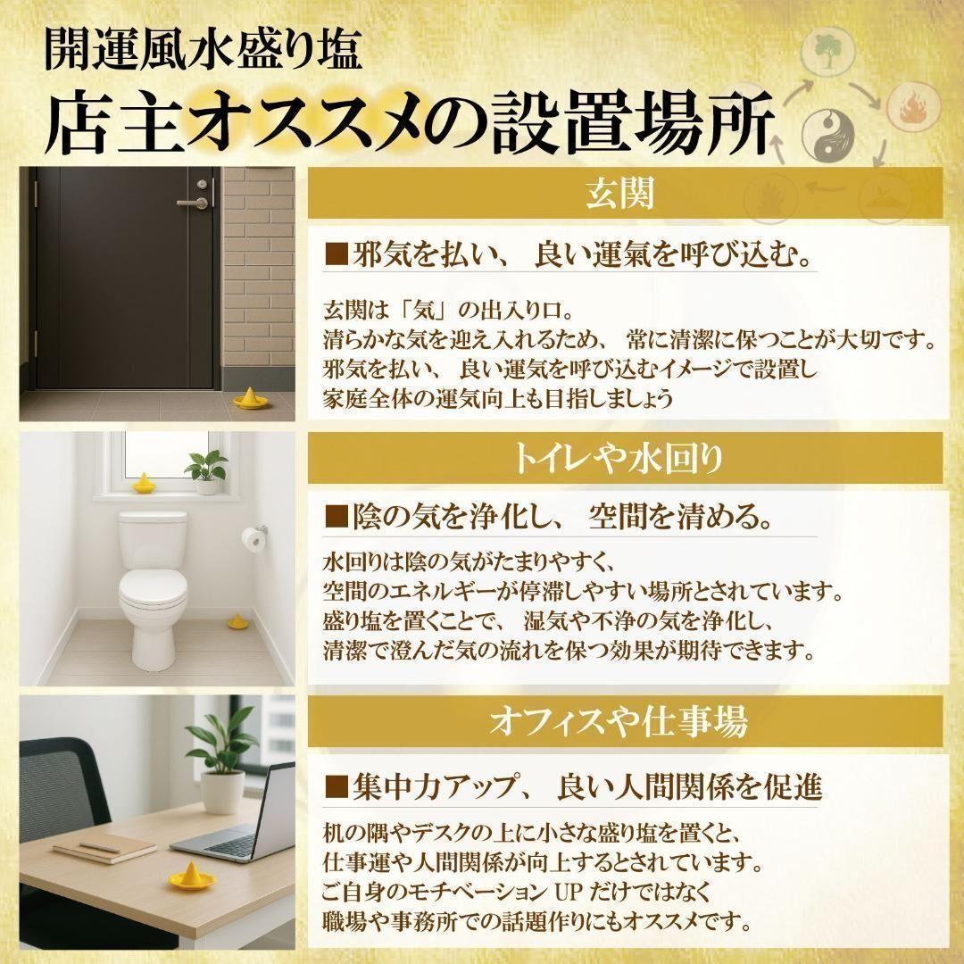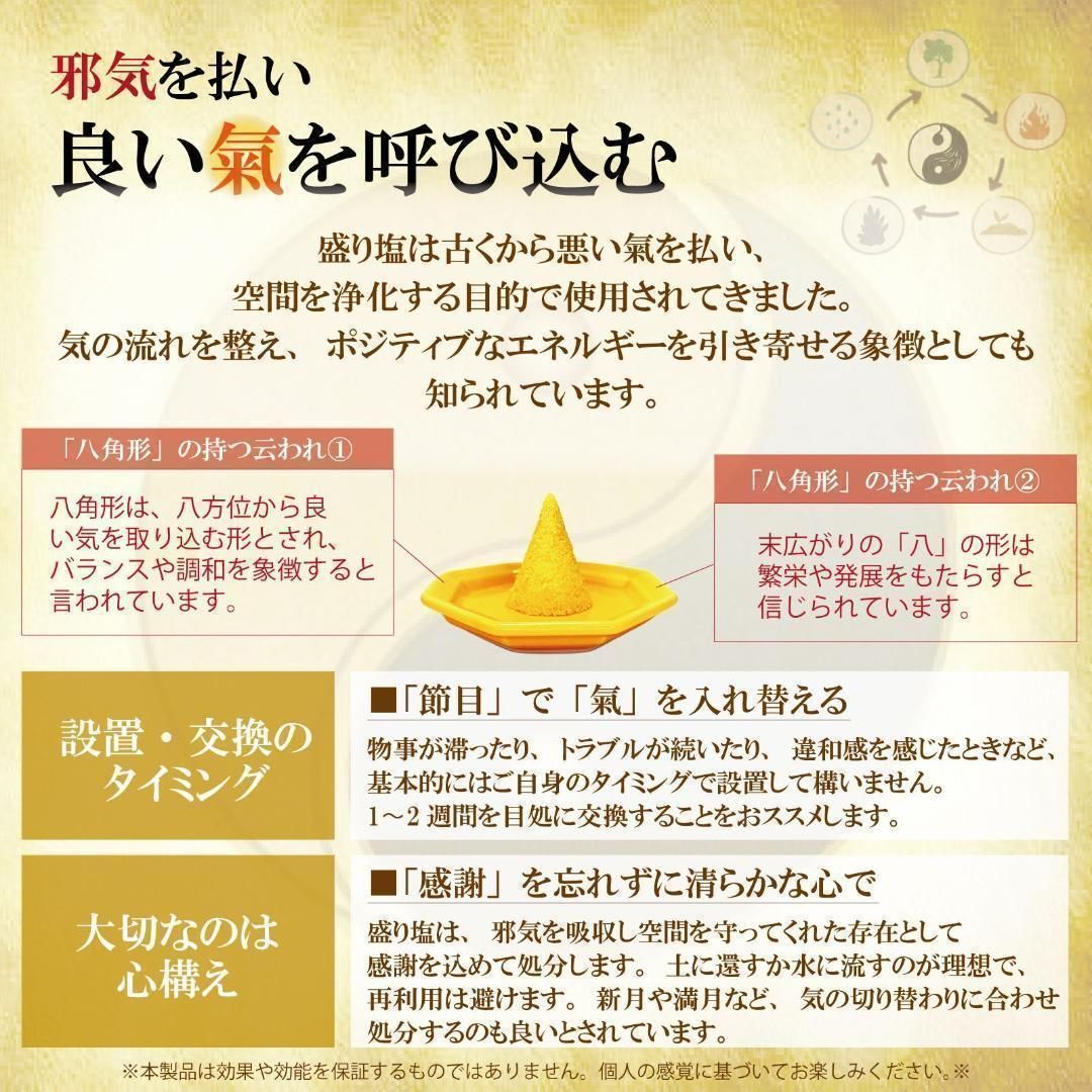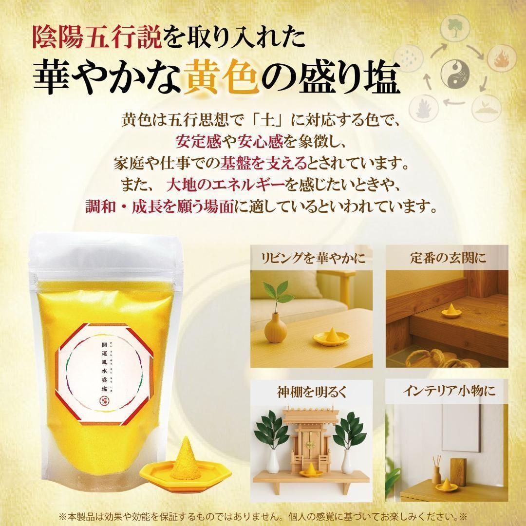 開運を願う方に最適な風水盛り塩セットです。陰陽五行思想に基づく黄色の清めの塩です。盛り塩は気を整え、浄化および厄除けし、良い運気がどんどん流れ込む快適空間の創造をサポートしてくれる象徴であるとされています。