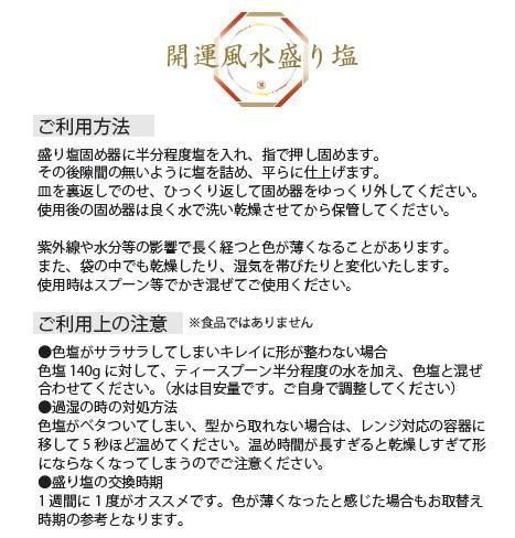 開運風水盛塩は【木の緑、火の赤、土の黄、金の白、水の紫】の5色からなる盛り塩です。