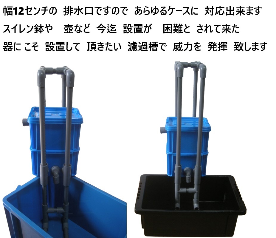 本製品は 「跨がせ式=ケースを選ばない」「沈殿槽BOX=高性能濾過槽」