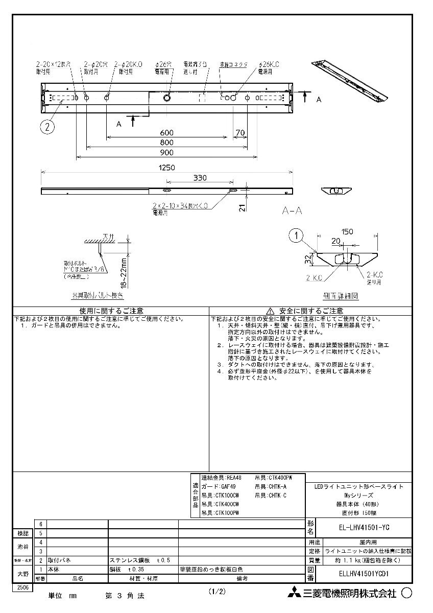 三菱電機 LED照明器具 LEDライトユニット形ベースライト(Myシリーズ) 直付形 150幅 EL-LHV41501-YC 6台セット