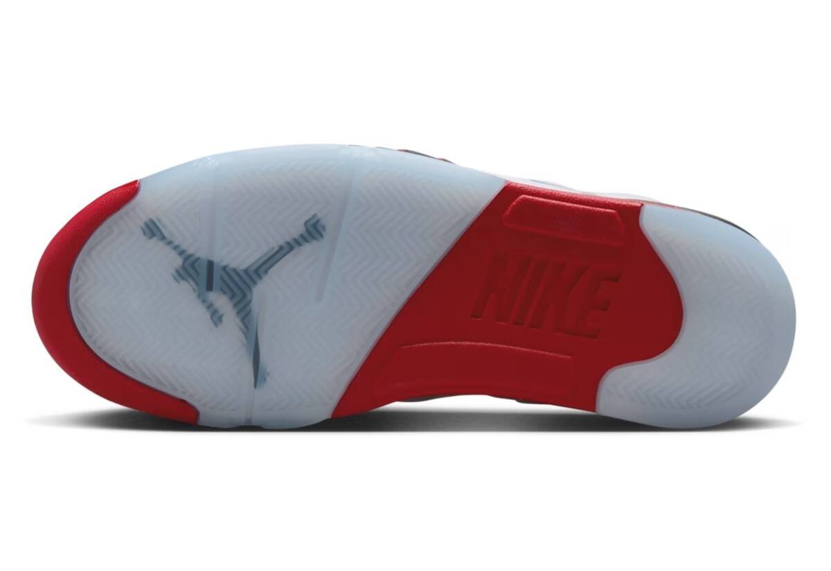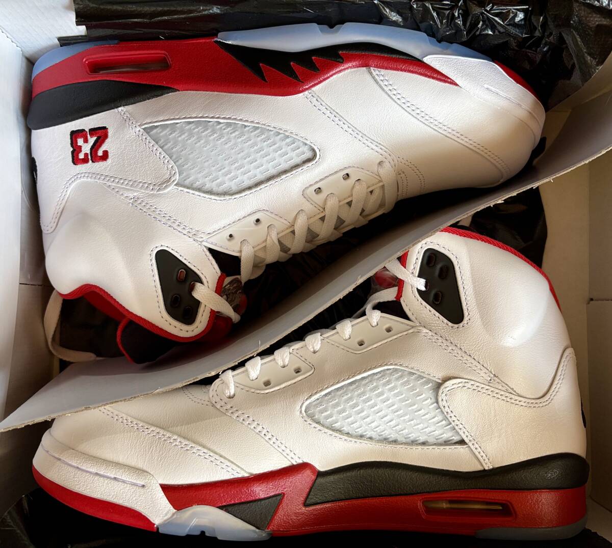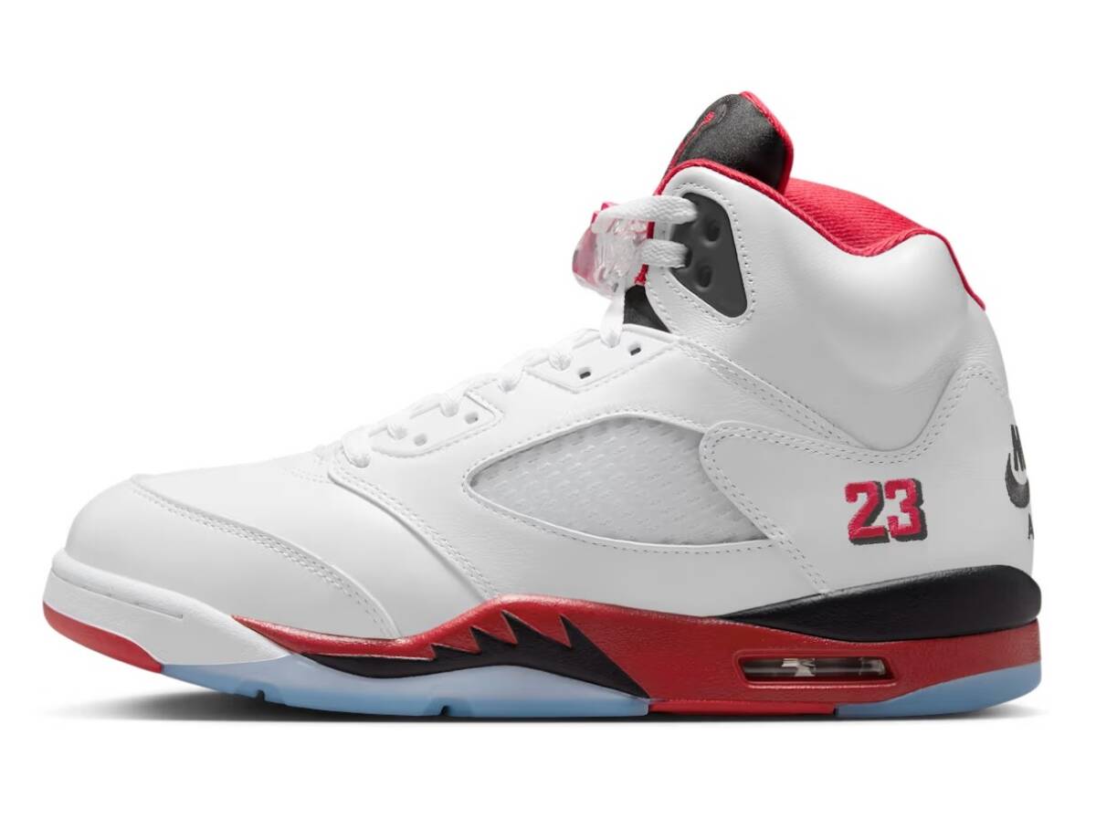 説明:MJの5代目となるシグネチャーシューズの35周年を記念するエア ジョーダン 5 Fire Red "Black Tongue"。