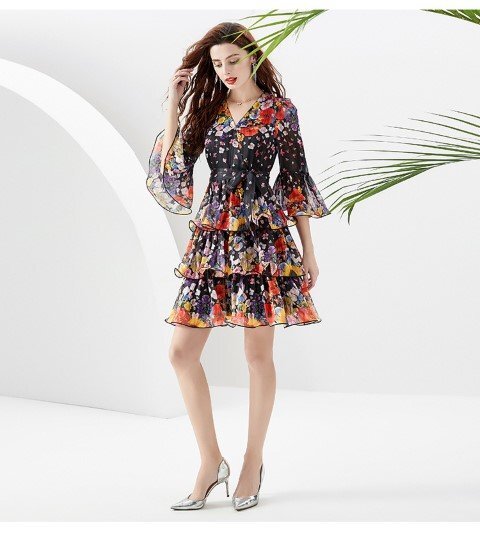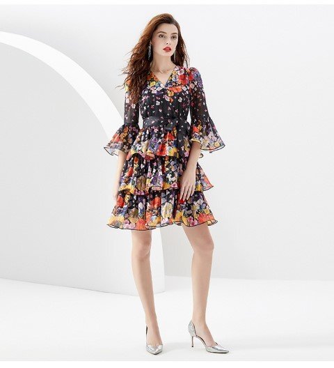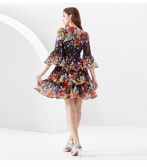 ミニワンピース ショート丈ワンピース フリル 七分袖 プリント柄 花柄 かわいい レディース XL カラフル