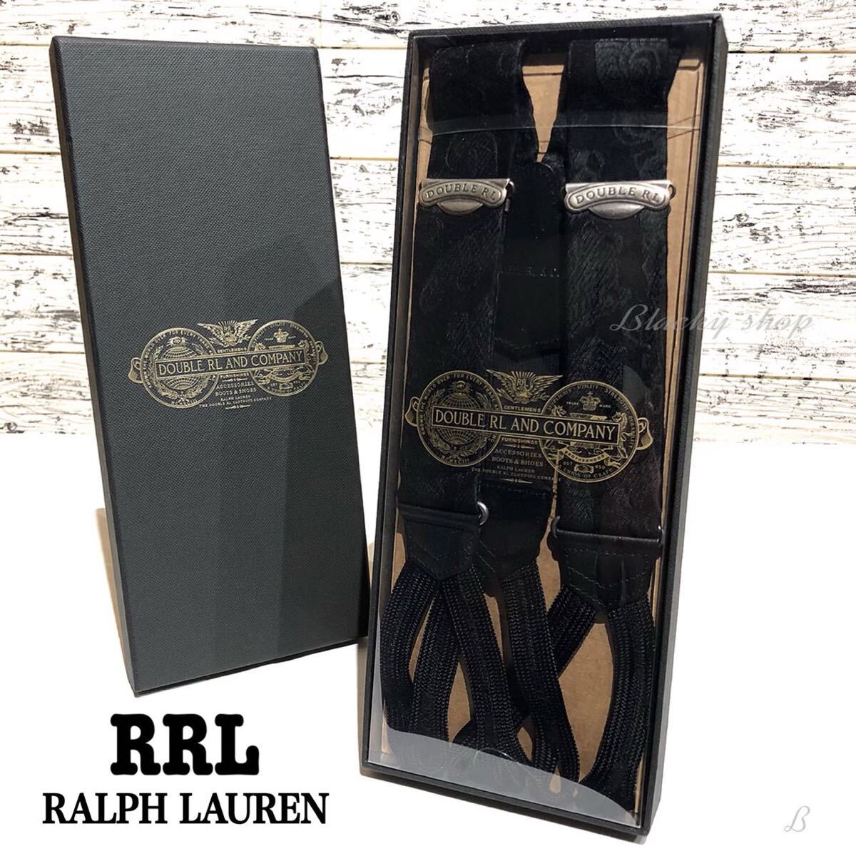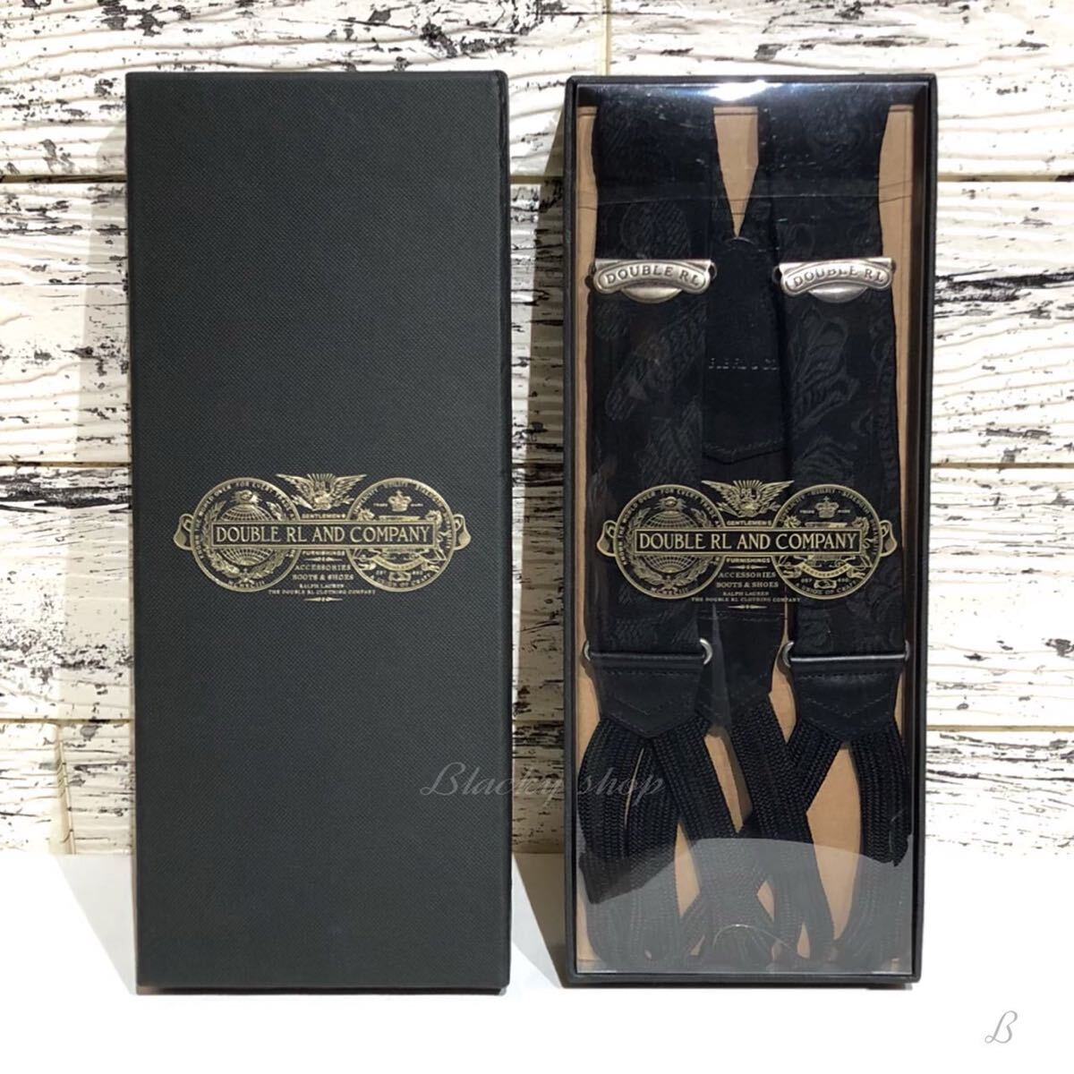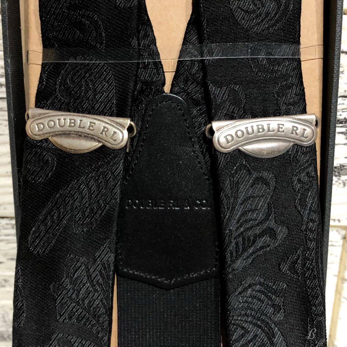 RRL ラルフローレン サスペンダー 未使用 タグ 箱付き ブラック ロゴ ペイズリー 牛革 絹 ブレードエンド ボタン留め レザー 絹 シルク ②