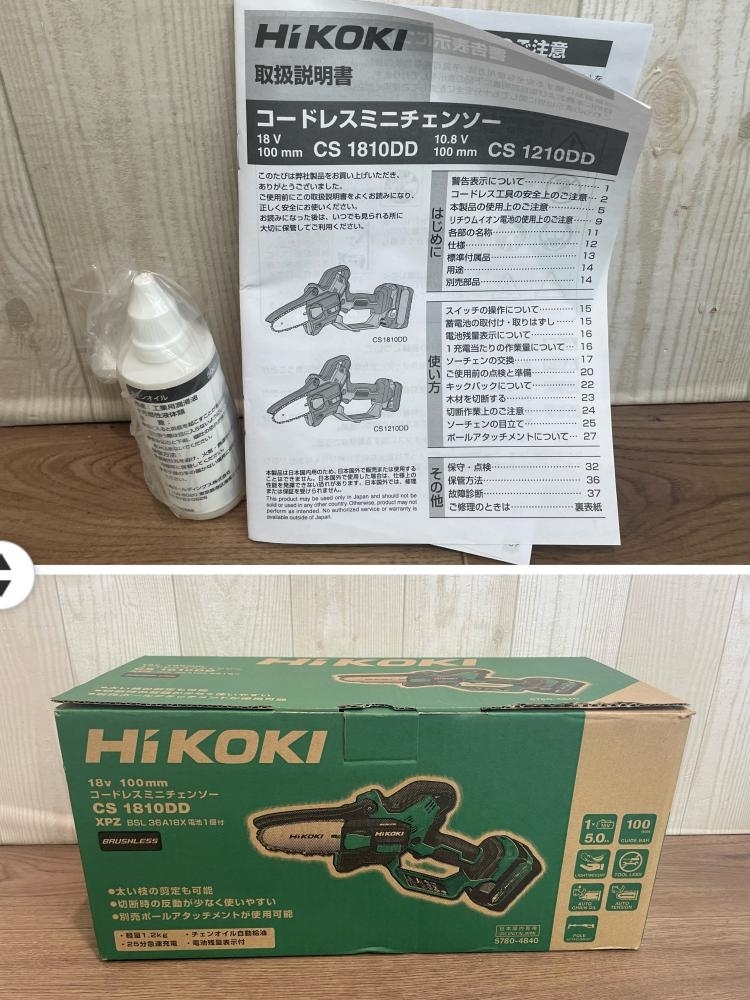 HiKOKI ハイコーキ ■商品名 100㎜コードレスミニチェンソー ■型番 CS1810DD |