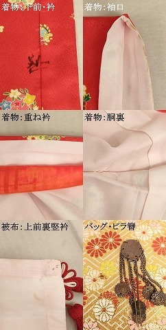 | 着物【化繊】の状態は接写画像のように下前・衿・袖口・重ね衿に汚れ、胴裏に糸解けがございますが その他特に目立ったシミ汚れなどもなく大変良い状態です。 被布【化繊】の状態は接写画像のように上前裏立襟に汚れ・ホック取れがございますが その他特に目立ったシミ汚れなどもなく大変良い状態です。 小物の状態は接写画像のようにバッグ・びら簪に汚れがございますが その他特に目立ったシミ汚れなどもなく大変良い状態です。 大変上質な逸品になります。 お安く出品致しますので、是非この機会にいかがでしょうか? ※箱に傷み・汚れがございます。