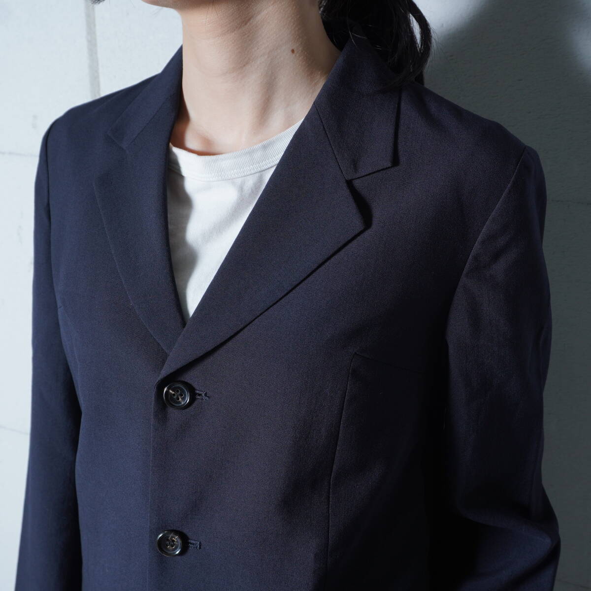 ・洗練されたデザインが魅力的なダークネイビーのテーラードジャケット