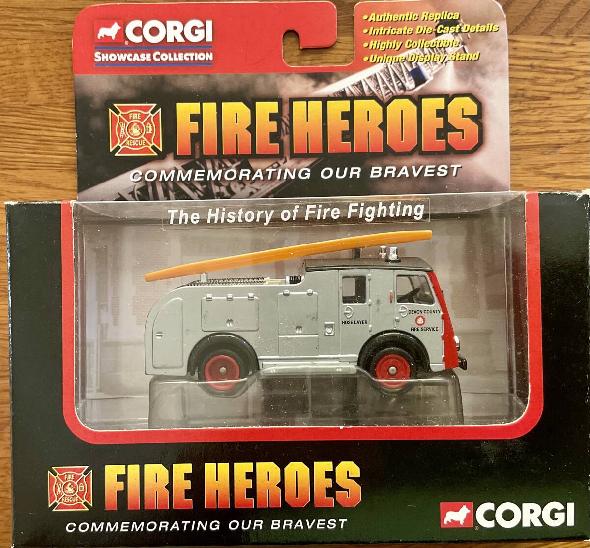 Corgi Showcase Collectionの「Heroes Under Fire」シリーズのデボン州消防局のホースレイヤー消防車を再現したダイキャストモデルです。