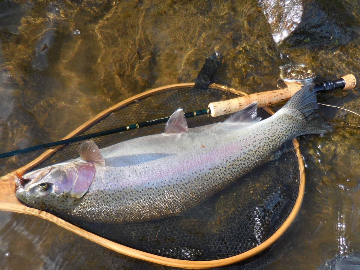 以前別な本流で大型のウグイばかり掛かり、不安で少々使用を控えていましたが今回再度試してみることに。別なフライで釣果があるなか、当フライに替えたところリトリーブ中に根掛かりのようなアタリで掛かったのは56cmのニジマスです。その後、30cmクラスも掛かりニジマスにも十分通用するようです。