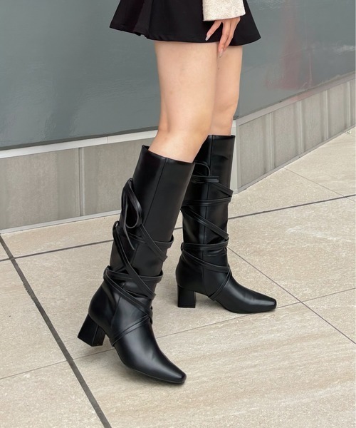 キーワード:ブーツ レディース チャンキーヒール ヒール ロング 紐 秋 冬