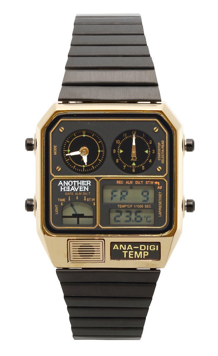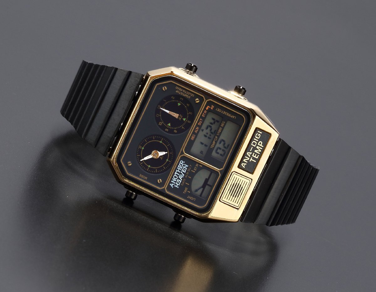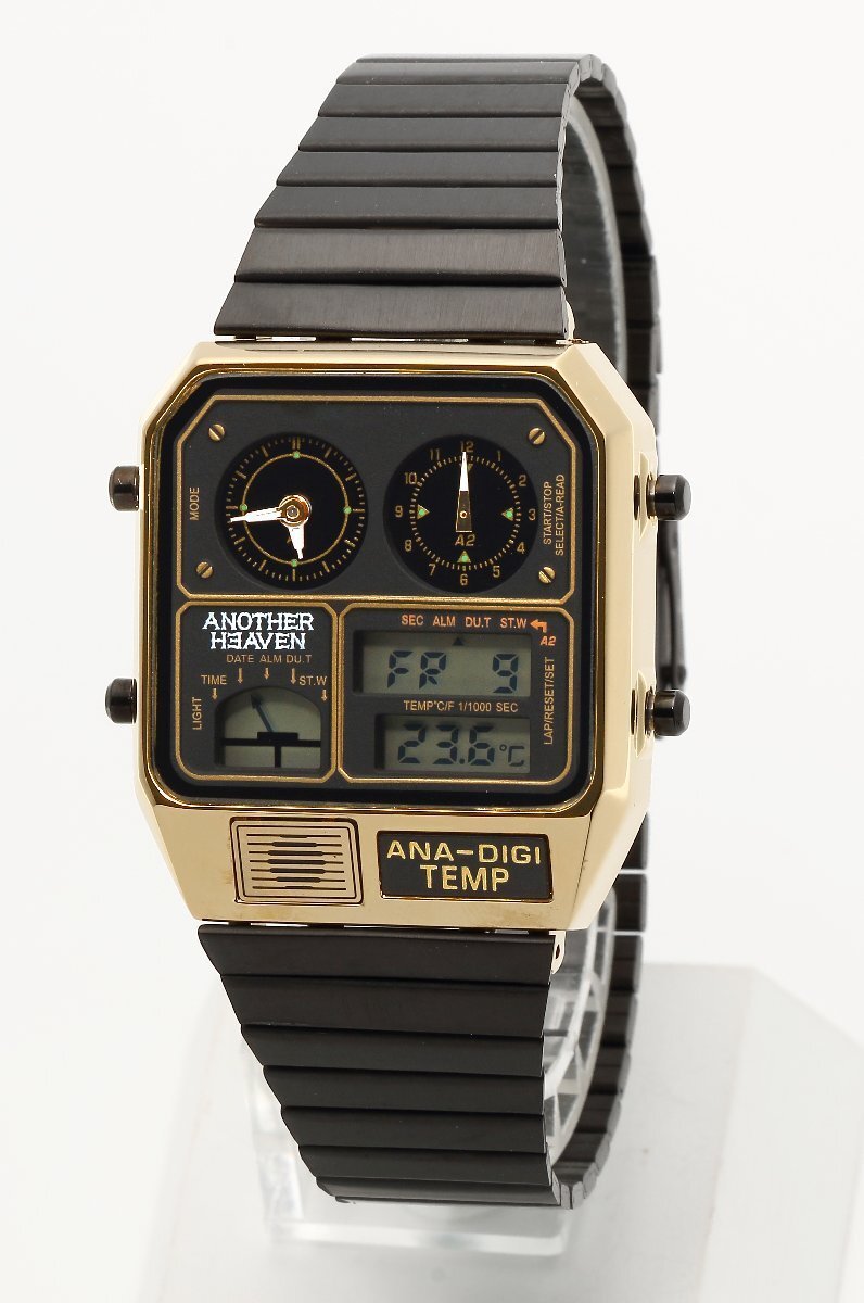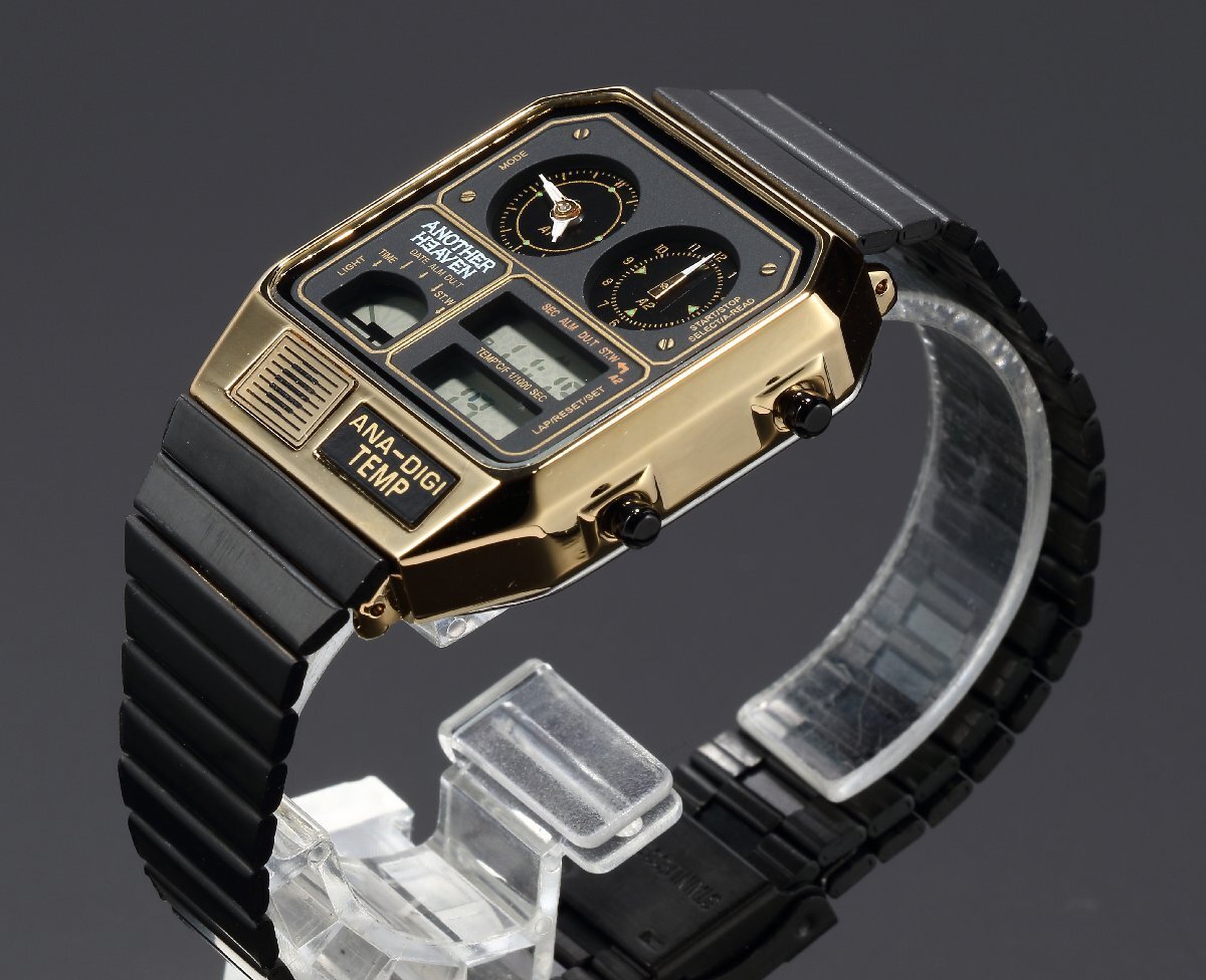 1980年代に登場し、当時大ヒットモデルとなったアナデジテンプ。アナログとデジタルを組み合わせたメカニックなデザインだけでなくクロノグラフやアラーム、 温度計、カレンダーなど機能性も抜群。当時、時刻を表示するだけでなく、温度を測るセンサー機能を時計に盛り込み「ニューサイエンス」 の分野を切り拓いたといわれた話題のモデルの再登場。レトロフィューチャー好きにはたまらない時計です。 ↓下記日本語説明書になりますのでご利用下さい。 日本語説明書 ブランド:Another Heaven 素材:ケースステンレススチール 素材:ベルトステンレススチール(スライド式) 風防クリスタルガラス サイズ(縦×横×厚)約35.5×31.5×8mm かん幅約18mm ベルト腕周り約13.5-20cm 重さ約53g 仕様日常生活用防水 精度:平均月差±15秒 クロノグラフ(1/1000秒・12時間計) 日付・曜日表示 日付早修正機能 12/24時間表示切替機能 デュアルタイム機能 カレンダー月末無修正機能 電池寿命切れ予告機能 温度計 アラーム 時報 ライト ※環境問題への取り組みの一環として、取扱説明書は電子化となりました。 |