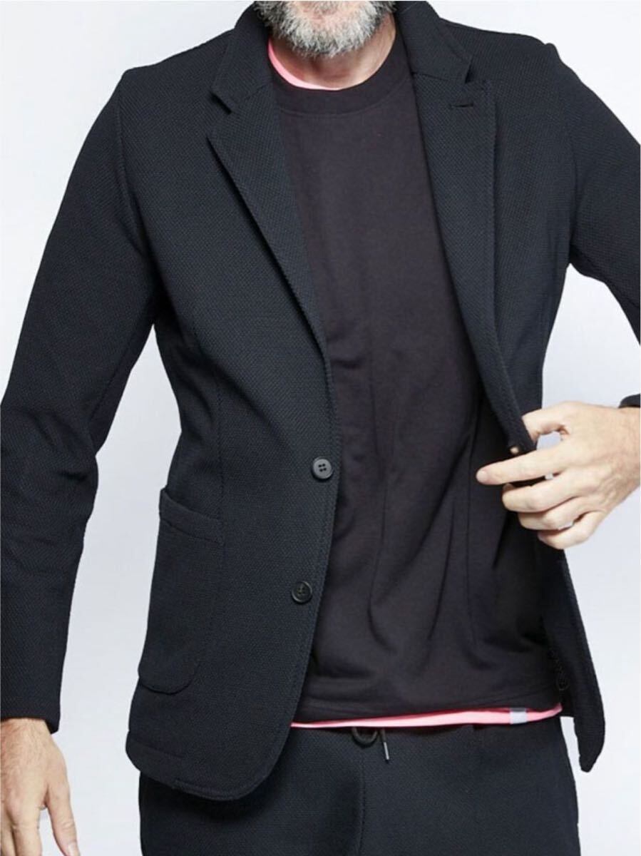ニットながら、着るととても柔らかく高度の伸縮性があるものの、しっかりした張りがある事で、ジャケットのラペルにも張りがああり、ニットジャケットらしからぬ表情に仕上がっている。